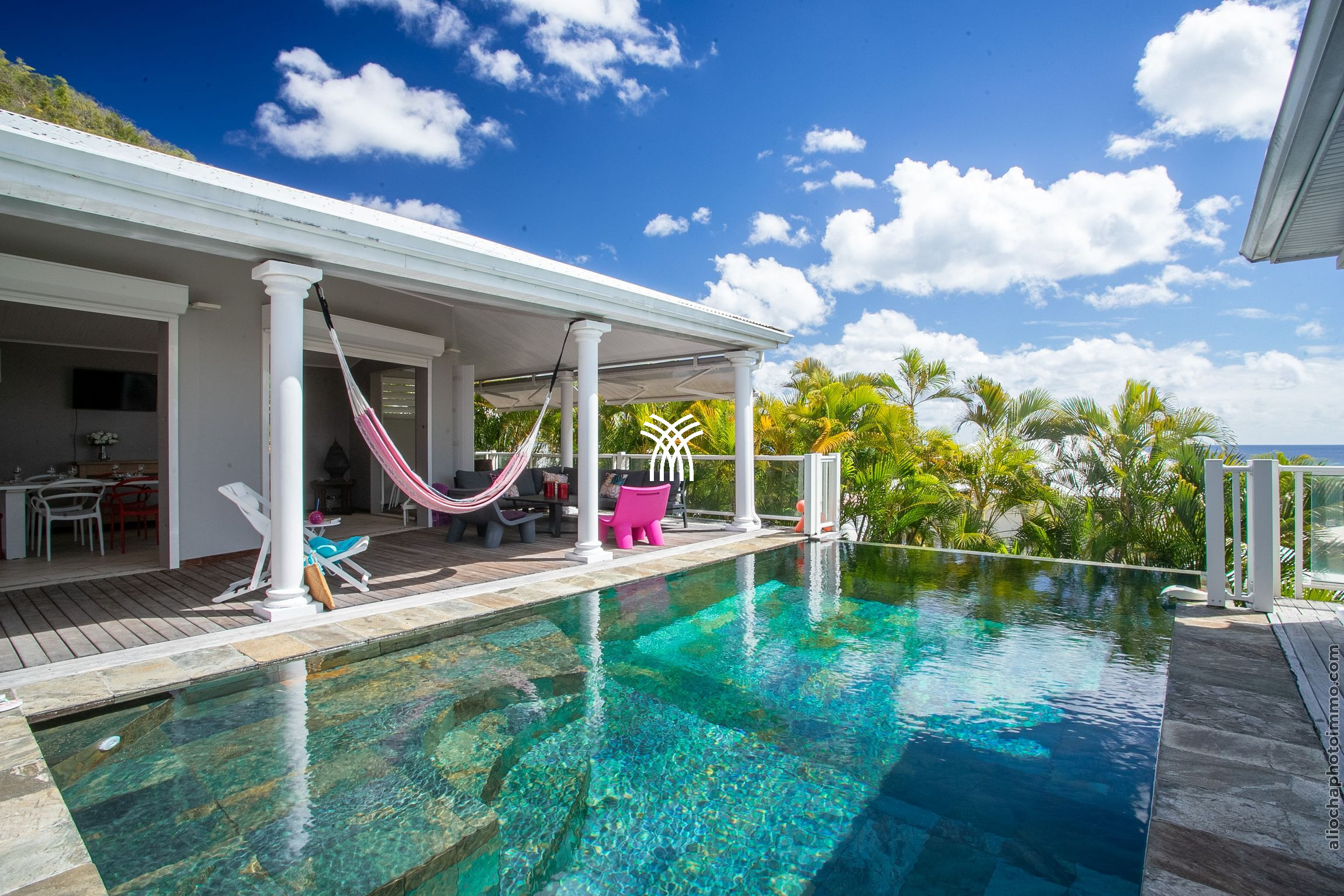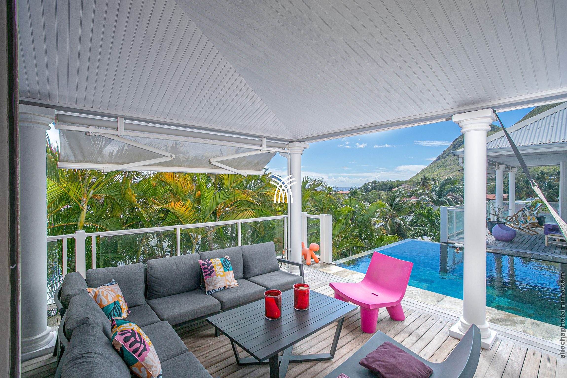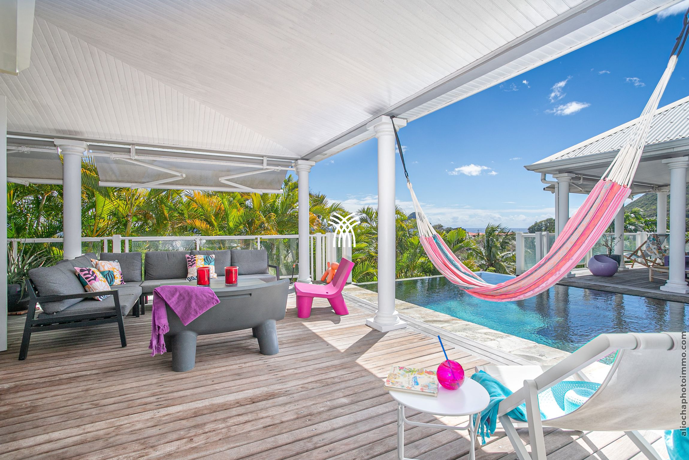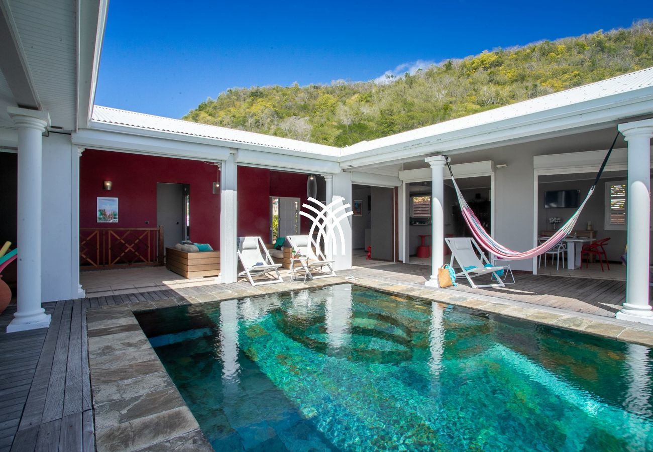 La terrasse, véritable pièce à vivre, s'anime au rythme caribéen. Profitez d'une vue imprenable sur la mer et son kaléidoscope de couleurs tout au long de la journée. La villa dispose également d'une piscine et d'un deck aménagé avec des transats, parfaits pour se prélasser dans ce cadre de rêve.
