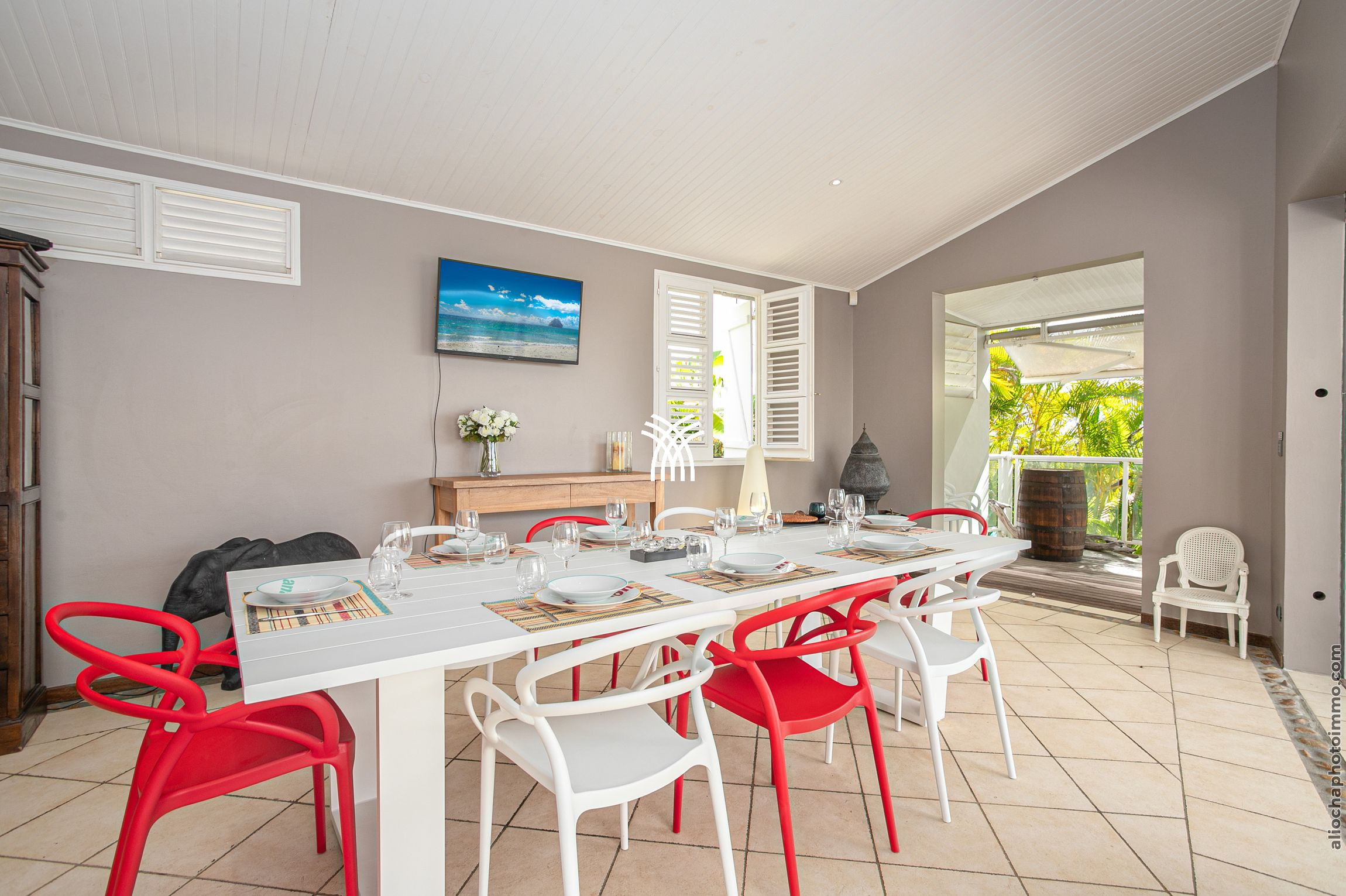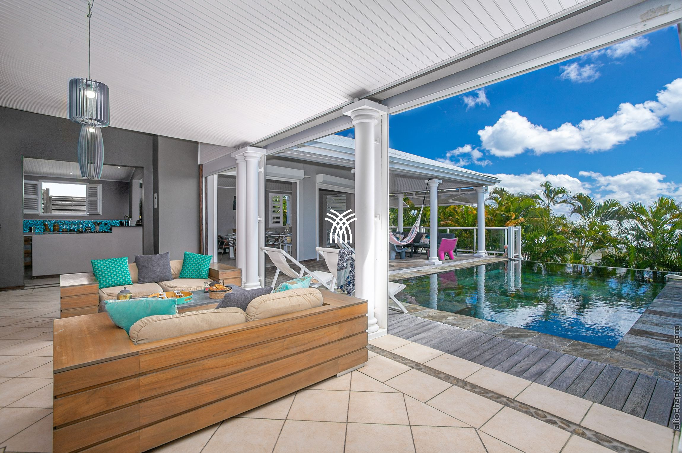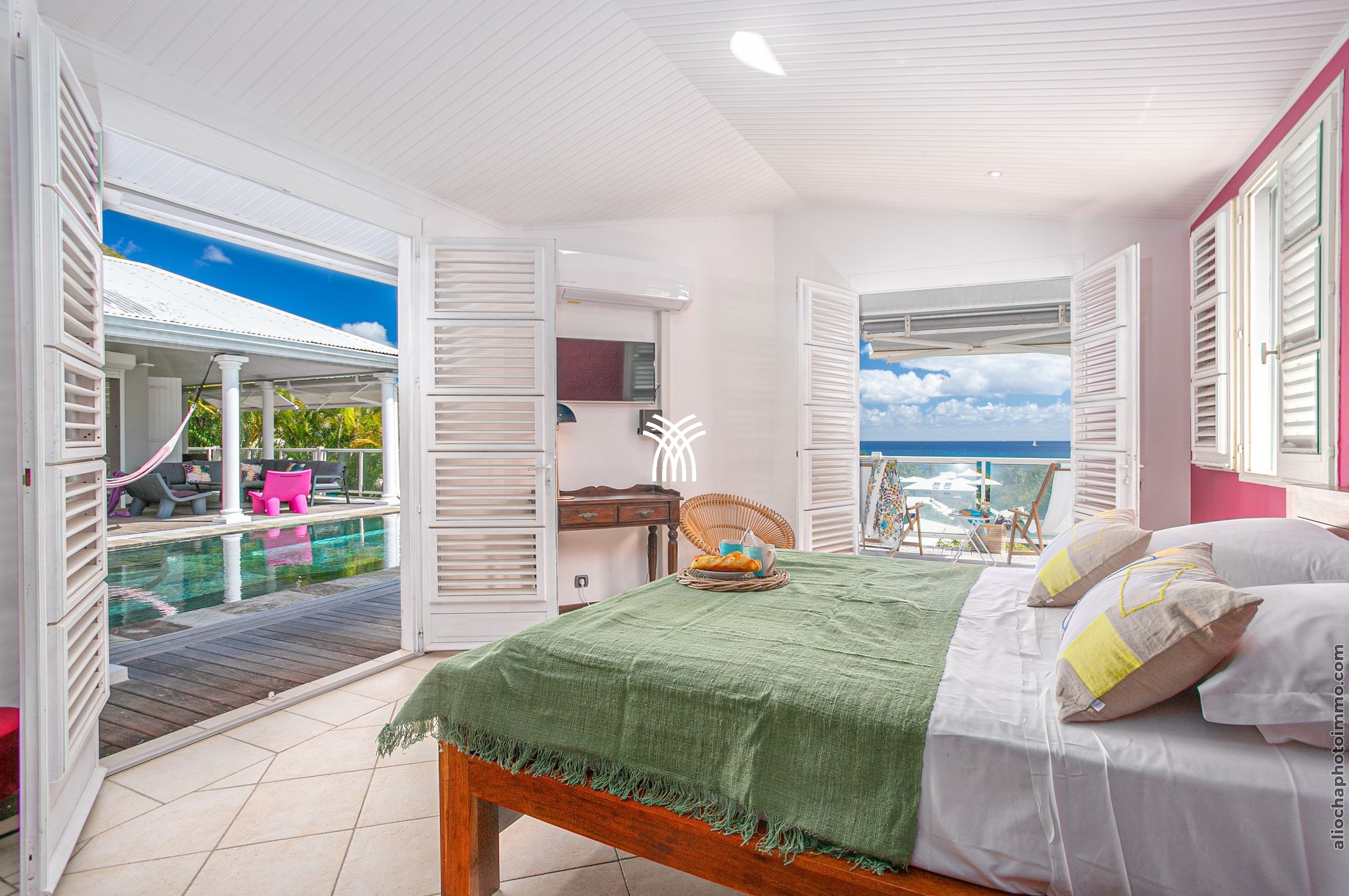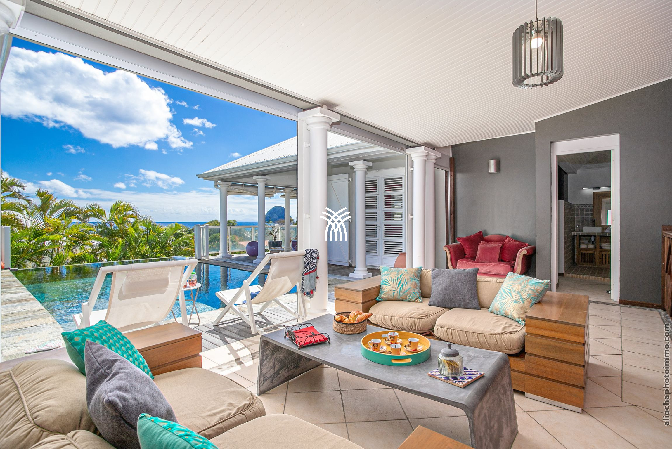 À l’intérieur, les espaces de vie lumineux et aérés sont décorés avec un goût exquis. Le salon, la salle à manger et la cuisine moderne s’ouvrent sur une terrasse couverte, véritable invitation à la détente. Les transats, le salon de jardin et un canapé de jour vous accueillent pour des moments de relaxation au bord de la piscine, tandis que les couchers de soleil spectaculaires sur le Rocher du Diamant et le Morne Larcher apportent une touche magique à vos soirées.
