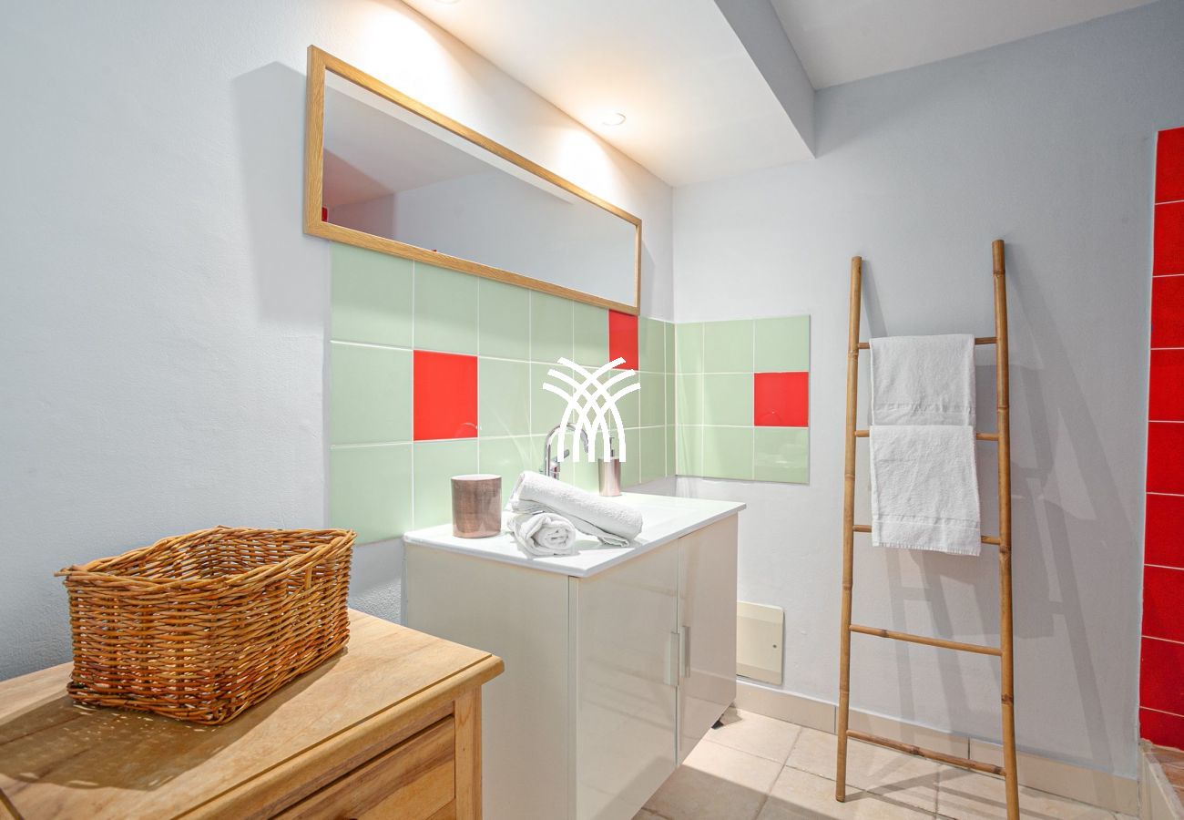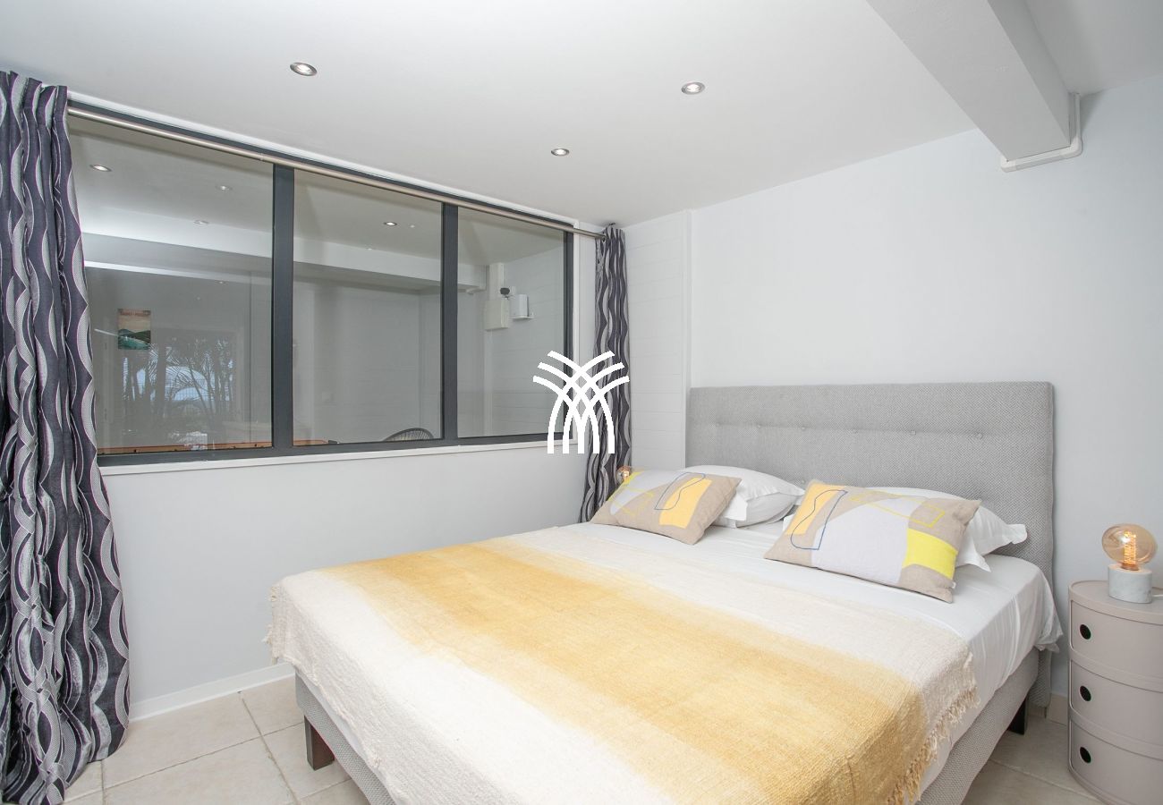 Chambre 1 : Teintée de vert canard, elle s'ouvre sur la terrasse avec vue sur la mer, dotée d'un lit 160x200 et d'une salle de douche à ciel ouvert.