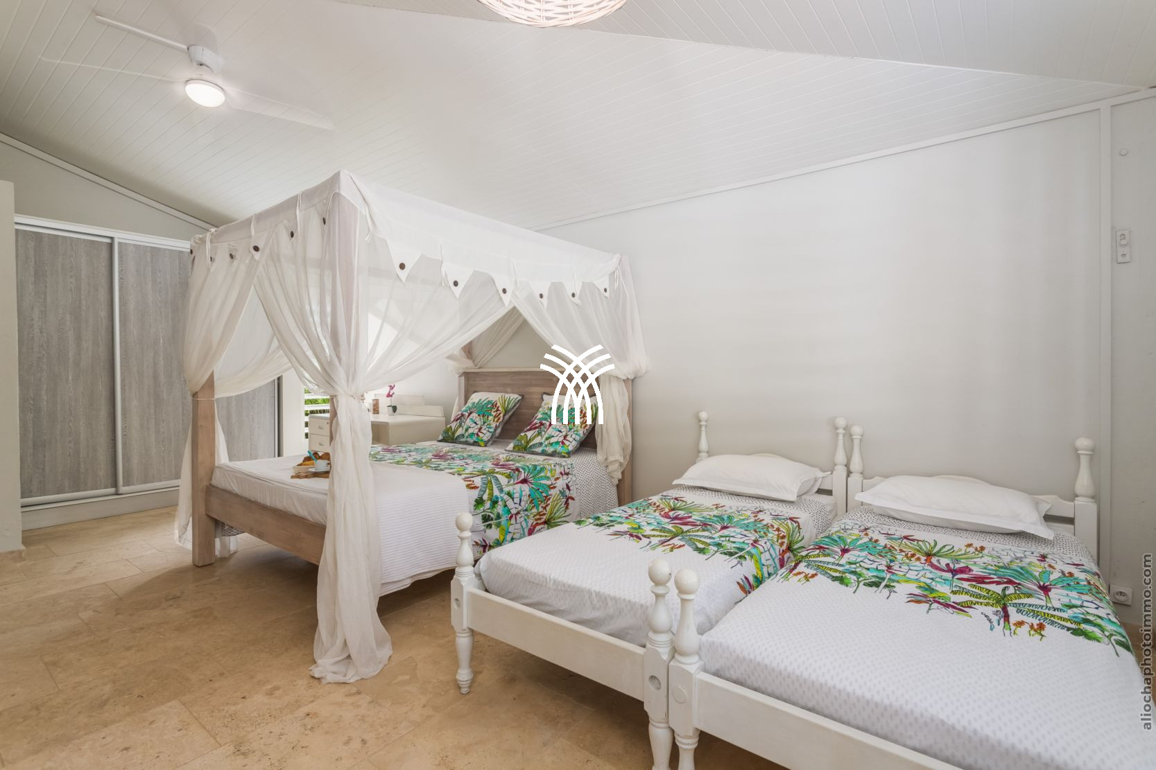 Pensée dans un esprit authentique et créole, la villa allie chaleur, confort et fonctionnalité. De grandes ouvertures laissent entrer la lumière tropicale et permettent de vivre en totale harmonie avec l’extérieur. La maison s’articule autour d’un espace de vie central accueillant — cuisine et salon — encadré par deux chambres climatisées, chacune avec leur salle d’eau à l’italienne et leurs WC privatifs. Au total, la Villa Honeymoon propose trois chambres doubles et une chambre quadruple, idéale pour les séjours en famille ou entre amis.