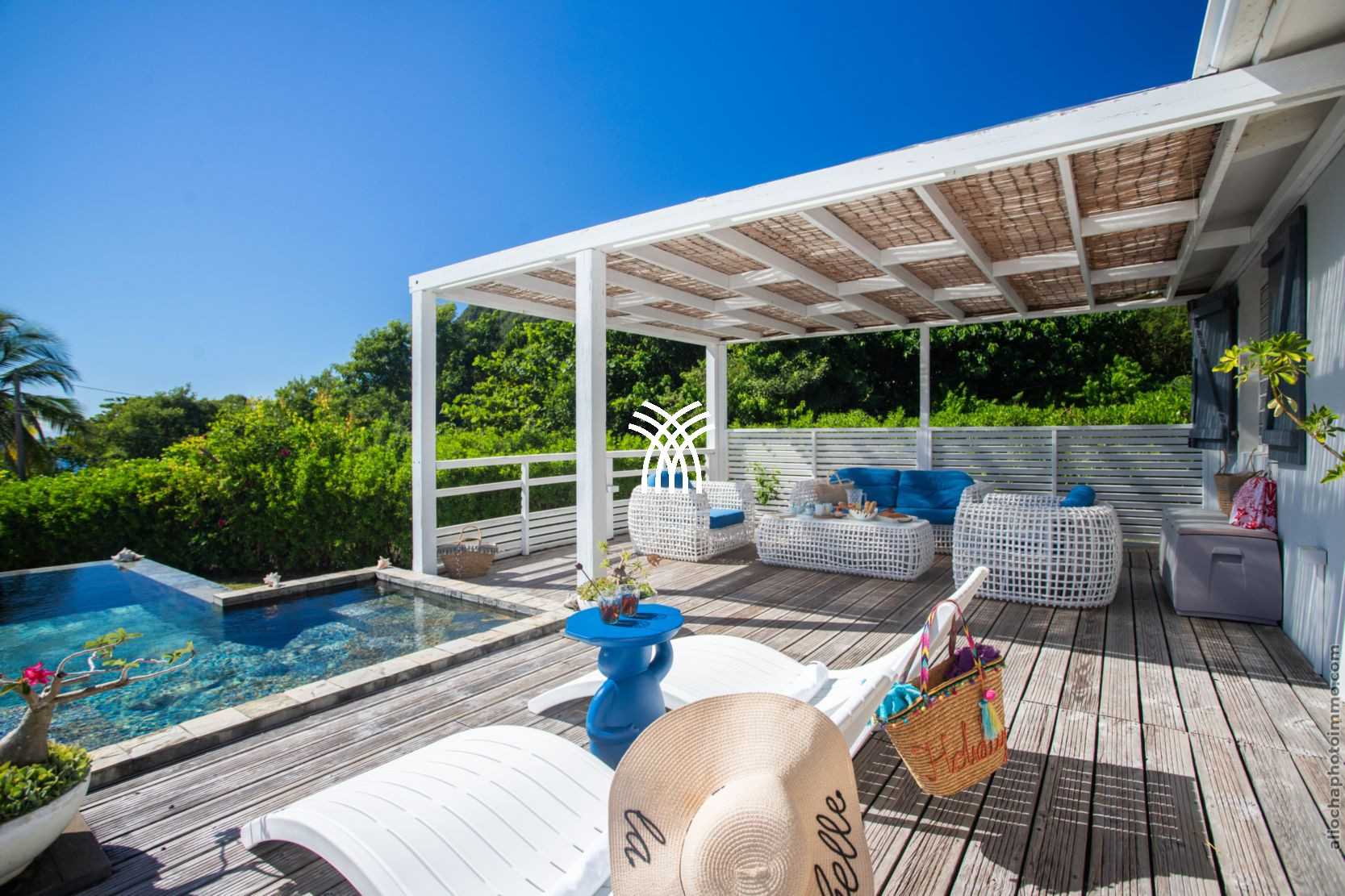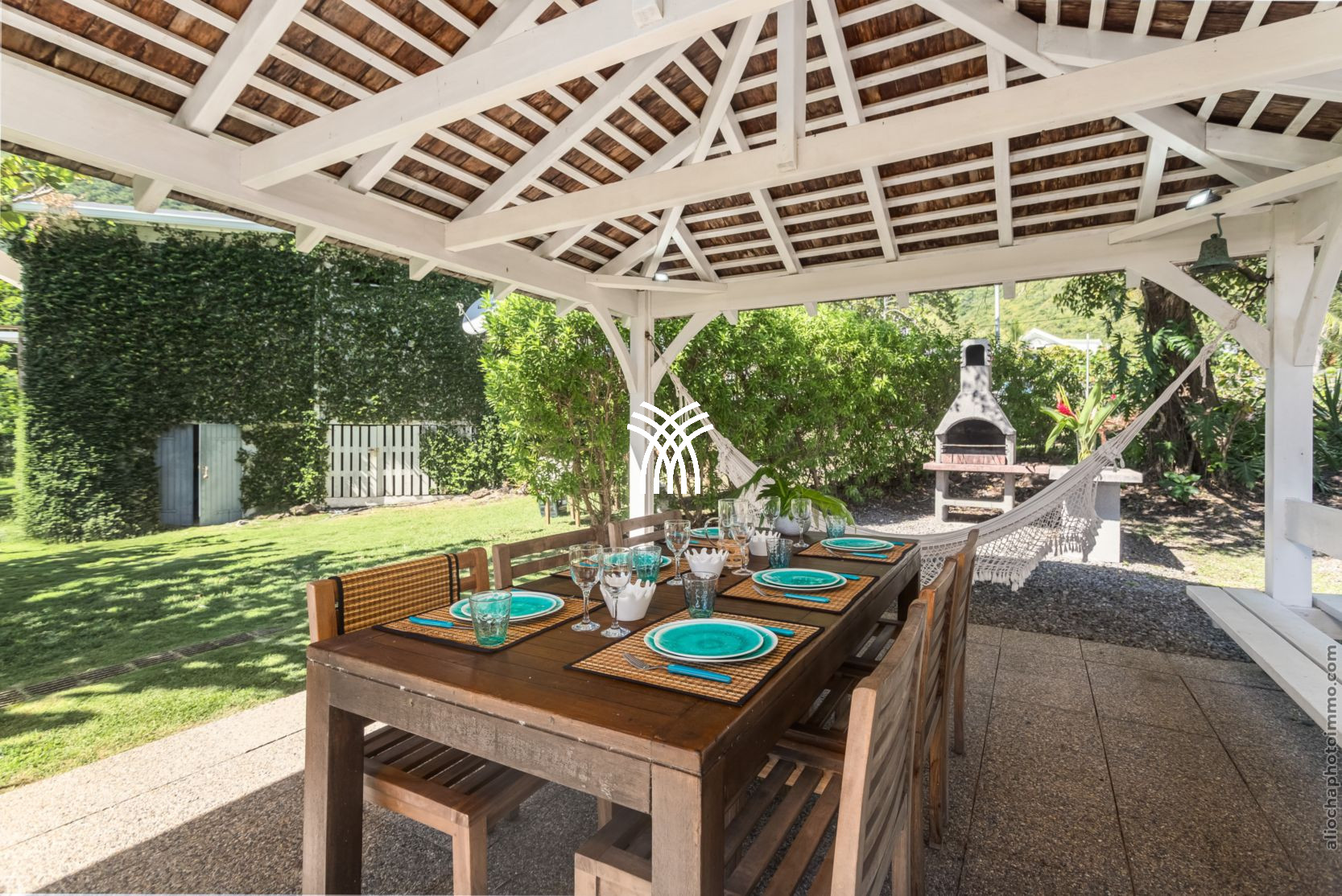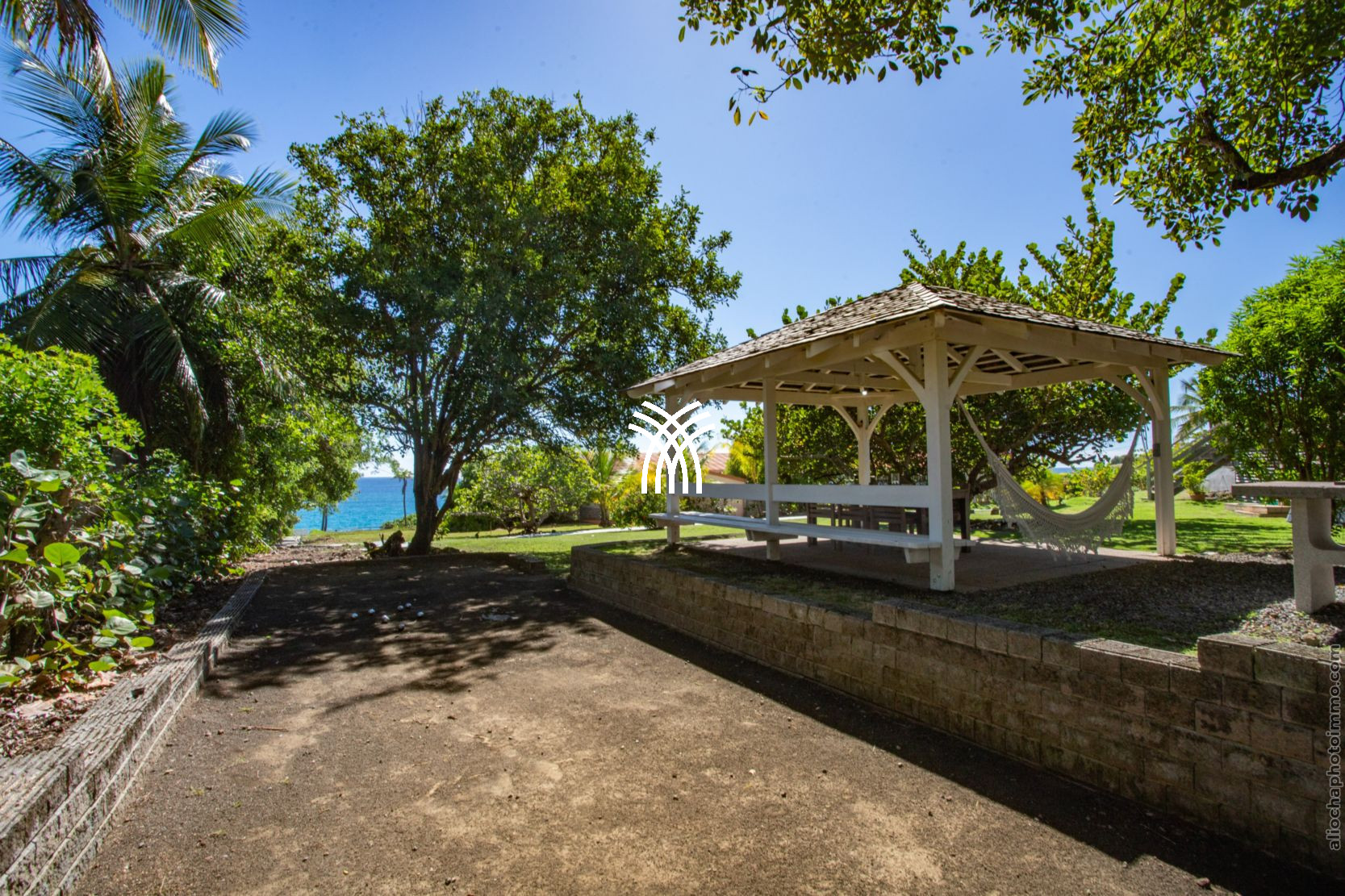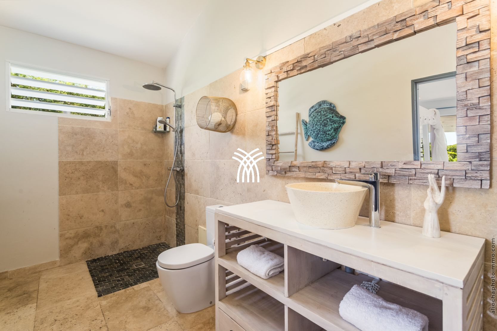 À l’extérieur, tout est conçu pour le bonheur des sens : une grande terrasse avec espace repas, un salon sous pergola pour les apéritifs face à l’horizon, un carbet avec barbecue au cœur du jardin tropical, des hamacs pour les siestes ombragées, et même un boulodrome pour des parties de pétanque en toute convivialité. Depuis le fond du parc, un sentier privé vous conduit directement aux eaux turquoise, entre la plage de Dizac et la discrète Anse Cafard.