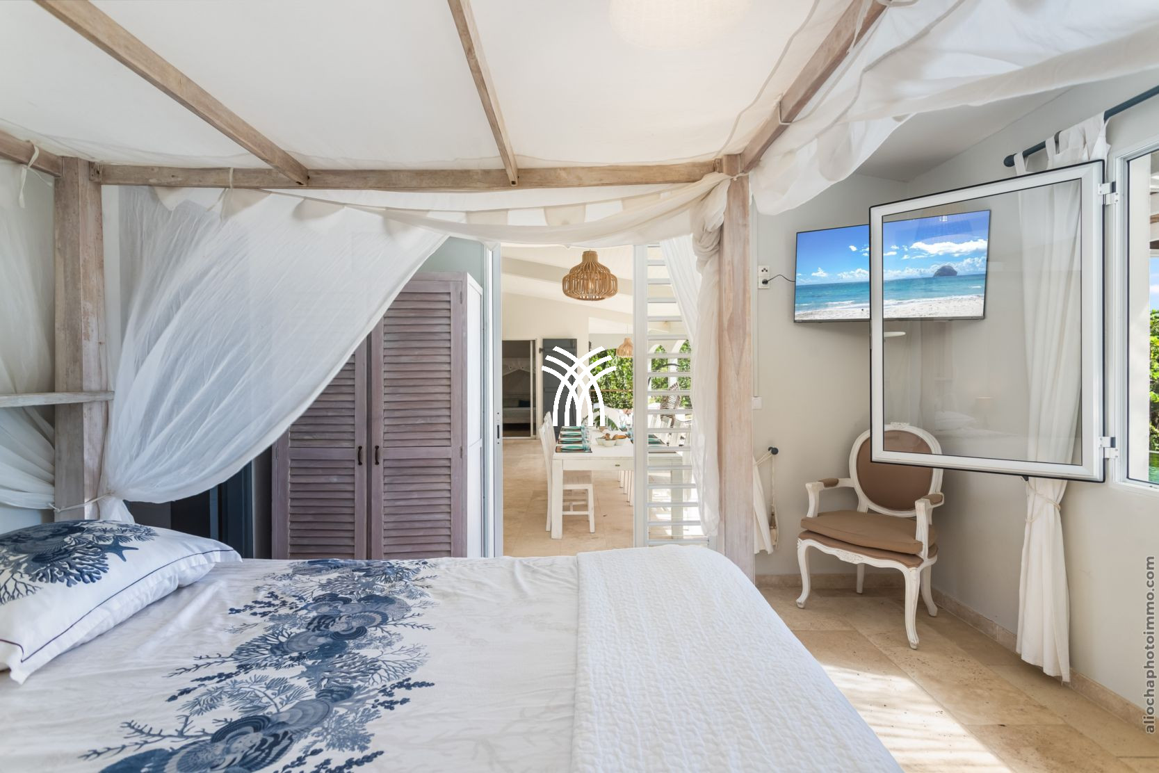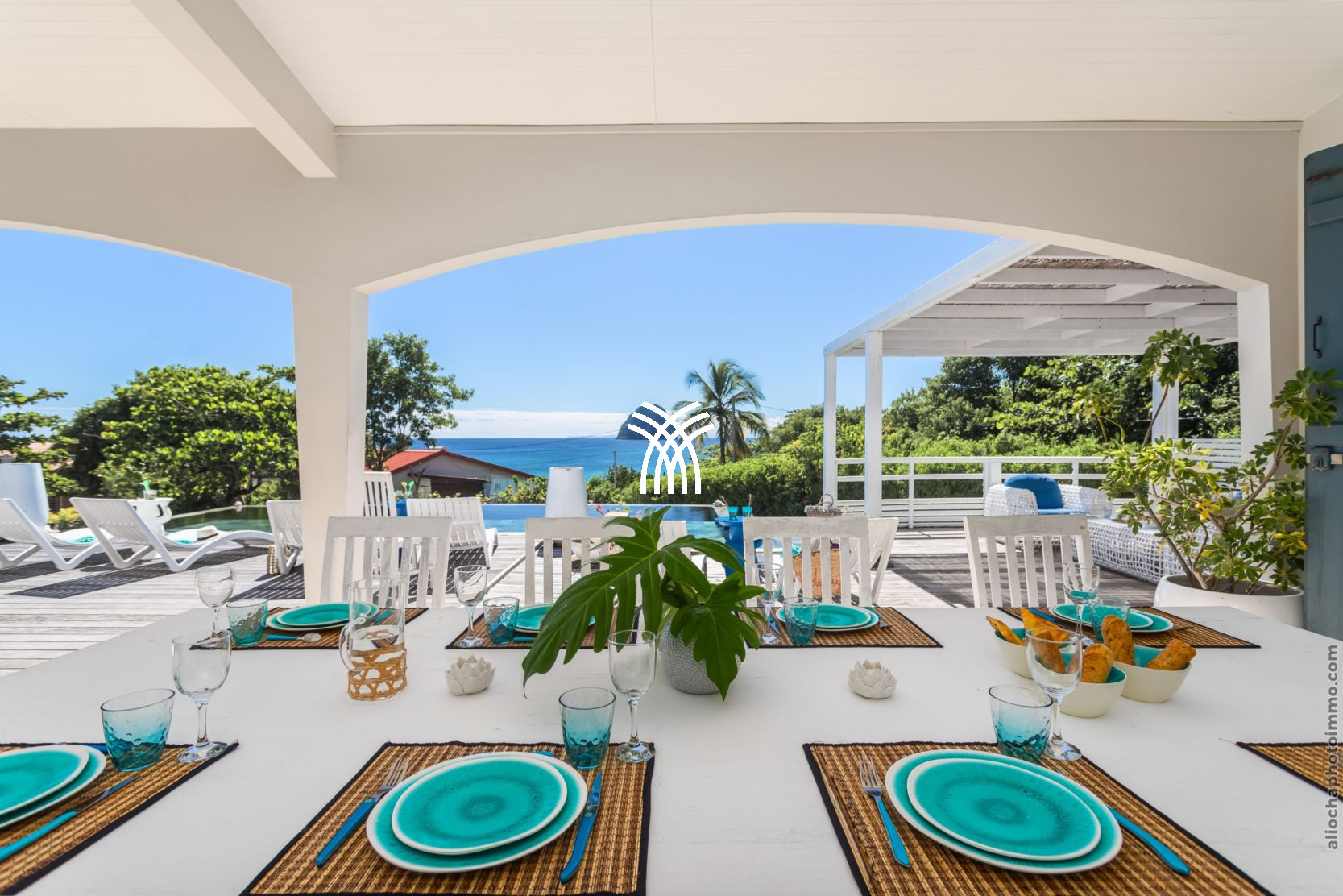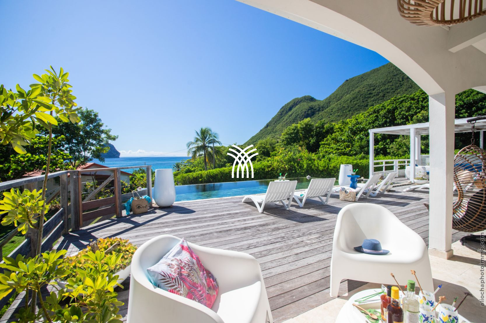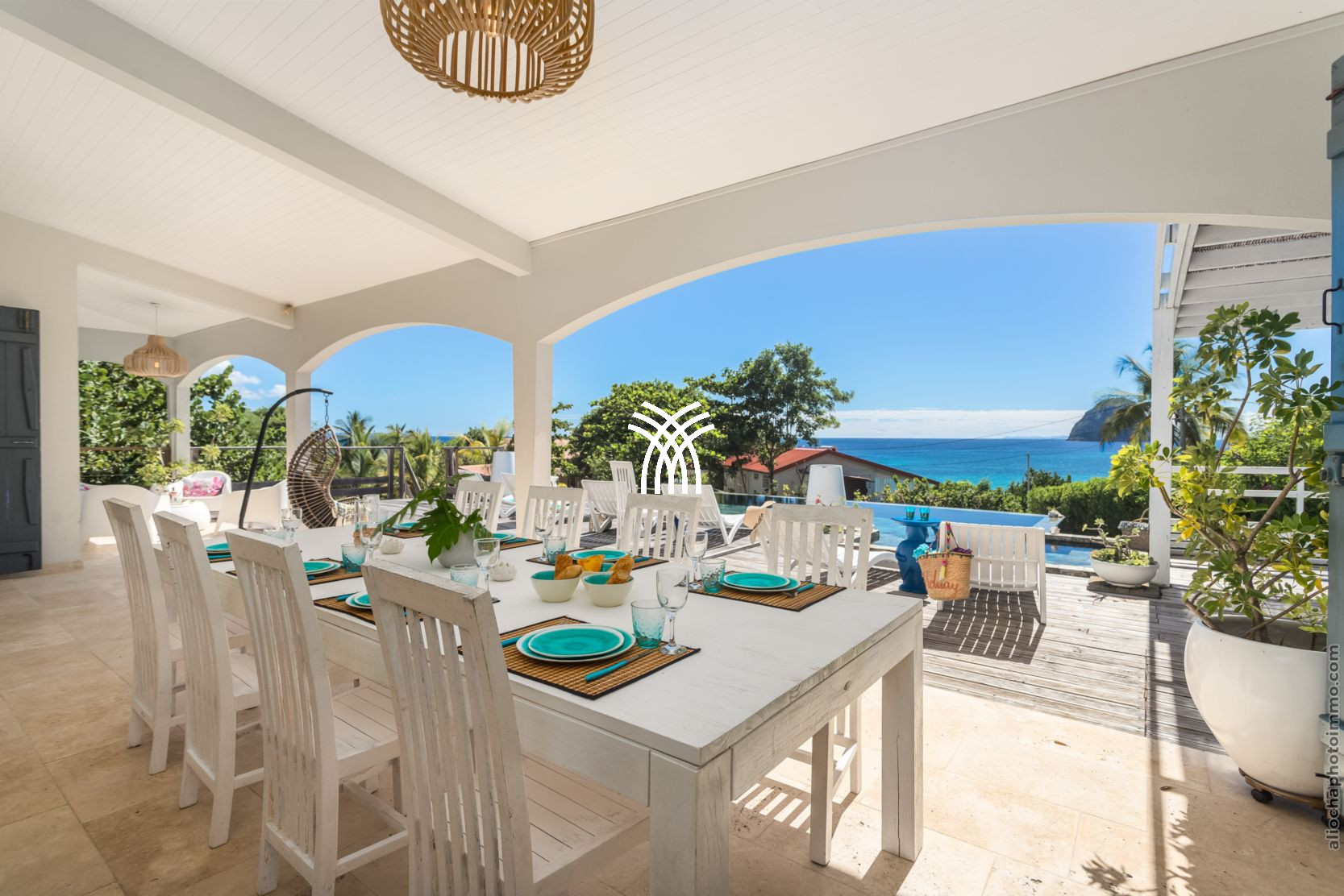 À l’intérieur, les espaces de vie lumineux et aérés sont décorés avec un goût exquis. Le salon, la salle à manger et la cuisine moderne s’ouvrent sur une terrasse couverte, véritable invitation à la détente. Les transats, le salon de jardin et un canapé de jour vous accueillent pour des moments de relaxation au bord de la piscine, tandis que les couchers de soleil spectaculaires sur le Rocher du Diamant et le Morne Larcher apportent une touche magique à vos soirées.