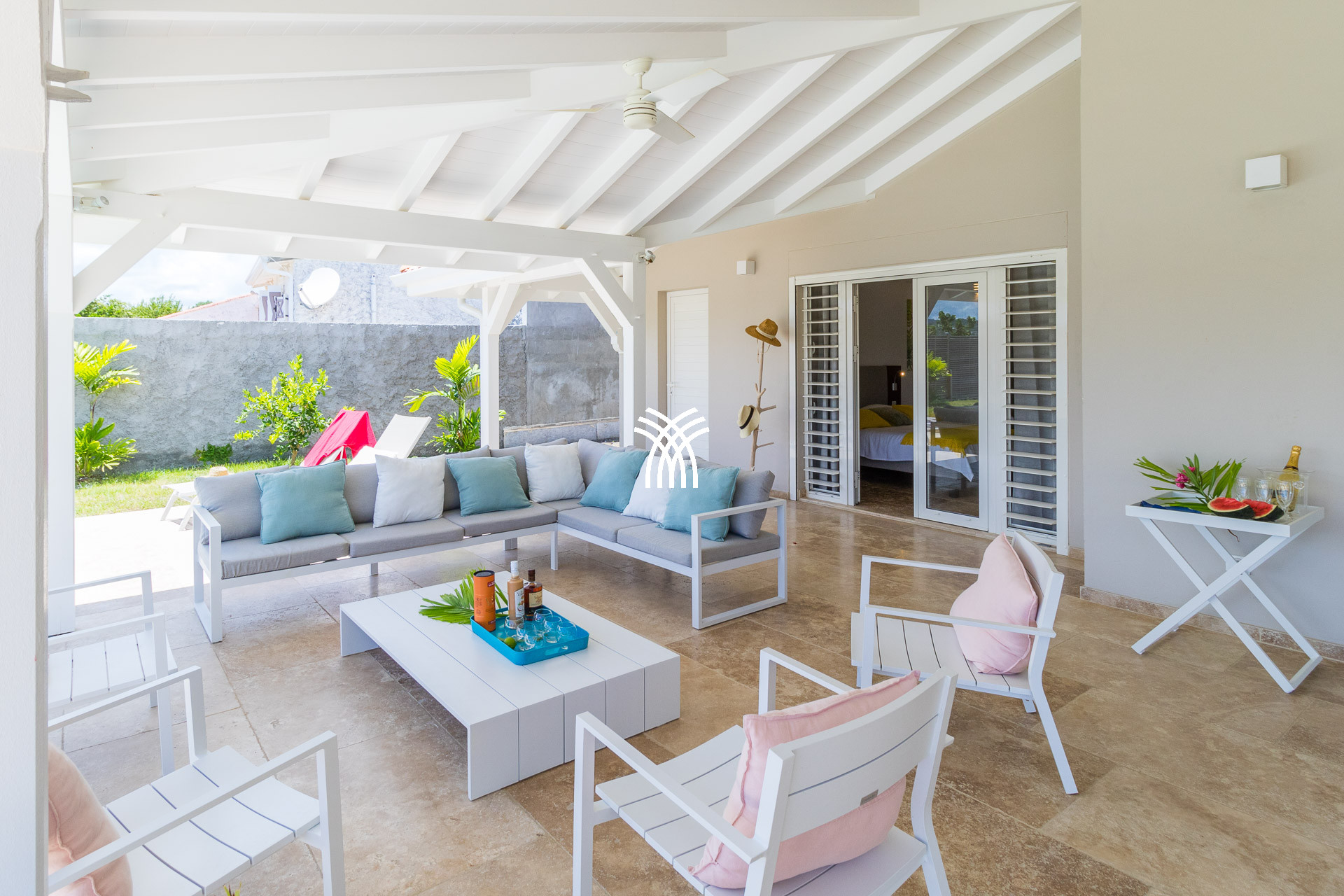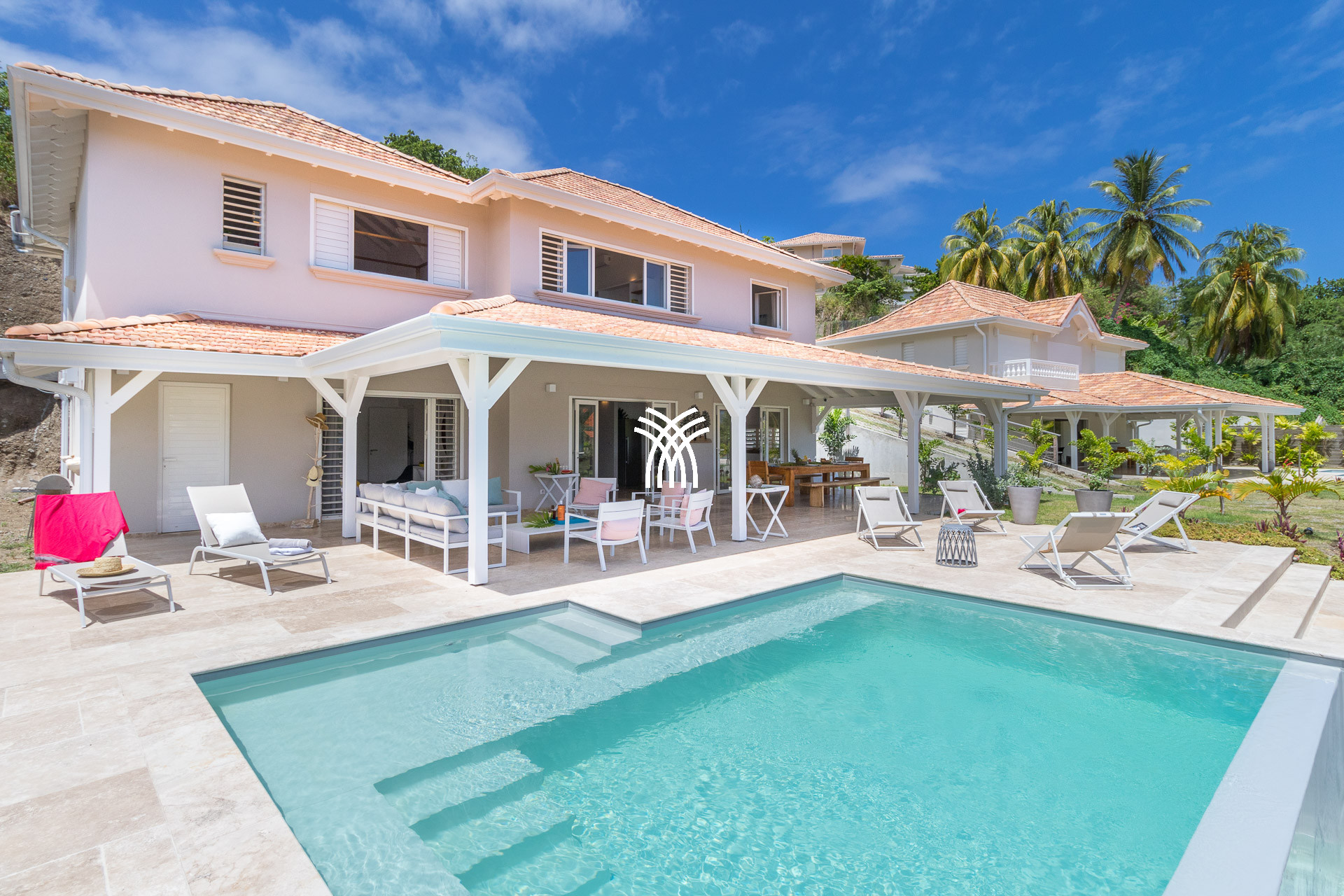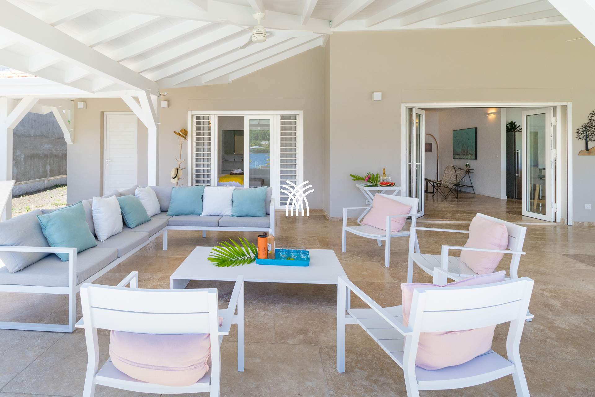 À l'extérieur, la villa Coraly propose plusieurs espaces de détente. La piscine à débordement, entourée de transats, est un lieu idéal pour se ressourcer. Deux salons de jardin surplombent la mer, parfaits pour savourer un apéritif en admirant la vue. Une grande table extérieure, située sous un carbet, permet de prendre les repas à l'ombre tout en profitant du panorama sur le lagon.