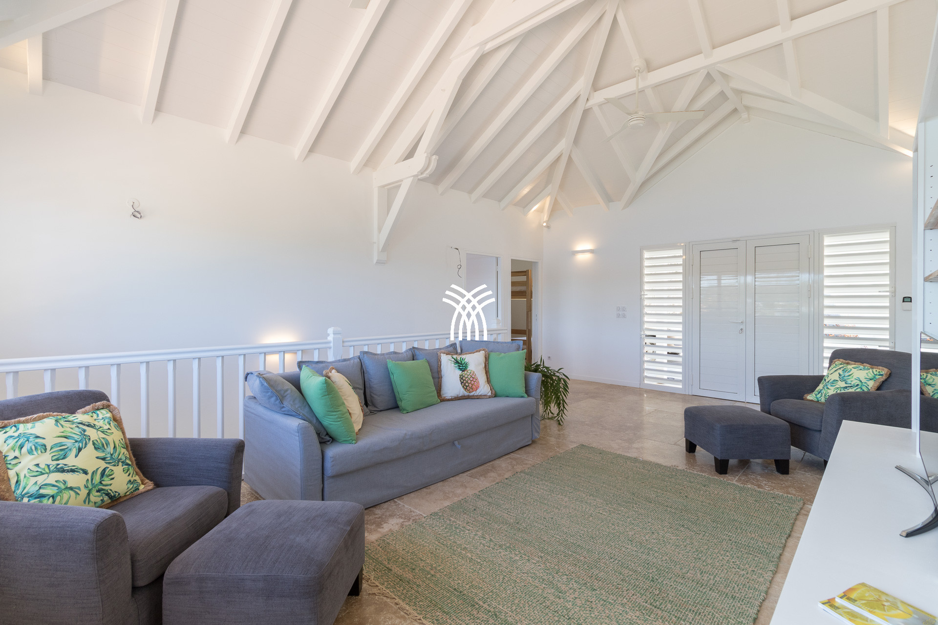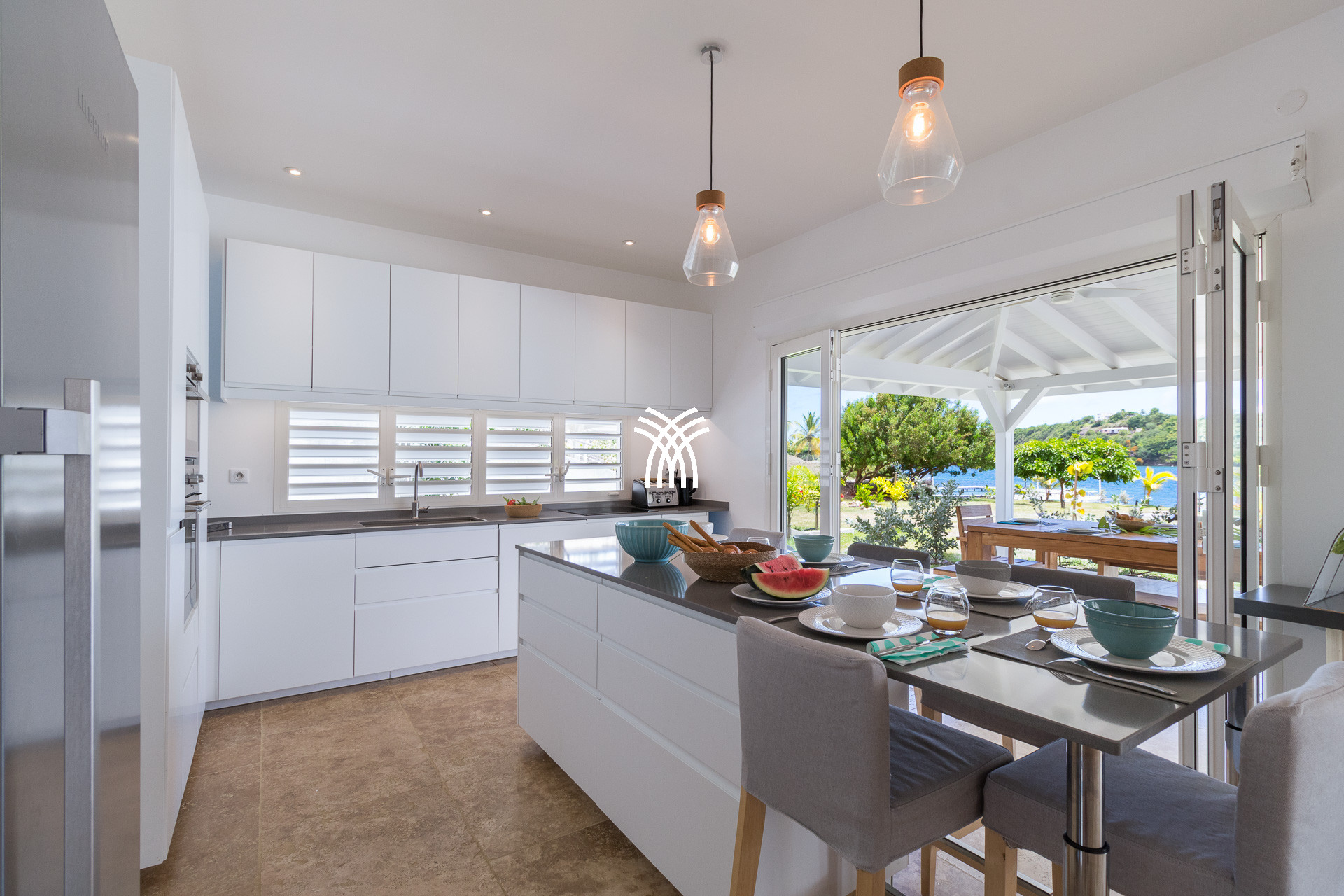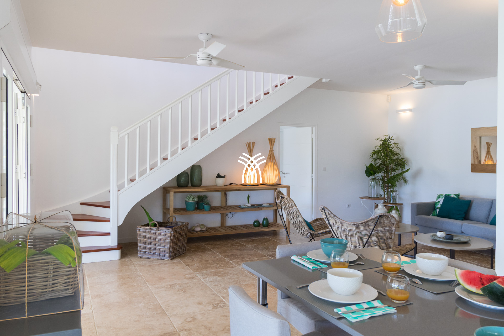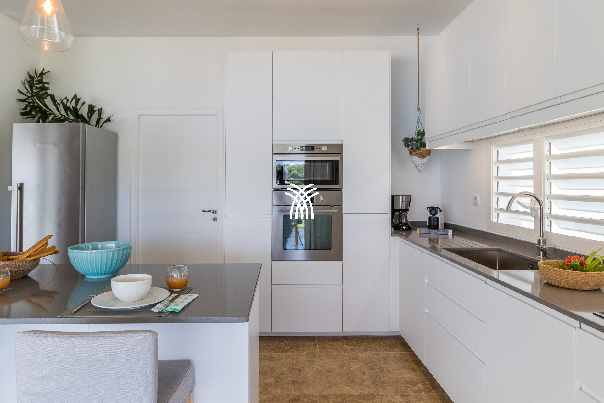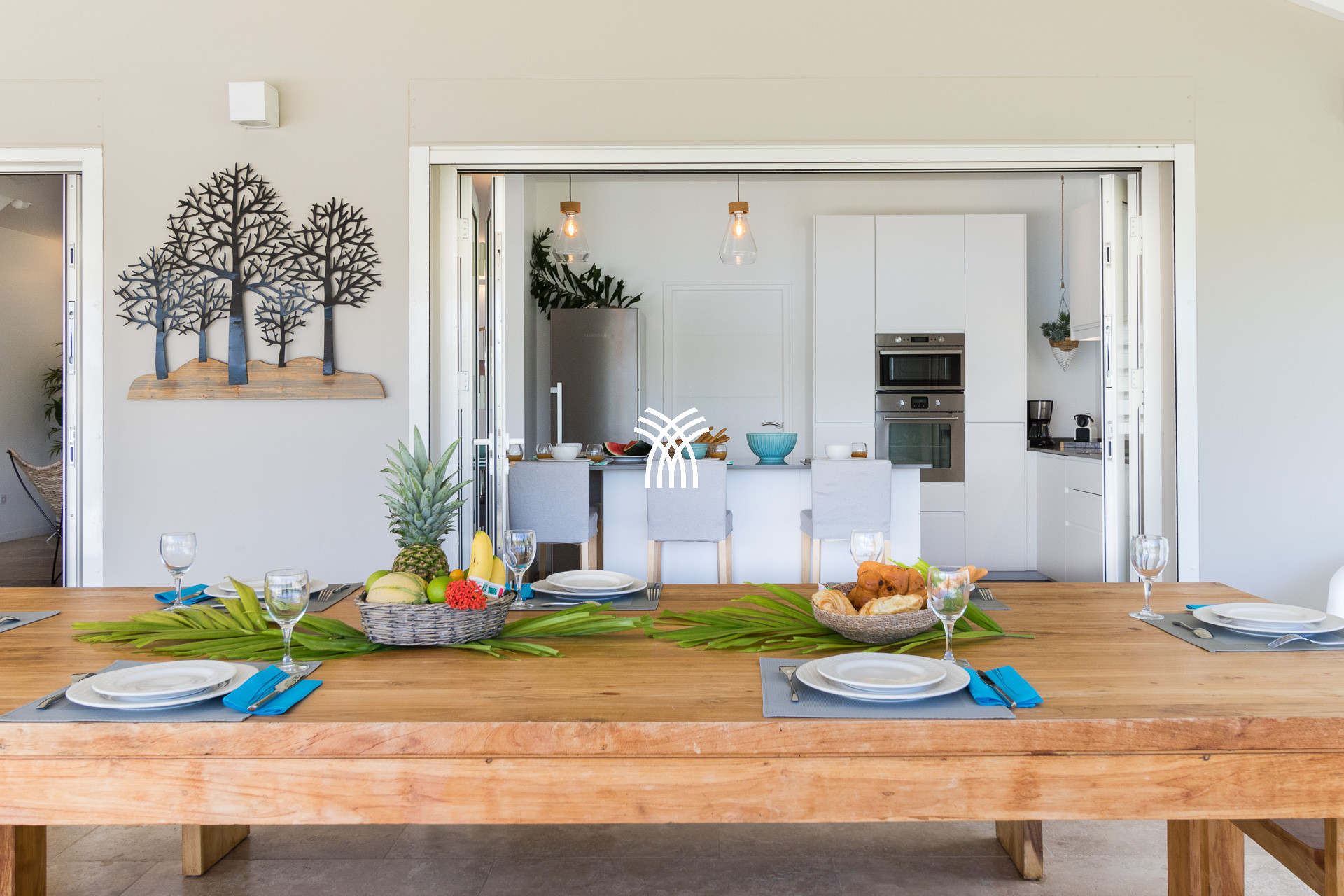 La Villa Coraly se distingue par son architecture moderne et ses lignes épurées. Les espaces de vie décloisonnés, baignés de lumière naturelle, offrent des zones dédiées à la détente et au partage, assurant des vacances reposantes. Le salon, décoré avec goût, est équipé de deux canapés blancs qui accentuent l’atmosphère douce et relaxante de la pièce. La salle à manger, avec sa table laquée, invite à des repas conviviaux tout en profitant de la vue imprenable sur l'océan. La cuisine ouverte est entièrement équipée, avec un bar en bois qui ajoute une touche chaleureuse et conviviale.