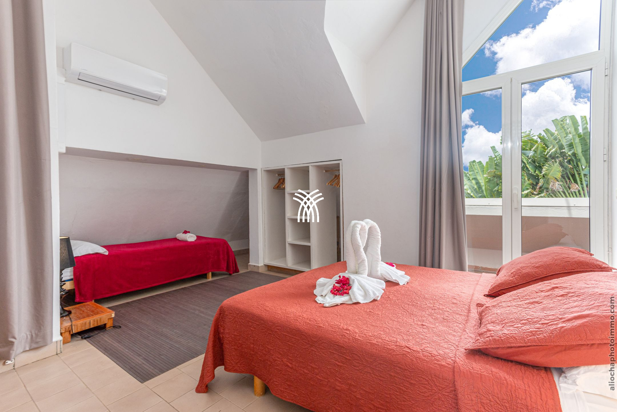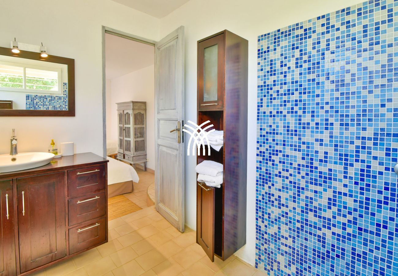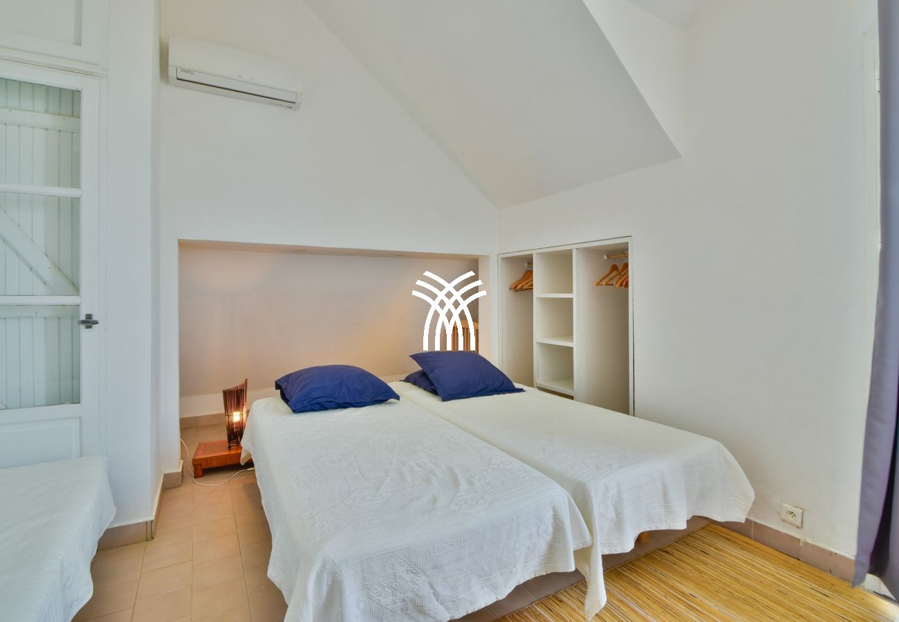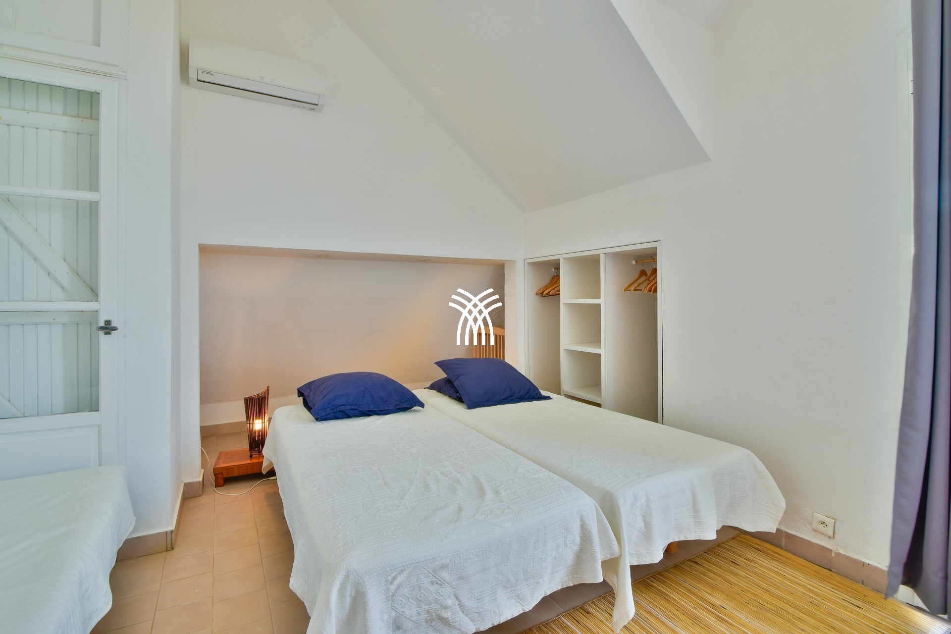 Conçue pour accueillir jusqu’à 11 personnes, la Villa Karukera offre des volumes harmonieux et quatre chambres spacieuses, chacune climatisée pour un confort optimal. La literie modulable permet une flexibilité parfaite pour les groupes et familles, avec trois lits doubles de 160 cm et cinq lits simples de 80 cm pouvant être réunis. La distribution des chambres assure à chacun son espace, avec une chambre en rez-de-chaussée dotée d’un lit double et d’un lit simple avec salle de bain privative, ainsi que trois chambres à l’étage, dont l’une dispose également de sa propre salle de bain. Une salle d’eau supplémentaire est partagée à l’étage, ainsi qu’un toilette invité au rez-de-chaussée. Un lit bébé est disponible, avec la possibilité d’en ajouter un second sur demande.