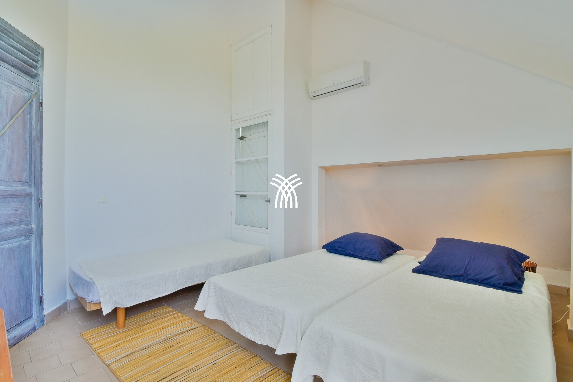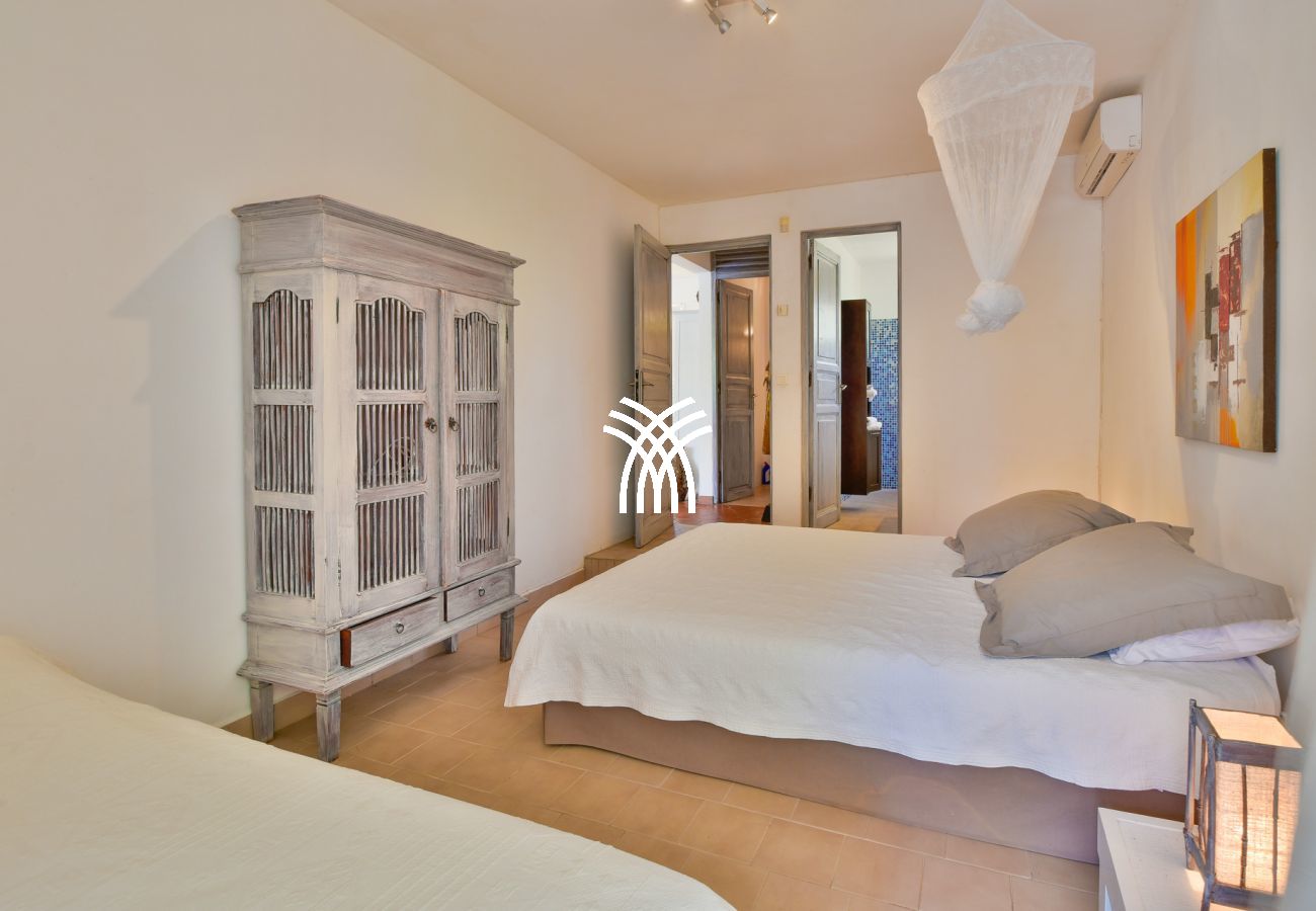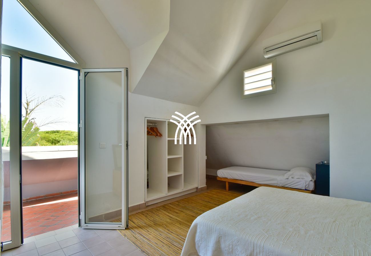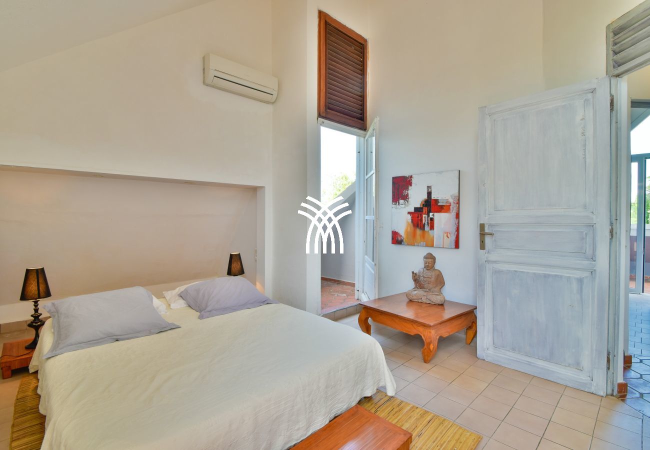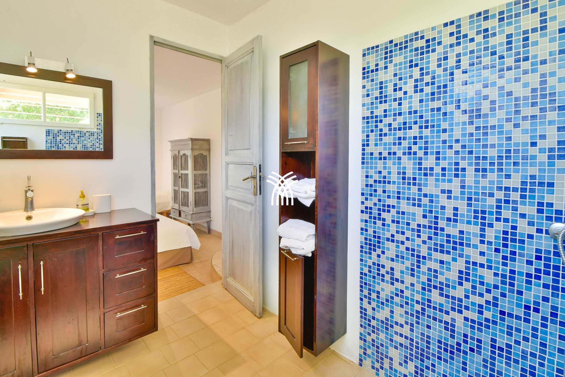 Conçue pour accueillir jusqu’à 11 personnes, la Villa Karukera offre des volumes harmonieux et quatre chambres spacieuses, chacune climatisée pour un confort optimal. La literie modulable permet une flexibilité parfaite pour les groupes et familles, avec trois lits doubles de 160 cm et cinq lits simples de 80 cm pouvant être réunis. La distribution des chambres assure à chacun son espace, avec une chambre en rez-de-chaussée dotée d’un lit double et d’un lit simple avec salle de bain privative, ainsi que trois chambres à l’étage, dont l’une dispose également de sa propre salle de bain. Une salle d’eau supplémentaire est partagée à l’étage, ainsi qu’un toilette invité au rez-de-chaussée. Un lit bébé est disponible, avec la possibilité d’en ajouter un second sur demande.