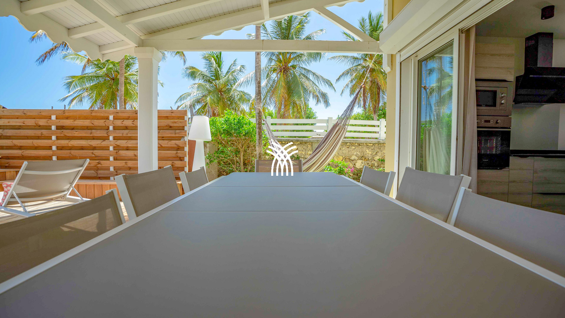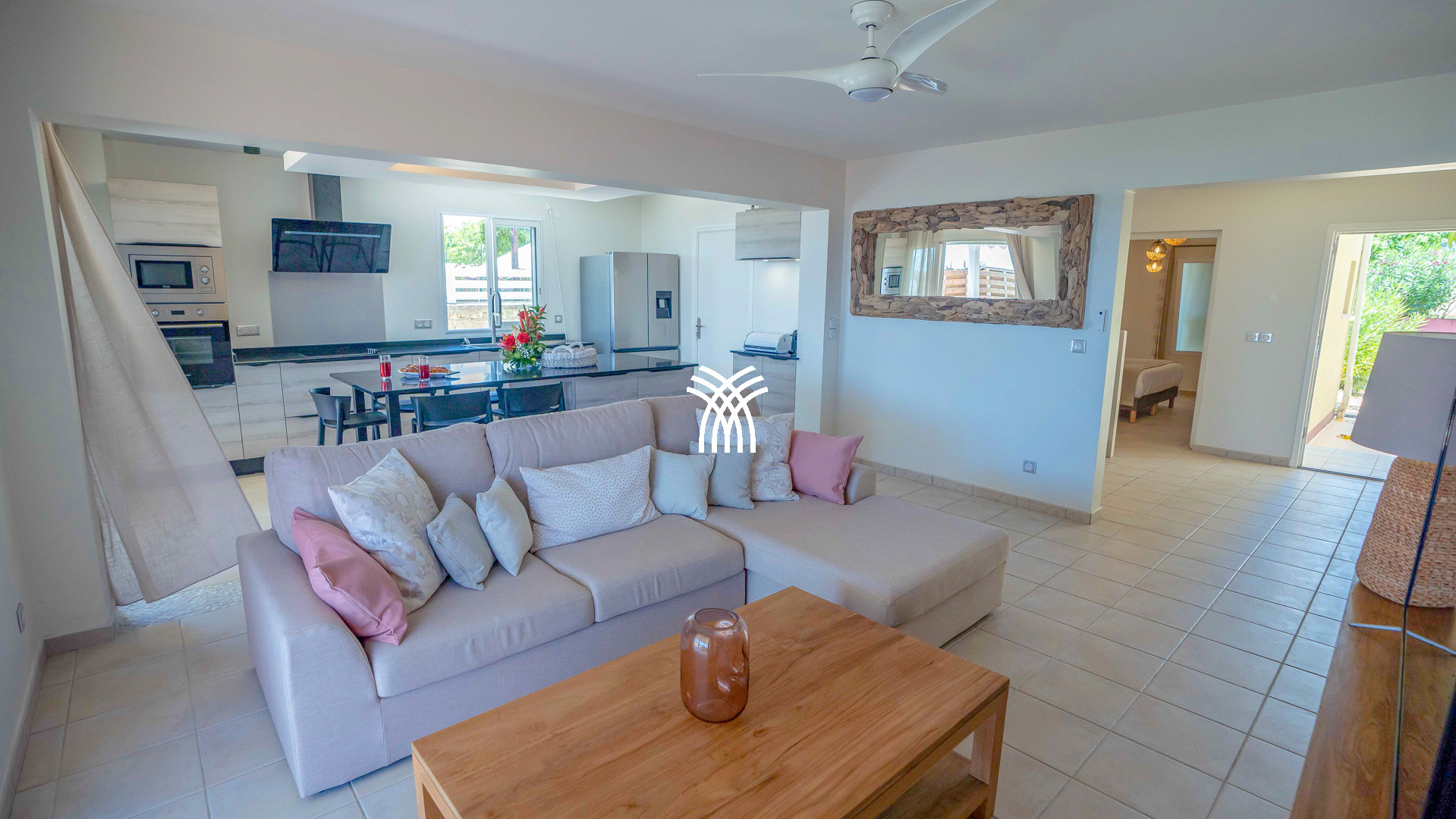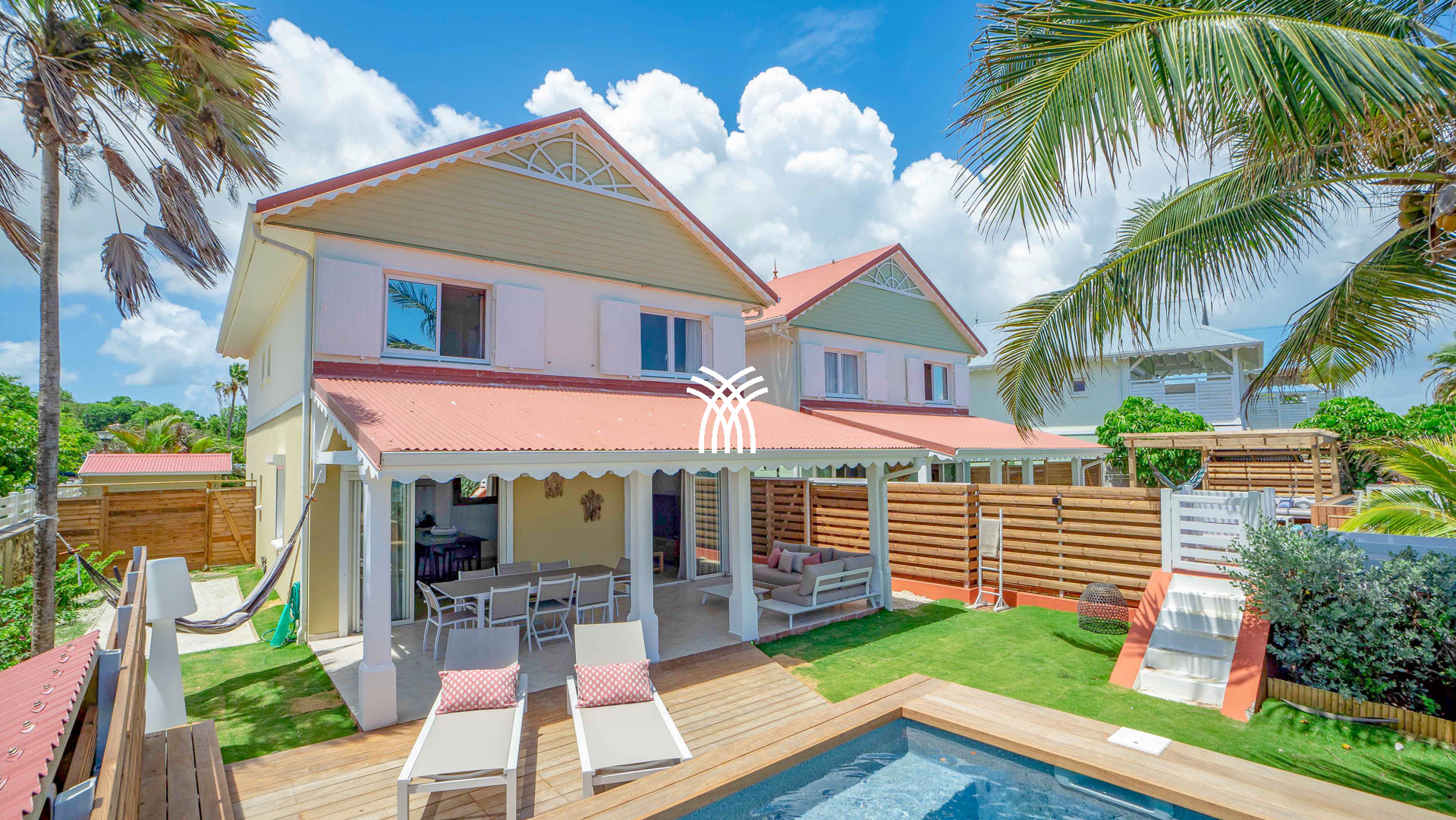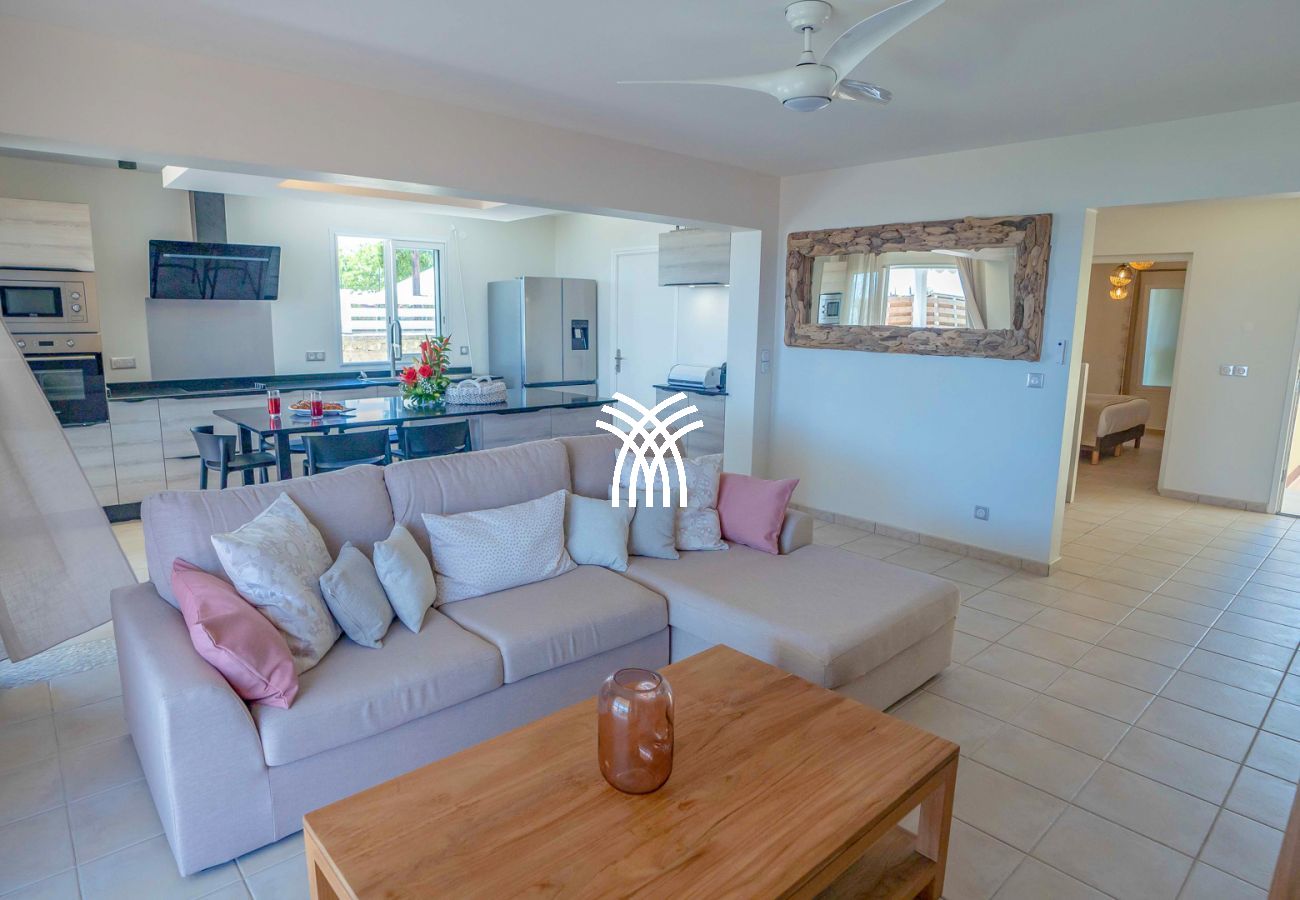 Derrière ses volets blancs et sa façade baignée de lumière, la villa s’ouvre sur un vaste séjour prolongé par une cuisine moderne entièrement équipée, pensée pour les moments de convivialité. Le salon s’anime au son des conversations, tandis que la grande terrasse invite à des repas en plein air sous la brise marine. Plus loin, un carbet ombragé s’avance vers le jardin et la piscine au sel, véritable cocon de fraîcheur où l’on savoure l’art du farniente entre cocotiers et reflets d’azur.