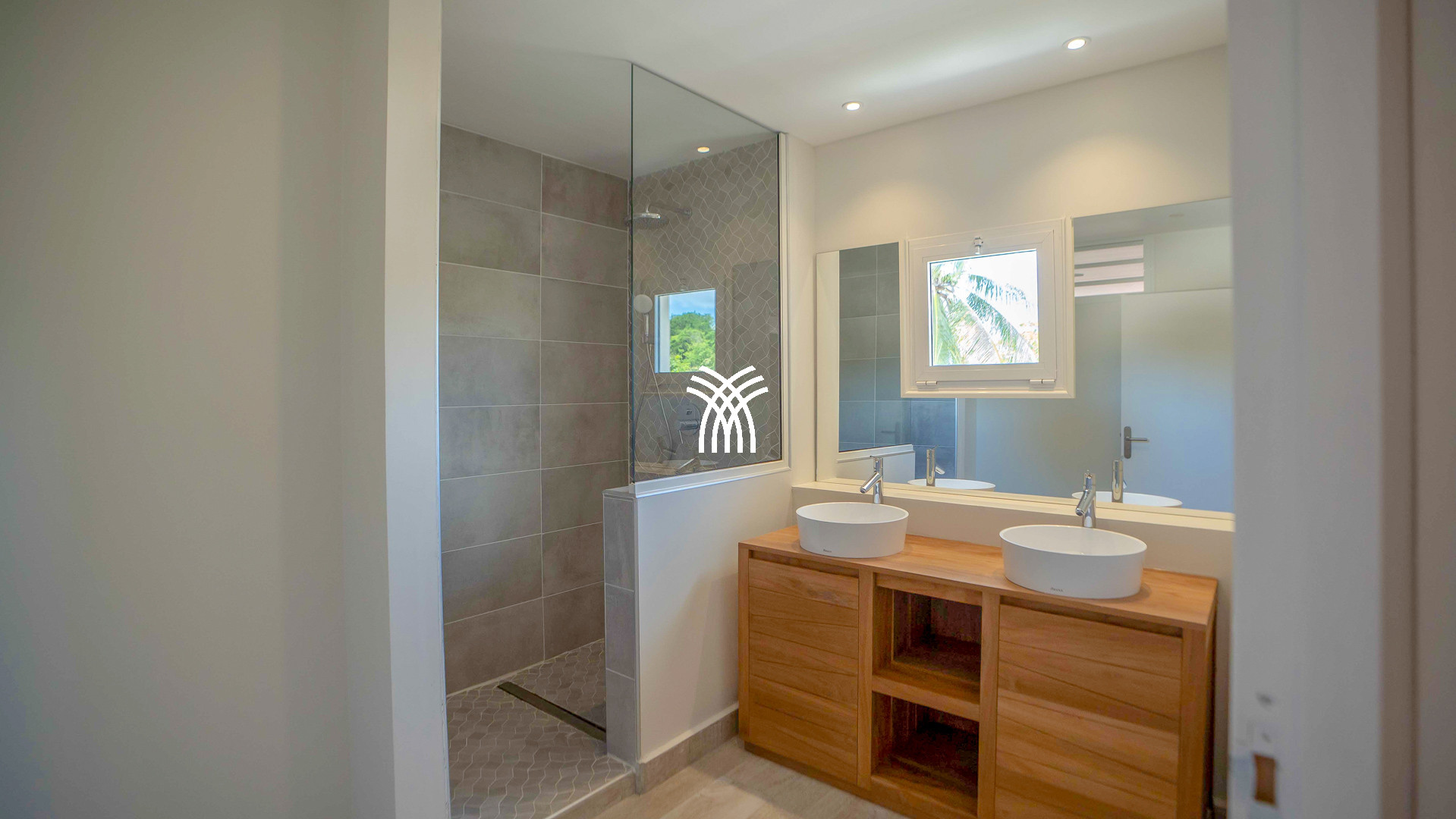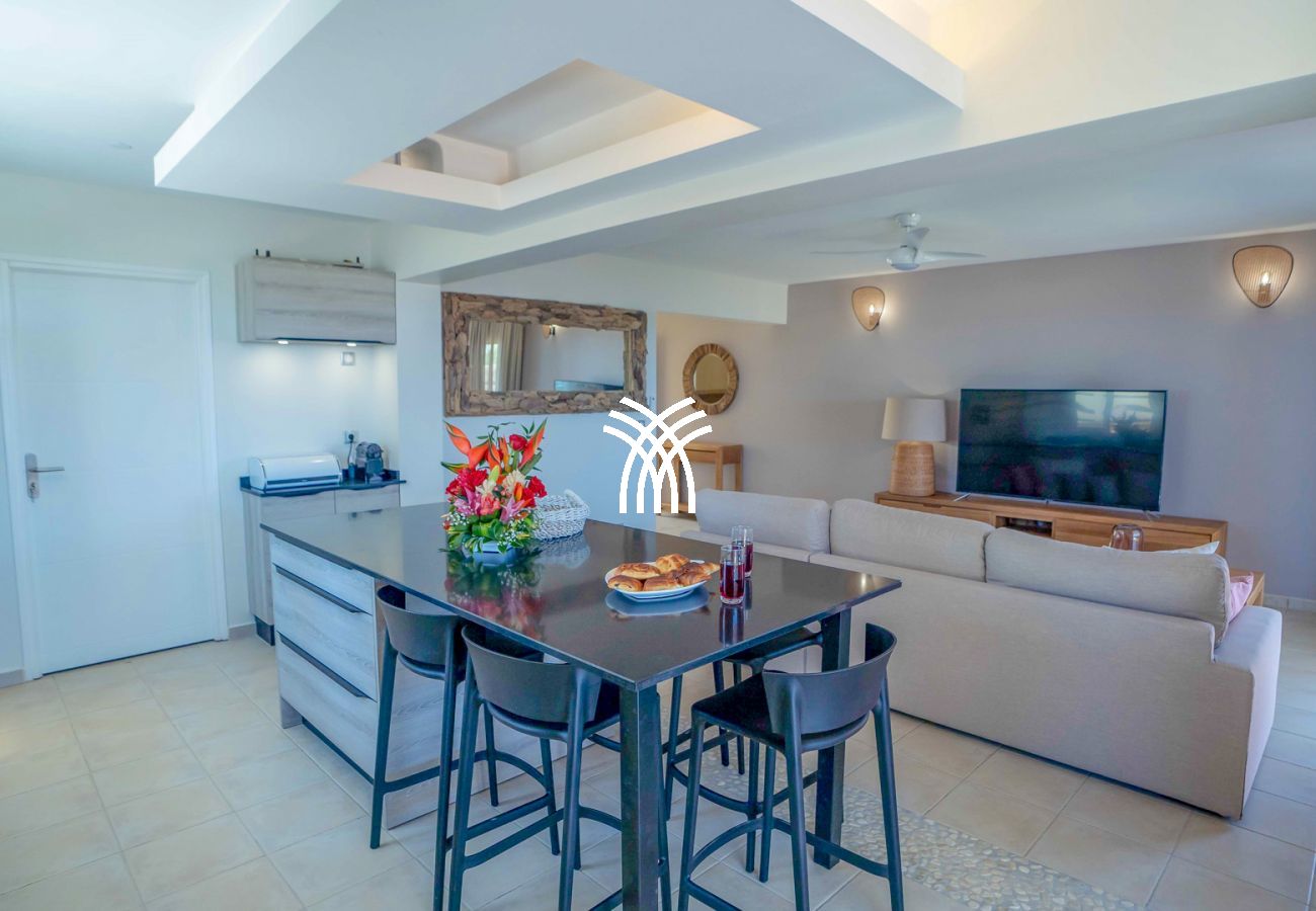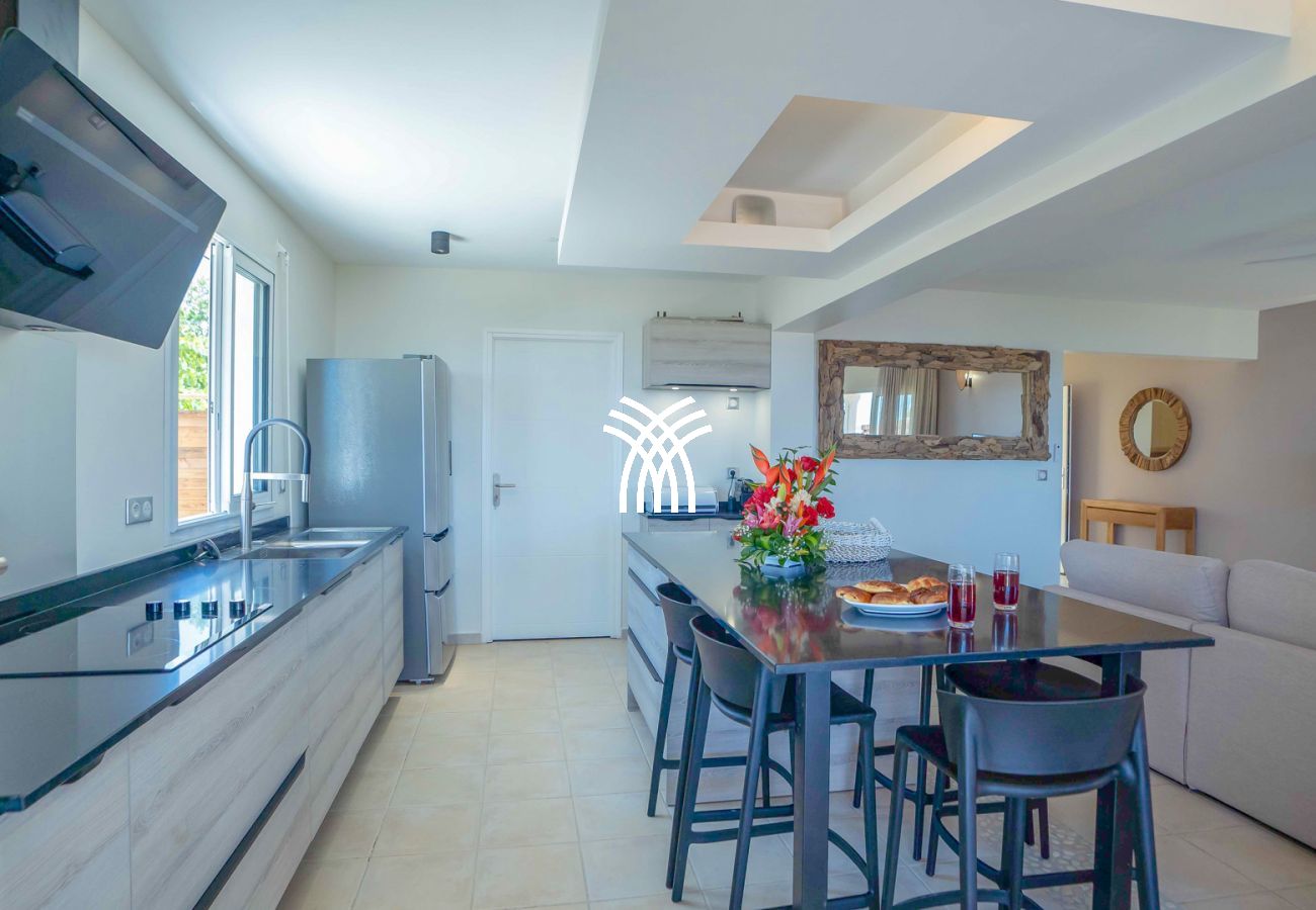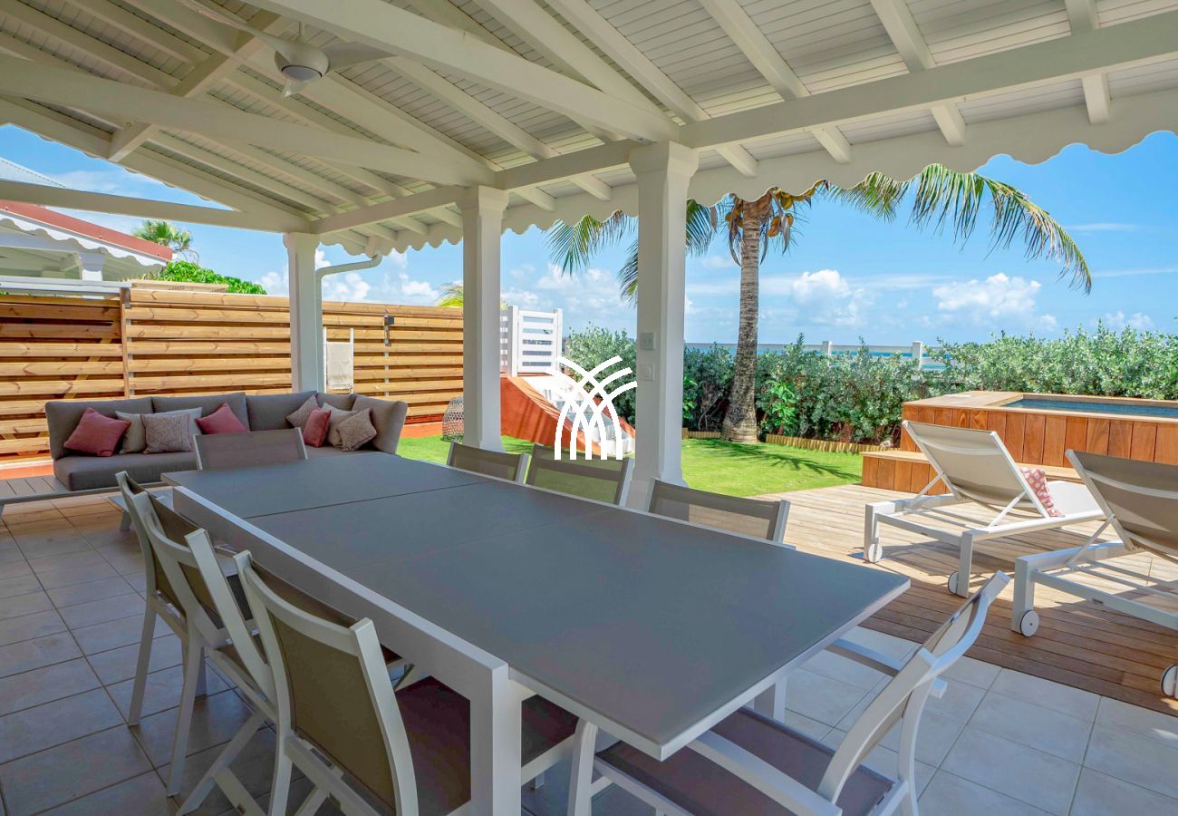Derrière ses volets blancs et sa façade baignée de lumière, la villa s’ouvre sur un vaste séjour prolongé par une cuisine moderne entièrement équipée, pensée pour les moments de convivialité. Le salon s’anime au son des conversations, tandis que la grande terrasse invite à des repas en plein air sous la brise marine. Plus loin, un carbet ombragé s’avance vers le jardin et la piscine au sel, véritable cocon de fraîcheur où l’on savoure l’art du farniente entre cocotiers et reflets d’azur.
