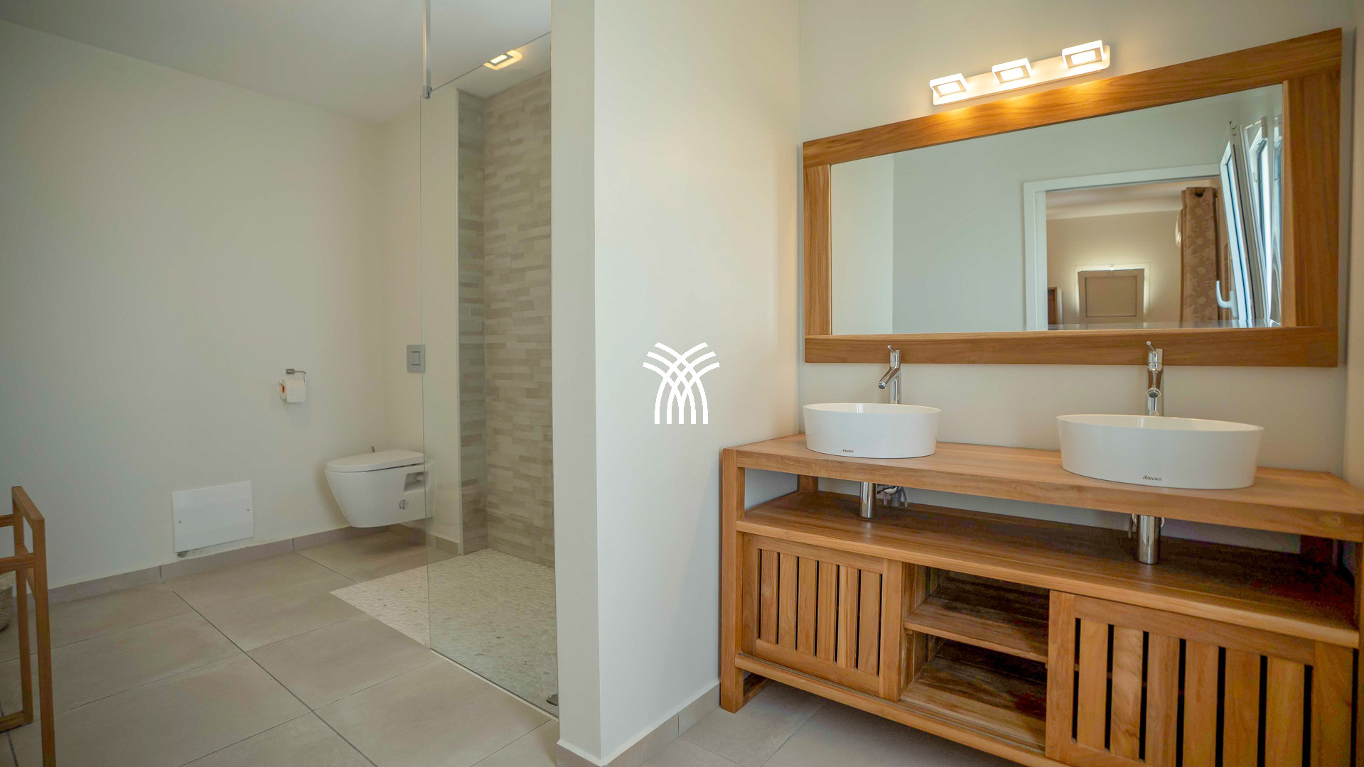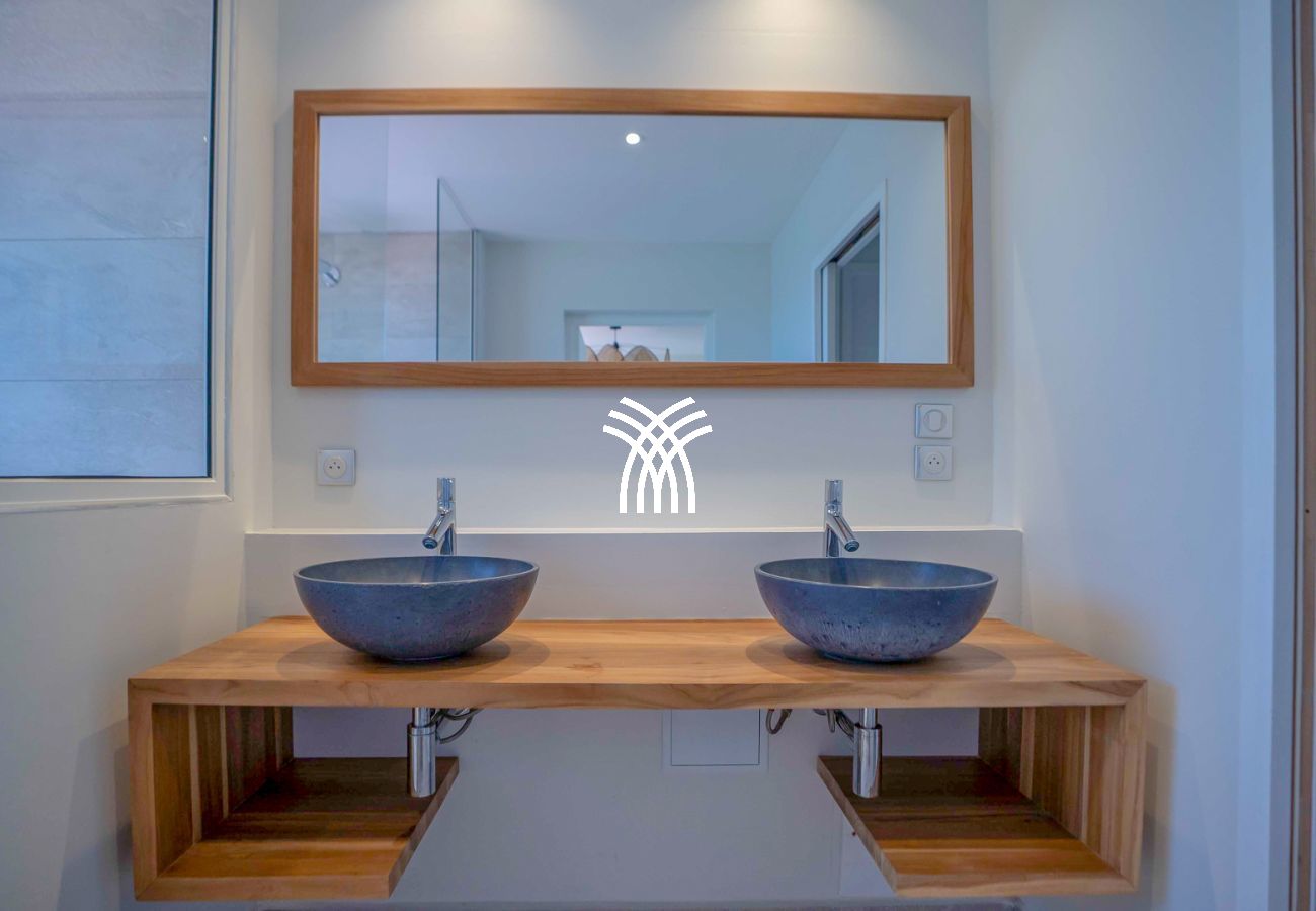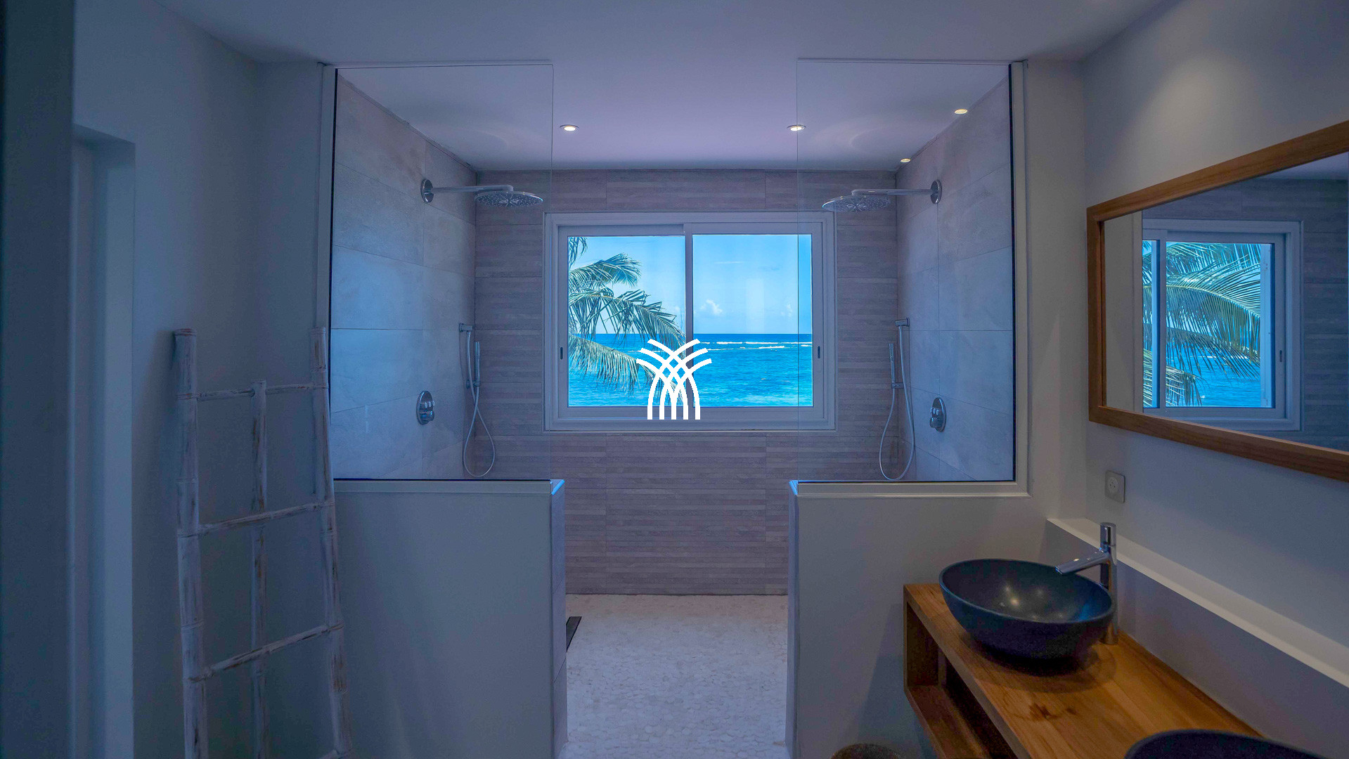 À l’extérieur, tout est pensé pour le plaisir des sens : un bac à punch pour se rafraîchir à toute heure, une douche extérieure pour se délasser après la plage, un barbecue à gaz pour vos soirées caribéennes, et des transats disposés sous le soleil pour admirer les nuances changeantes du ciel. Chaque détail a été soigneusement imaginé pour faire de cette villa de luxe en Guadeloupe un lieu de vie aussi élégant que chaleureux.