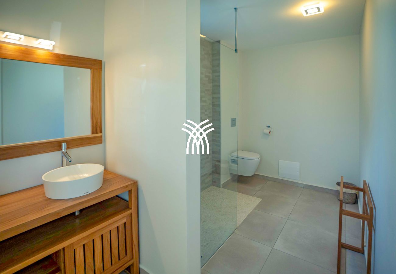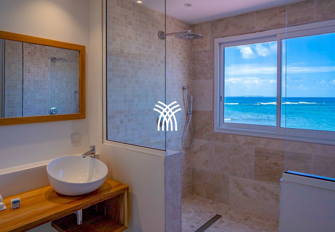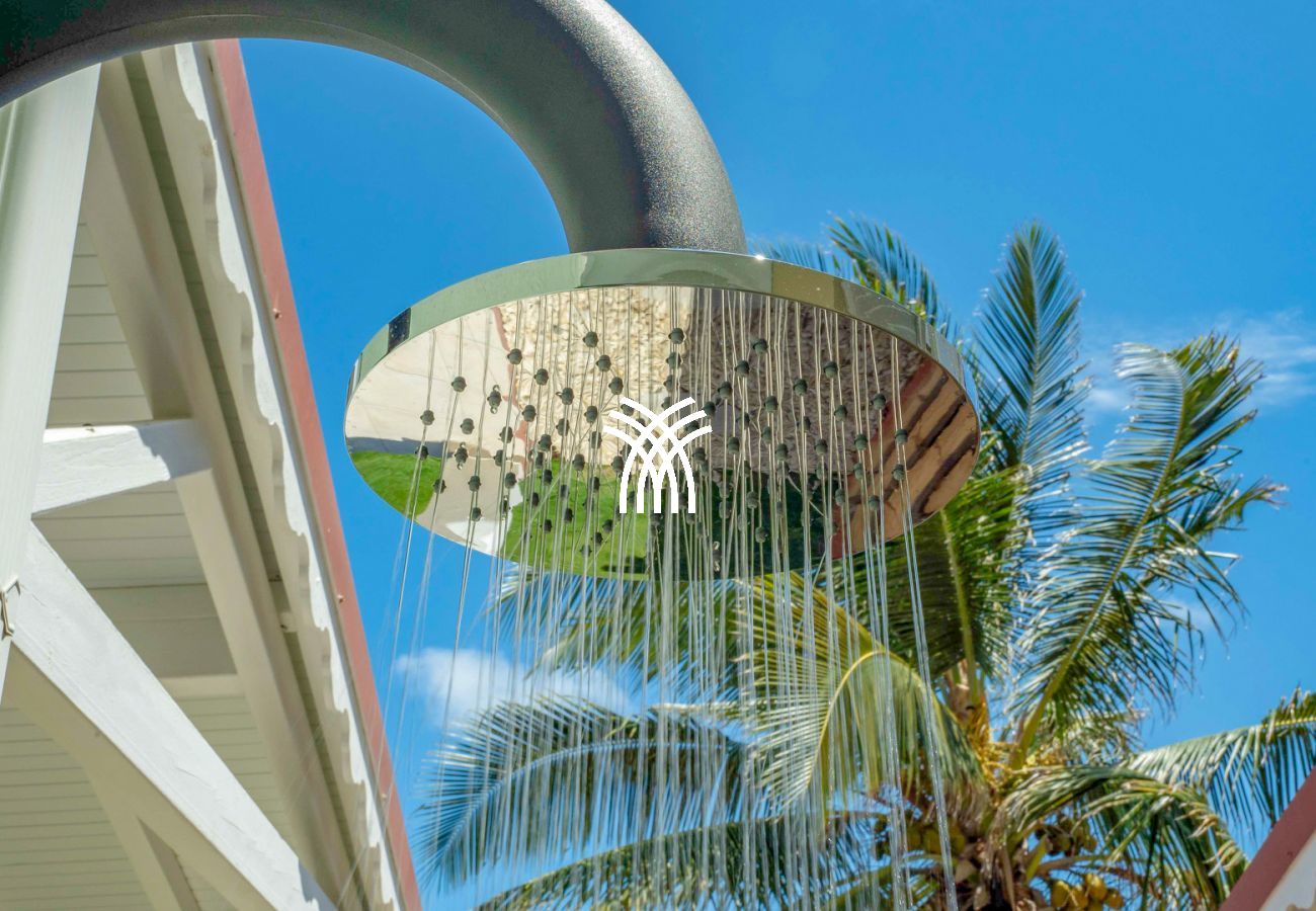 À l’extérieur, tout est pensé pour le plaisir des sens : un bac à punch pour se rafraîchir à toute heure, une douche extérieure pour se délasser après la plage, un barbecue à gaz pour vos soirées caribéennes, et des transats disposés sous le soleil pour admirer les nuances changeantes du ciel. Chaque détail a été soigneusement imaginé pour faire de cette villa de luxe en Guadeloupe un lieu de vie aussi élégant que chaleureux.
