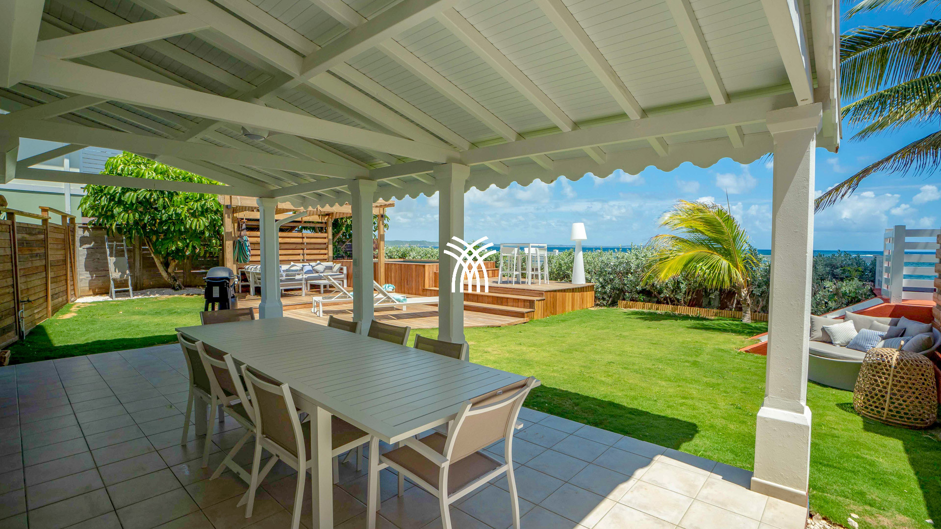 Derrière ses volets blancs et sa façade baignée de lumière, la villa s’ouvre sur un vaste séjour prolongé par une cuisine moderne entièrement équipée, pensée pour les moments de convivialité. Le salon s’anime au son des conversations, tandis que la grande terrasse invite à des repas en plein air sous la brise marine. Plus loin, un carbet ombragé s’avance vers le jardin et la piscine au sel, véritable cocon de fraîcheur où l’on savoure l’art du farniente entre cocotiers et reflets d’azur.