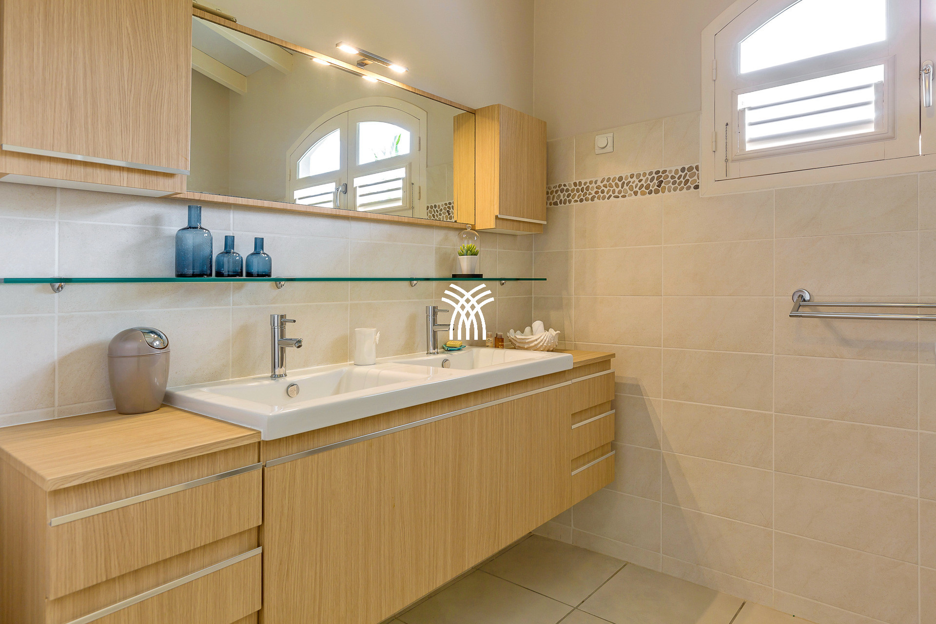 Coté logement, Trois chambres prennent place au rez-de-chaussée ; une avec salle de bain attenante et ouverture sur la terrasse. Les deux autres se font face et sont séparées par une salle de bain et un WC indépendant. A l’étage, une grande chambre dispose d’une salle de bain et d’un dressing.