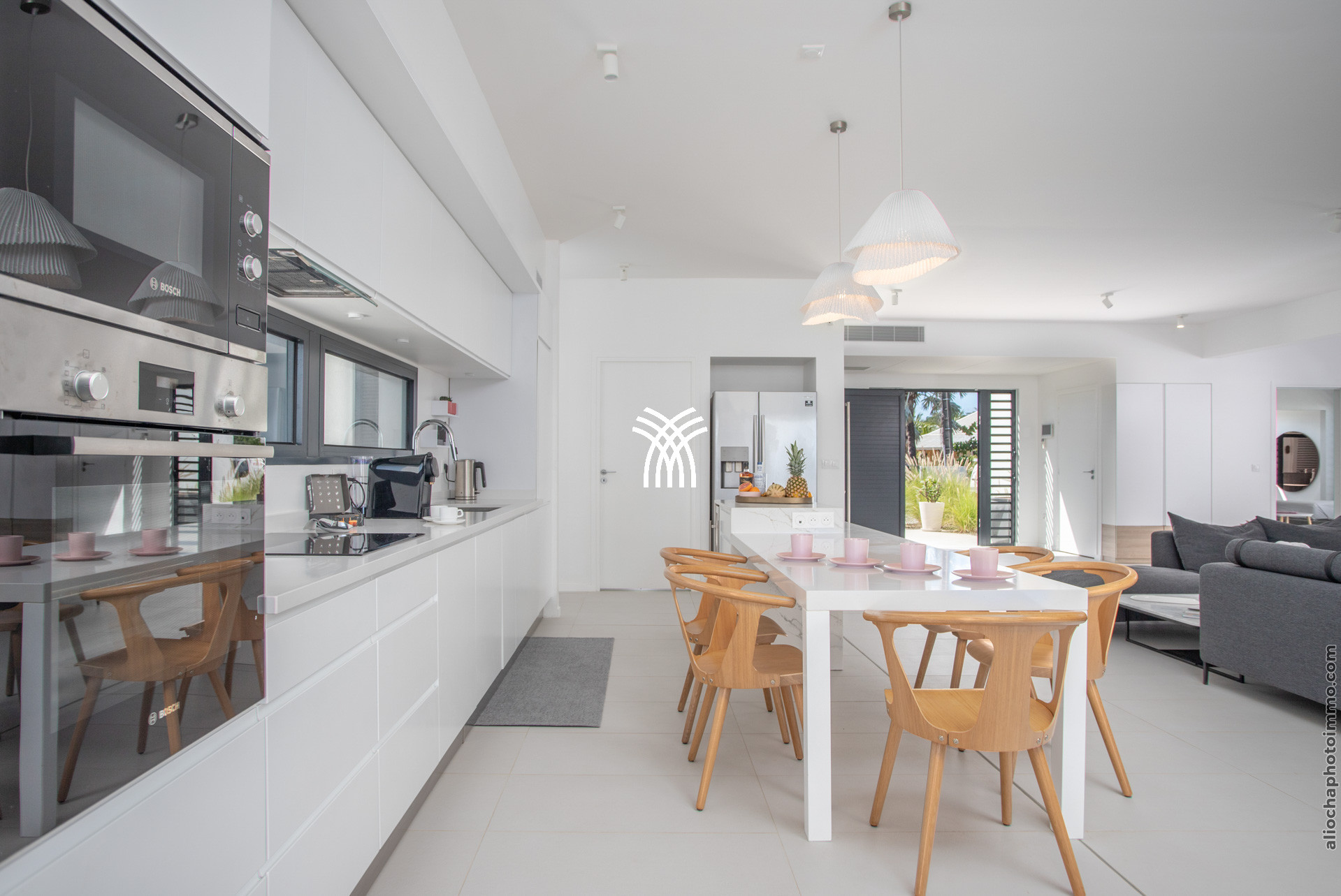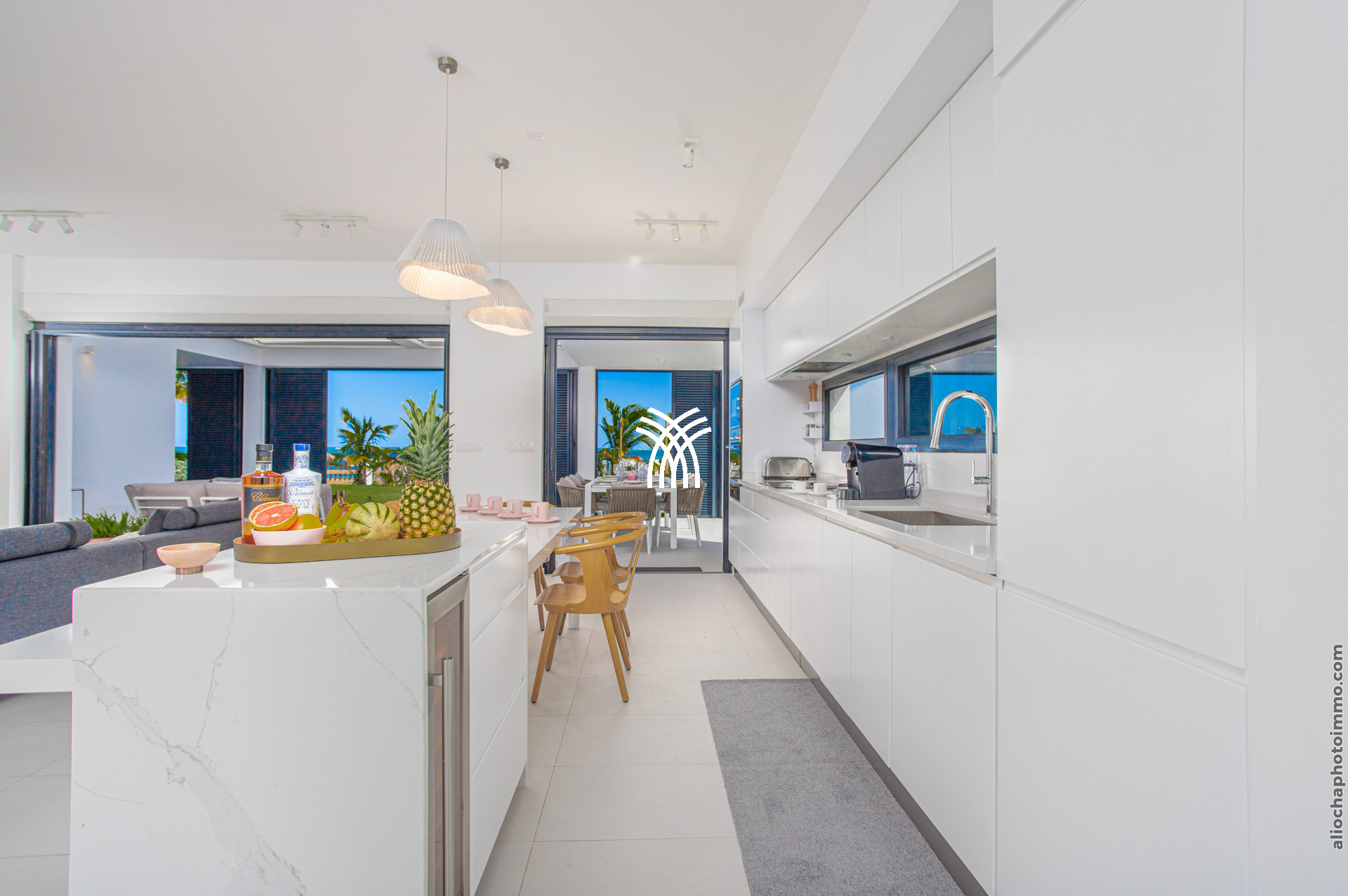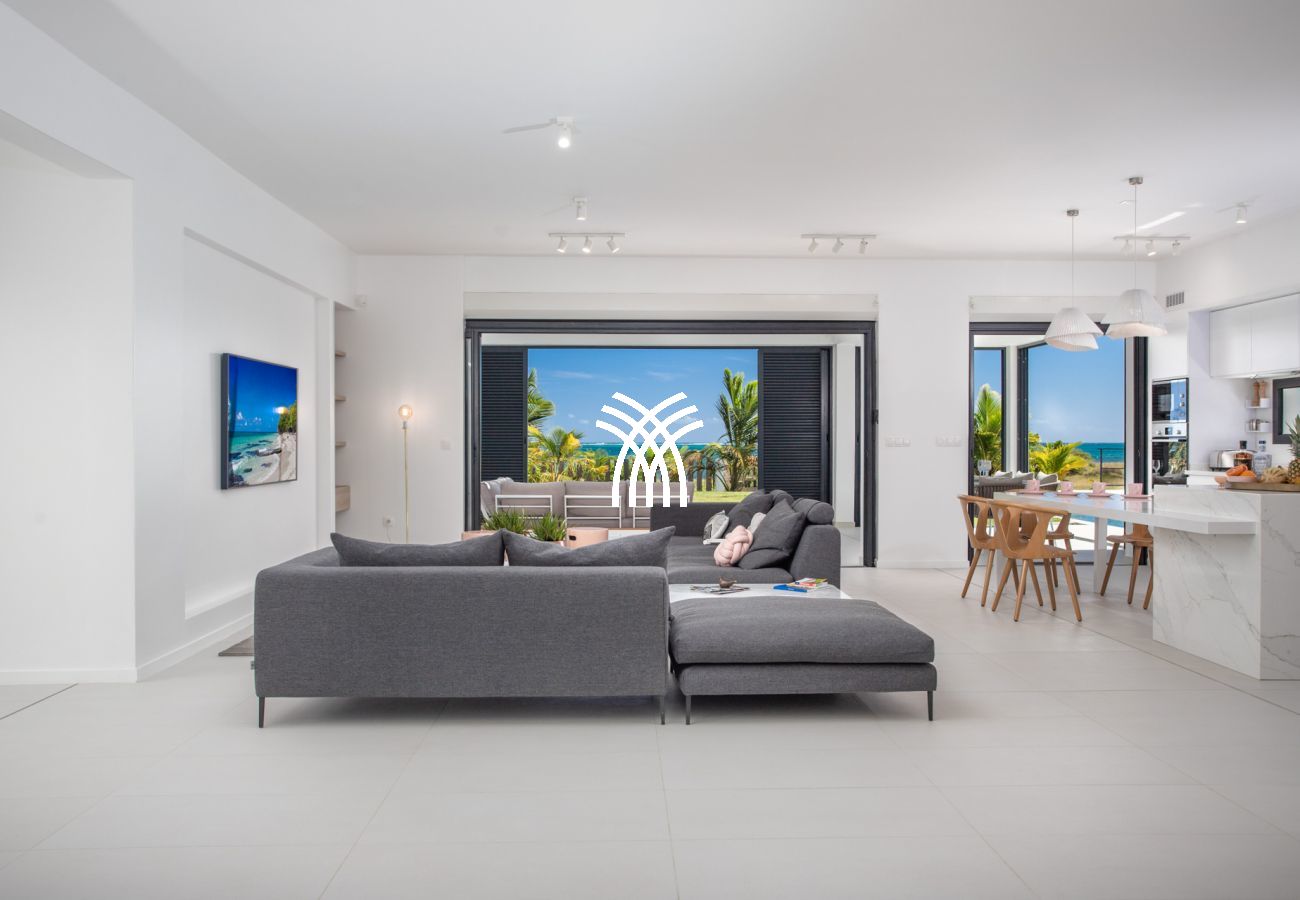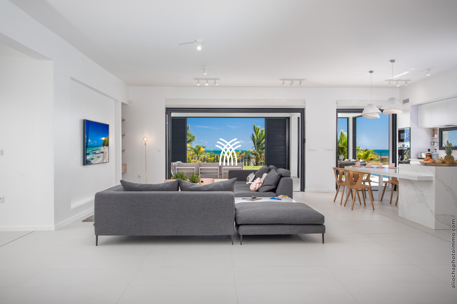 La pièce principale, conçue comme une galerie, est baignée de lumière grâce à ses grandes baies vitrées qui s’ouvrent sur l’extérieur. Ce vaste espace est pensé pour offrir une expérience de dedans-dehors, avec une vue imprenable sur la mer et un accès direct à la terrasse. Le salon, décoré avec des lignes épurées et des couleurs douces, est équipé de deux canapés face à une télévision grand écran. La cuisine ouverte, moderne et fonctionnelle, est entièrement équipée et idéale pour préparer des repas tout en profitant de la vue sur la piscine et l’horizon.