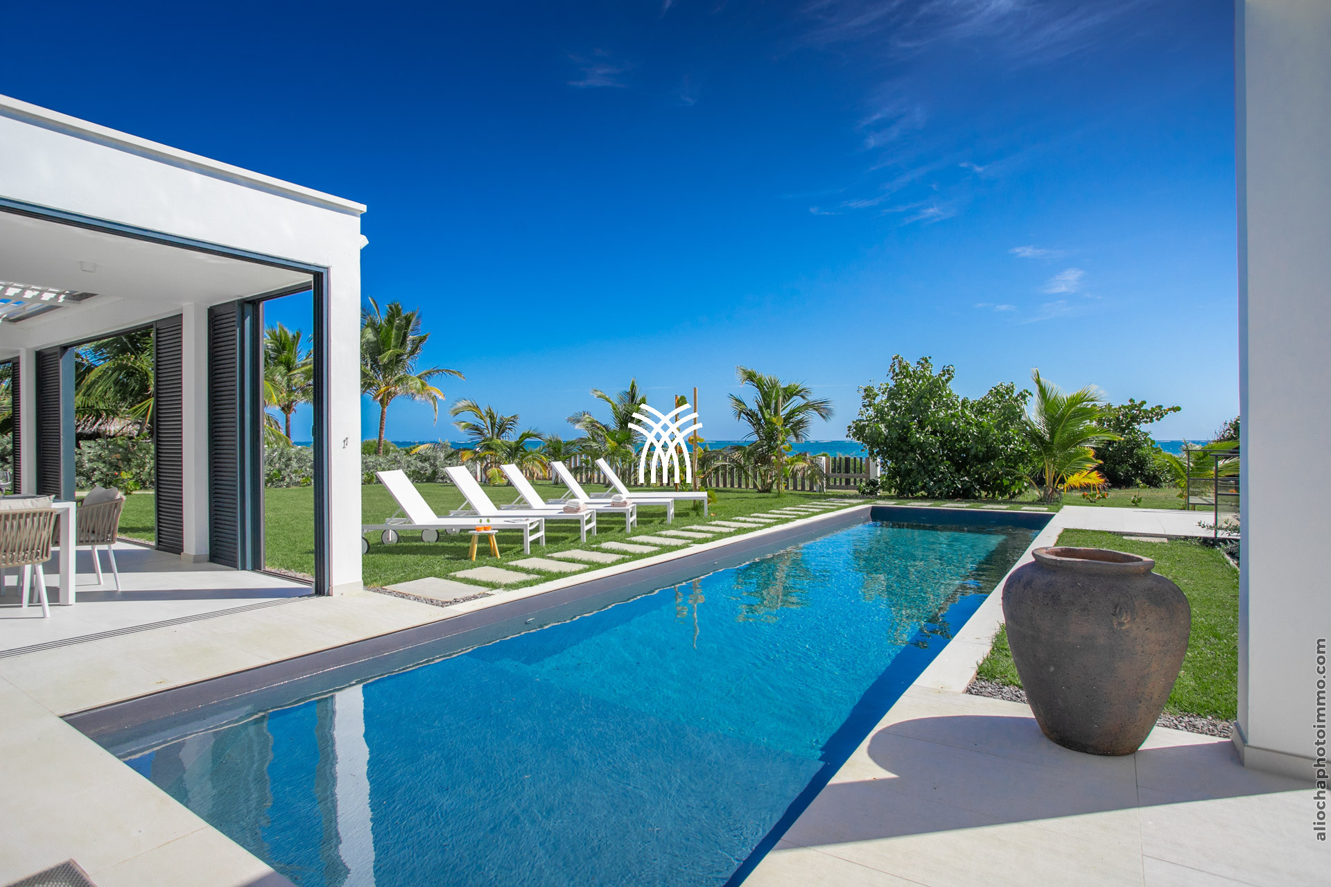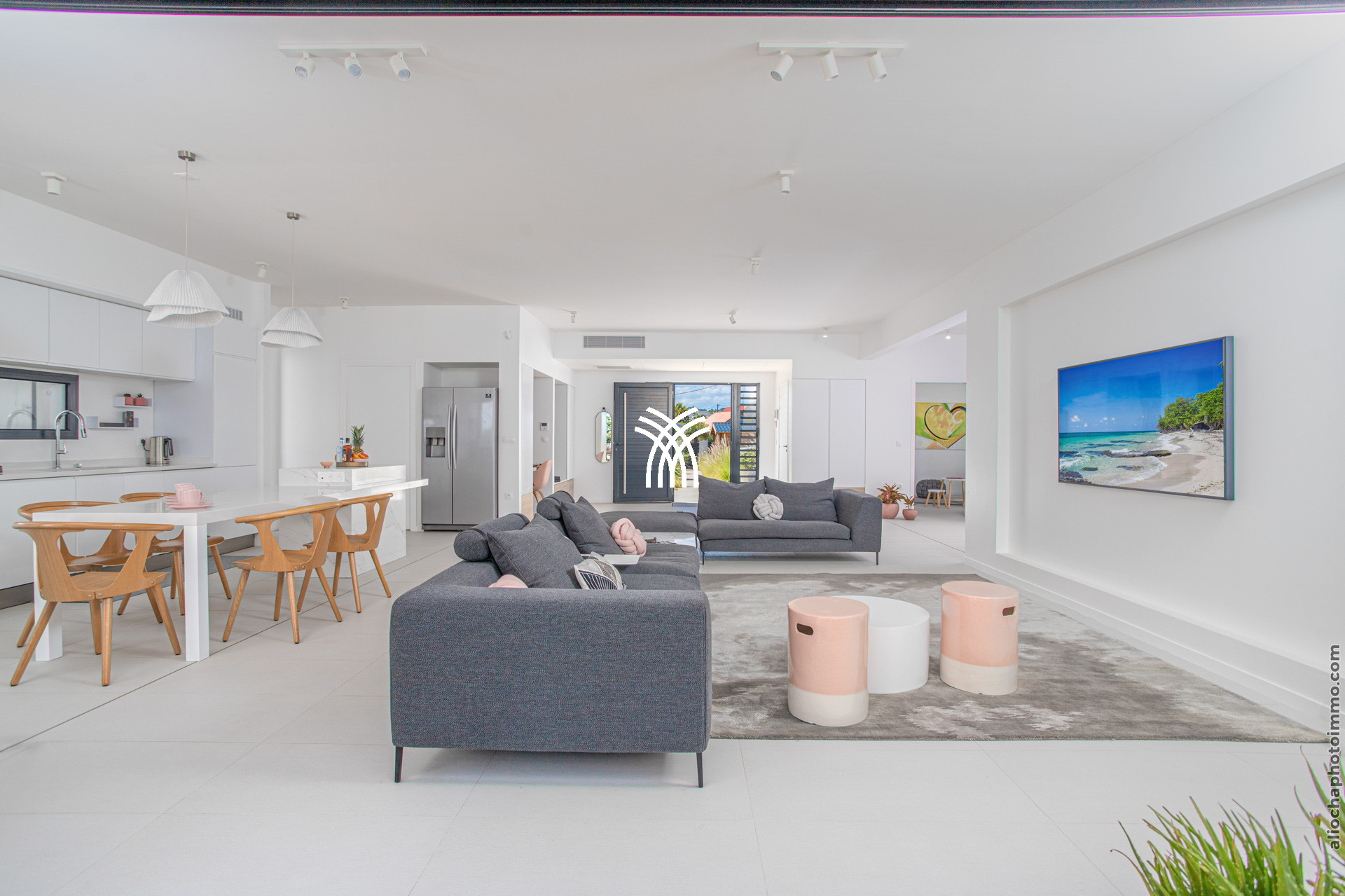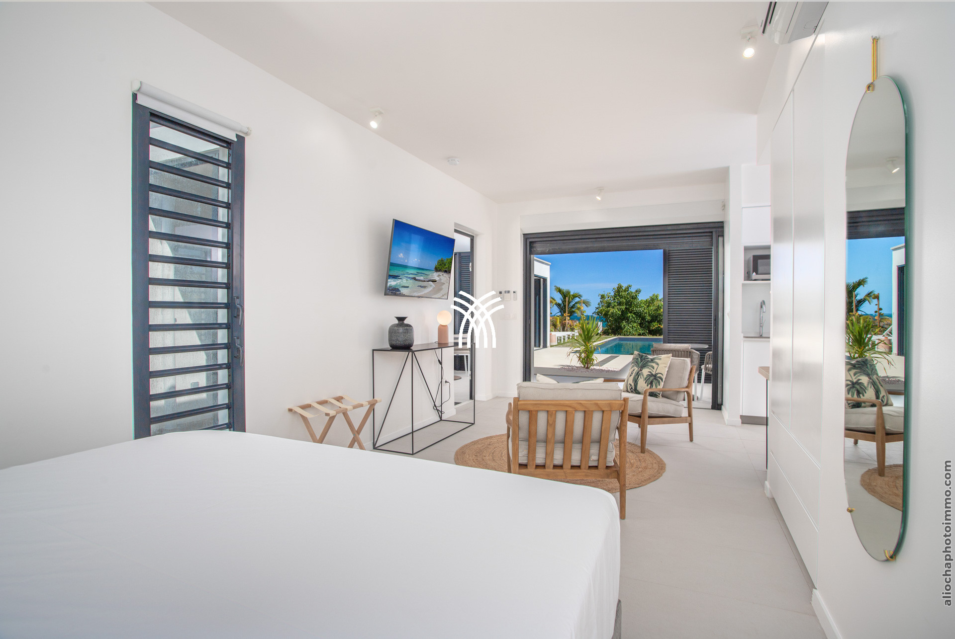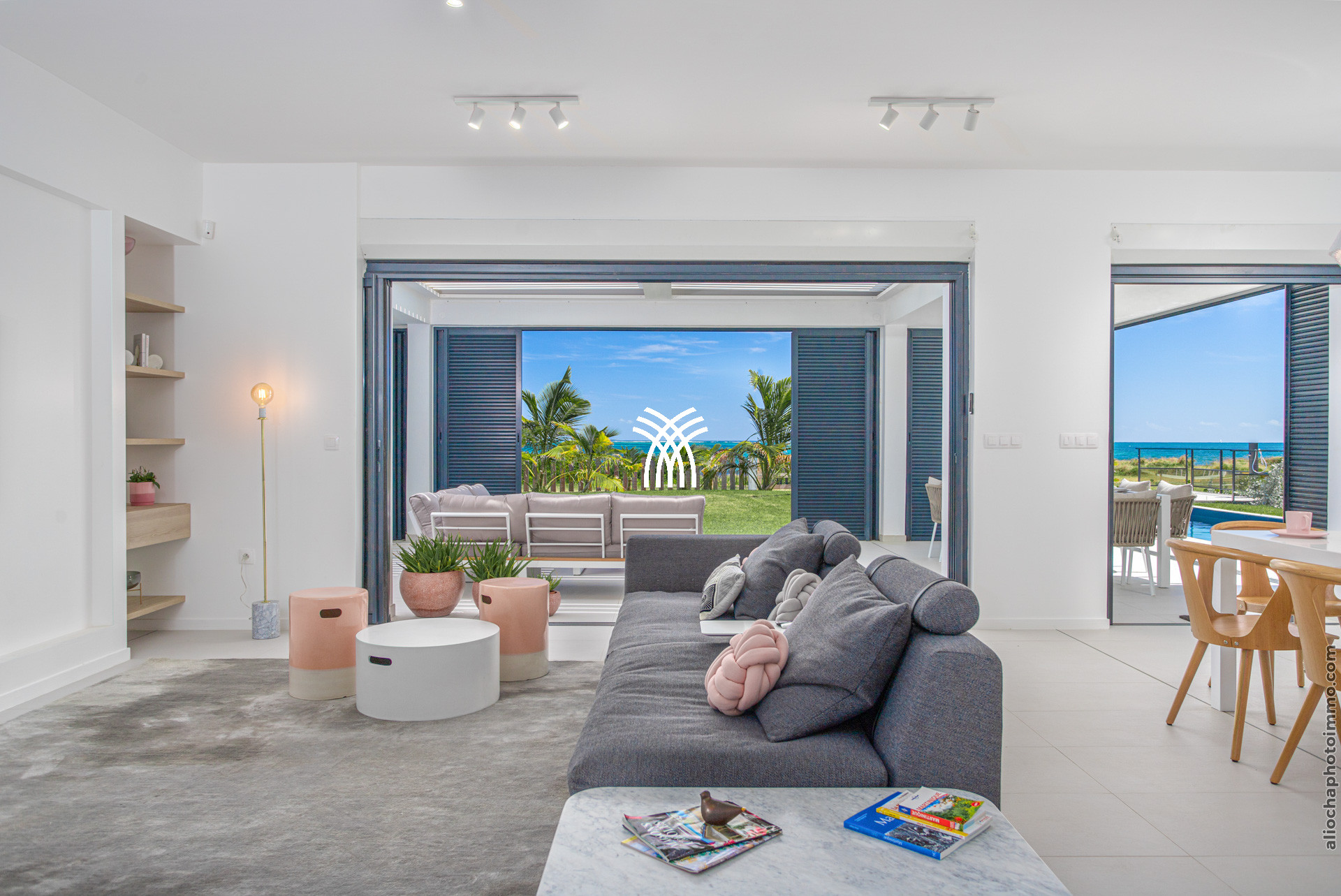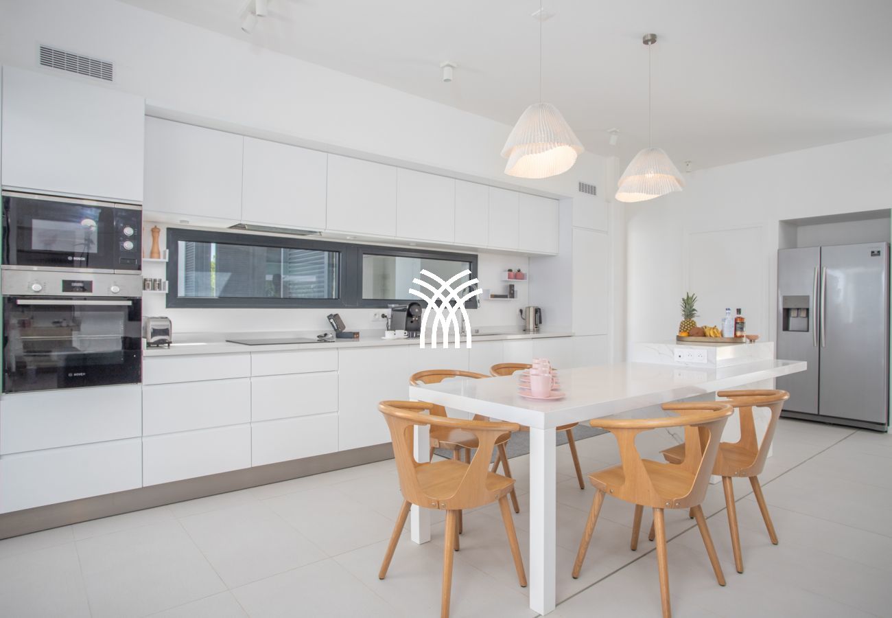 La pièce principale, conçue comme une galerie, est baignée de lumière grâce à ses grandes baies vitrées qui s’ouvrent sur l’extérieur. Ce vaste espace est pensé pour offrir une expérience de dedans-dehors, avec une vue imprenable sur la mer et un accès direct à la terrasse. Le salon, décoré avec des lignes épurées et des couleurs douces, est équipé de deux canapés face à une télévision grand écran. La cuisine ouverte, moderne et fonctionnelle, est entièrement équipée et idéale pour préparer des repas tout en profitant de la vue sur la piscine et l’horizon.