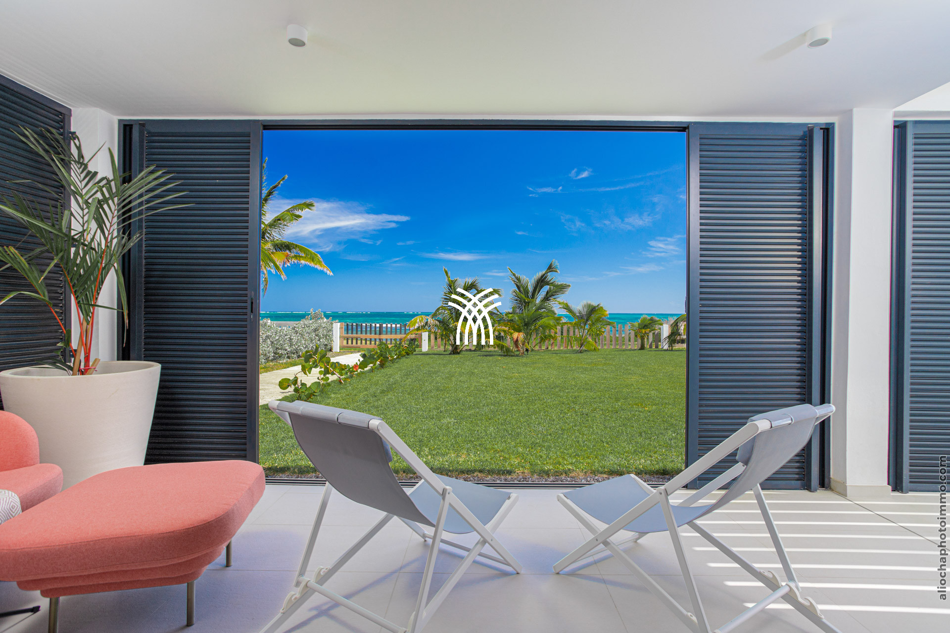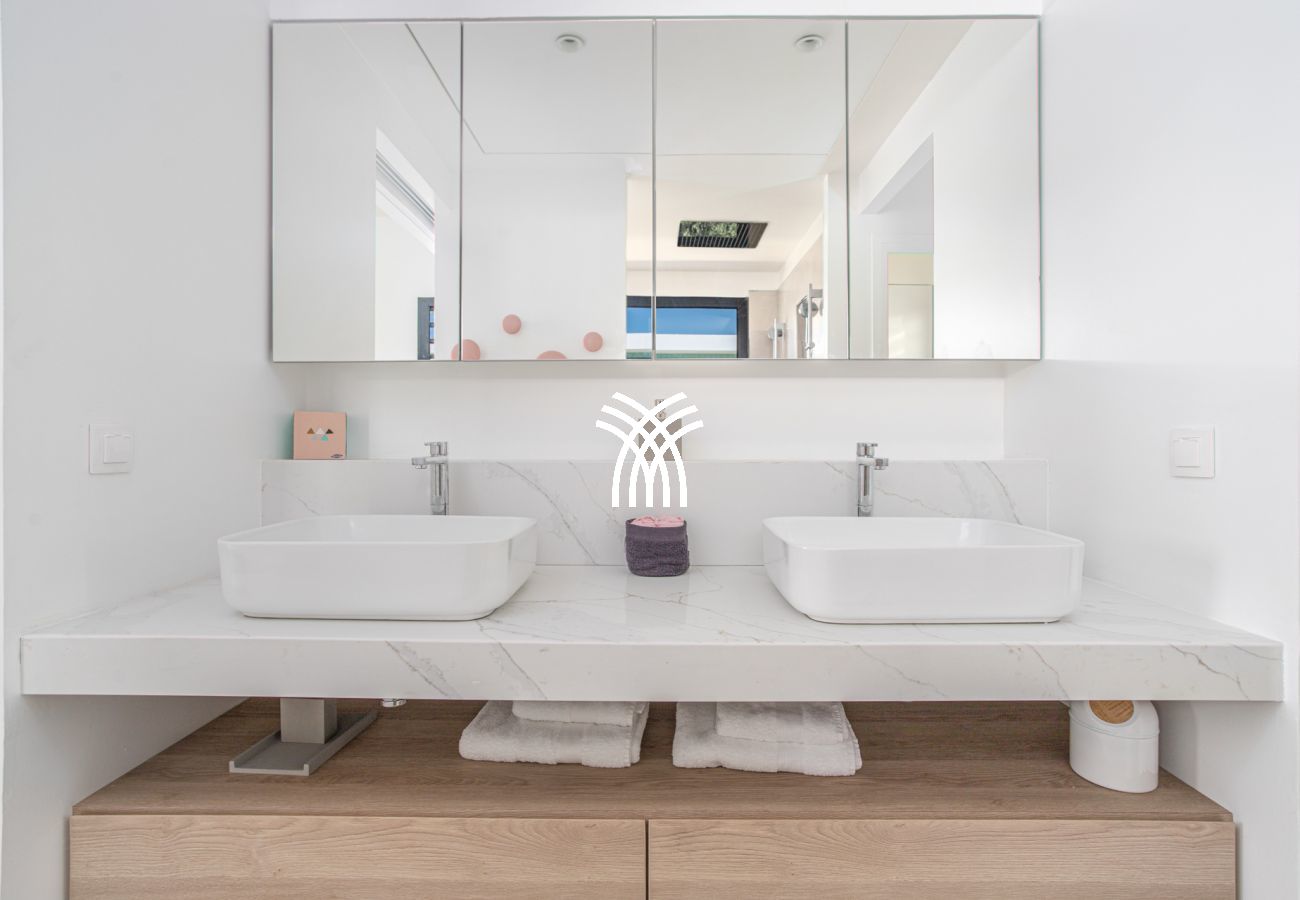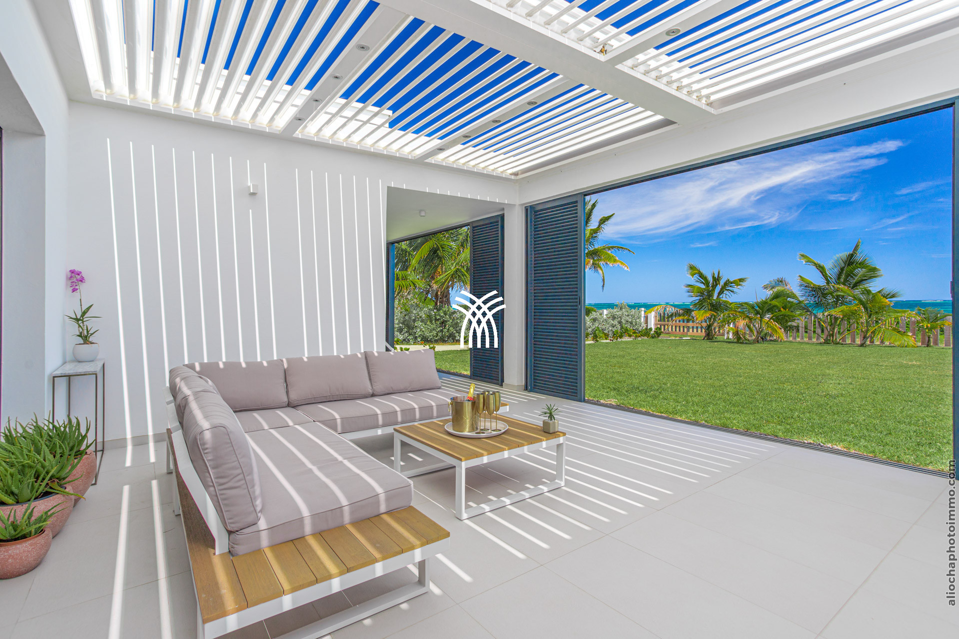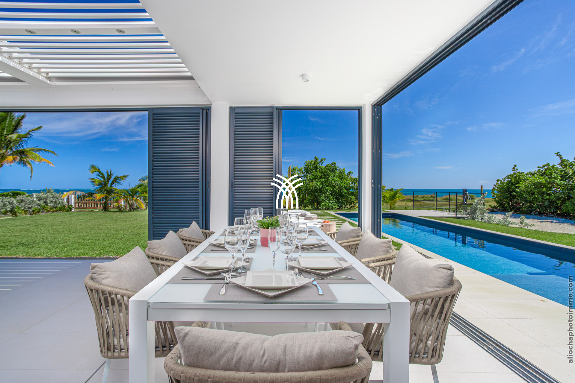 La pièce principale, conçue comme une galerie, est baignée de lumière grâce à ses grandes baies vitrées qui s’ouvrent sur l’extérieur. Ce vaste espace est pensé pour offrir une expérience de dedans-dehors, avec une vue imprenable sur la mer et un accès direct à la terrasse. Le salon, décoré avec des lignes épurées et des couleurs douces, est équipé de deux canapés face à une télévision grand écran. La cuisine ouverte, moderne et fonctionnelle, est entièrement équipée et idéale pour préparer des repas tout en profitant de la vue sur la piscine et l’horizon.