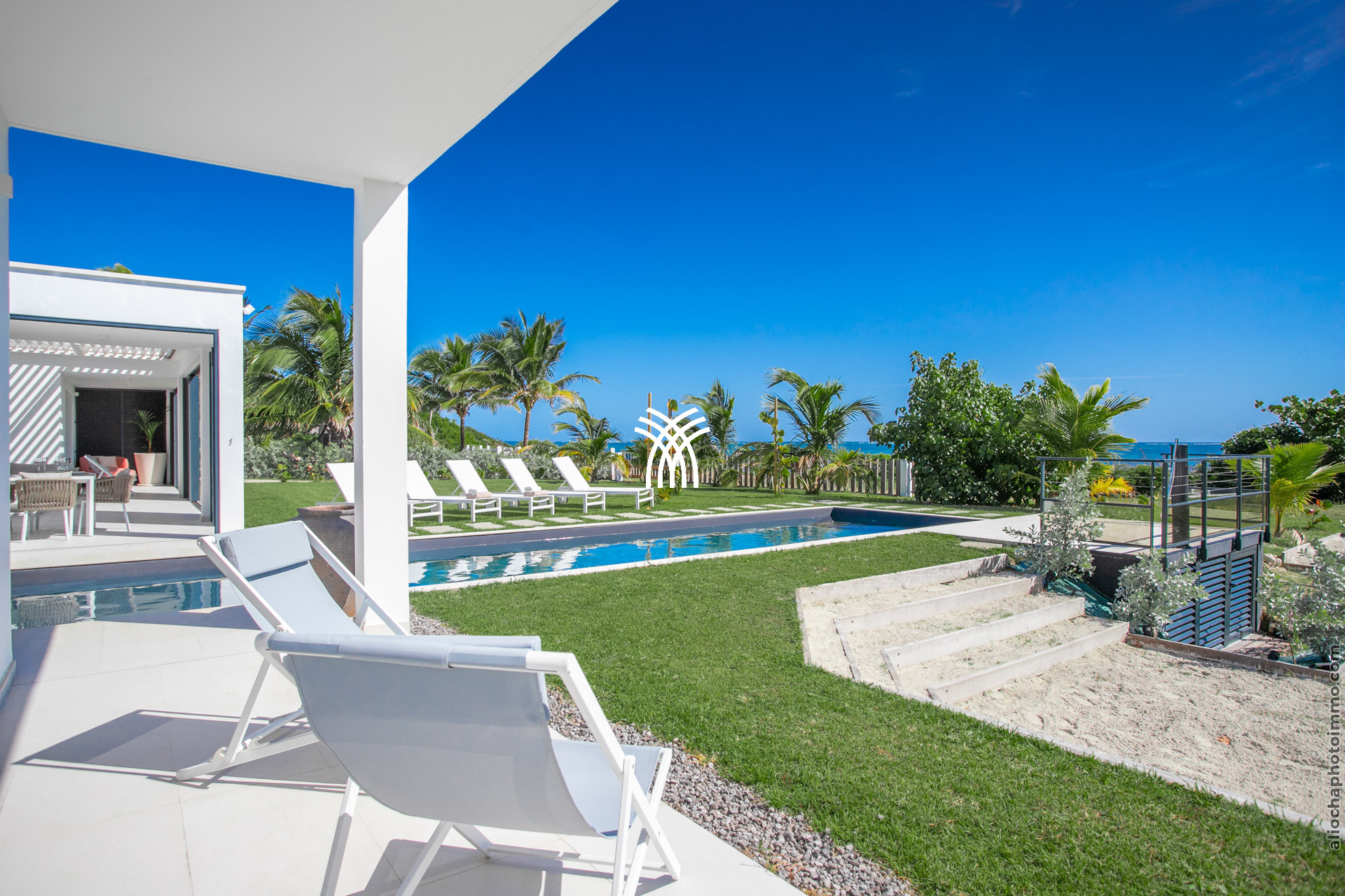 Le jardin paysager de 2000 m² abrite une magnifique piscine de 12m x 3m, bordée de transats pour des moments de détente face à la mer. La vaste terrasse, avec sa pergola à lames orientables, est parfaite pour des repas en plein air ou simplement pour siroter un cocktail en admirant le coucher du soleil.