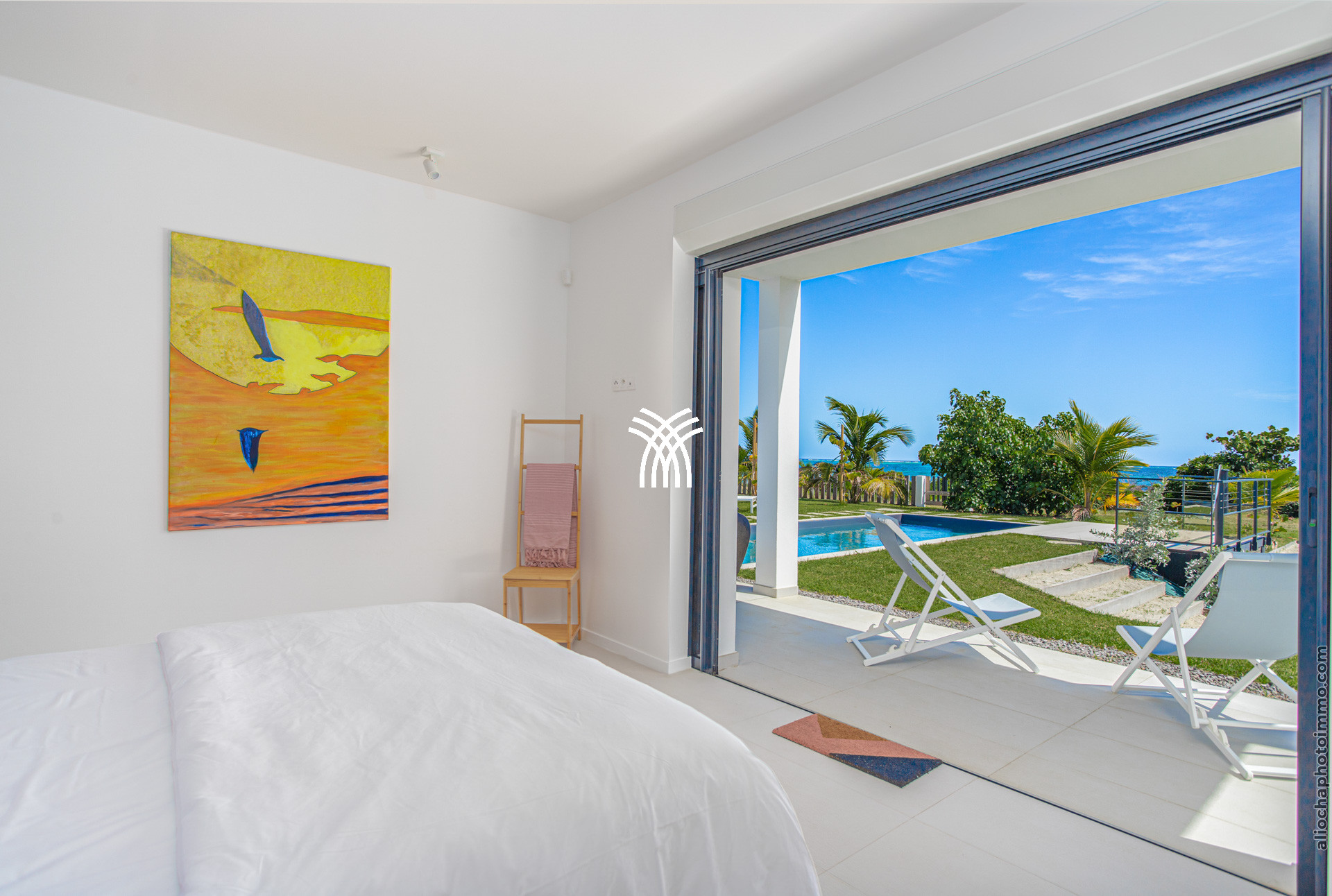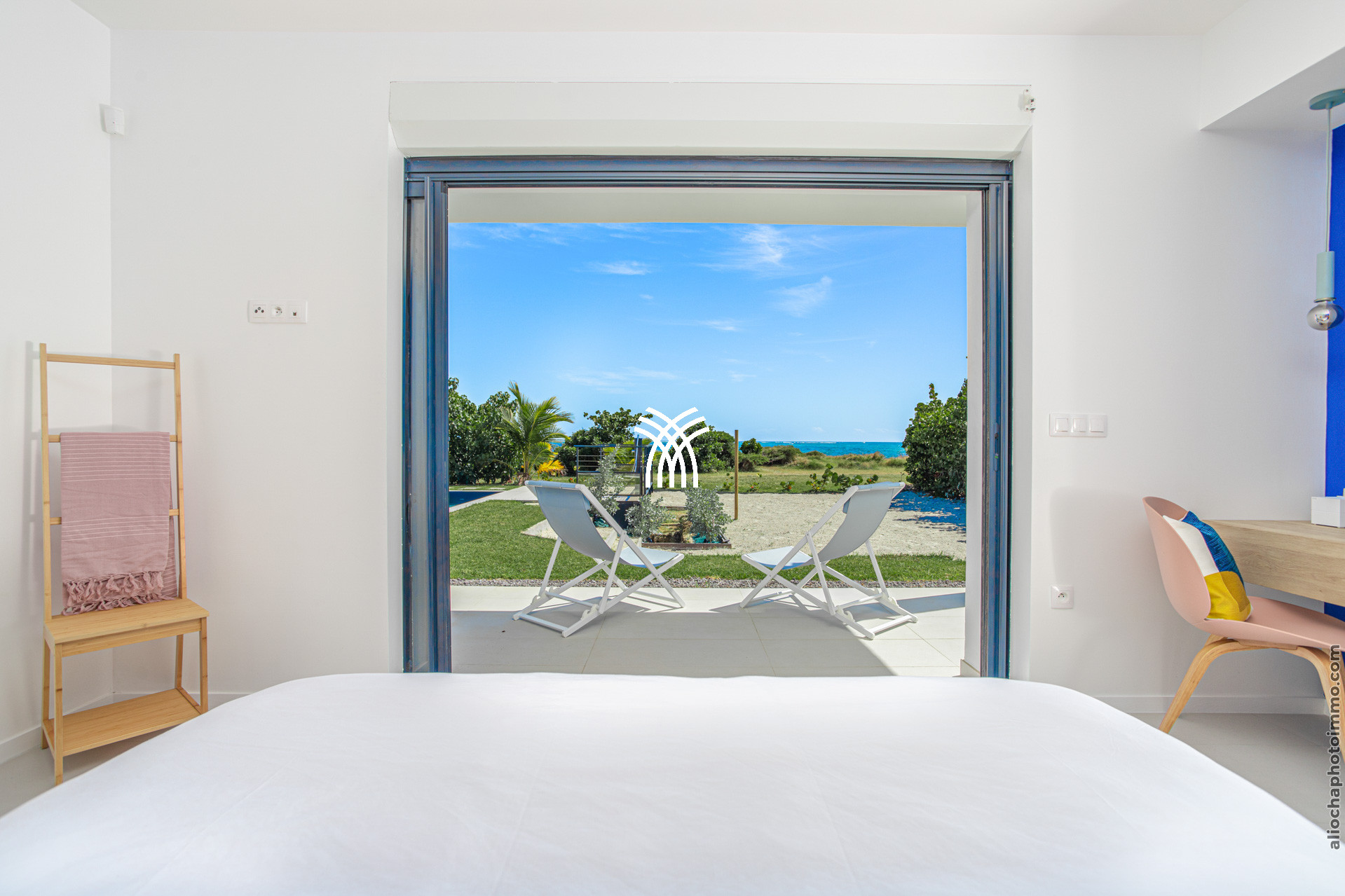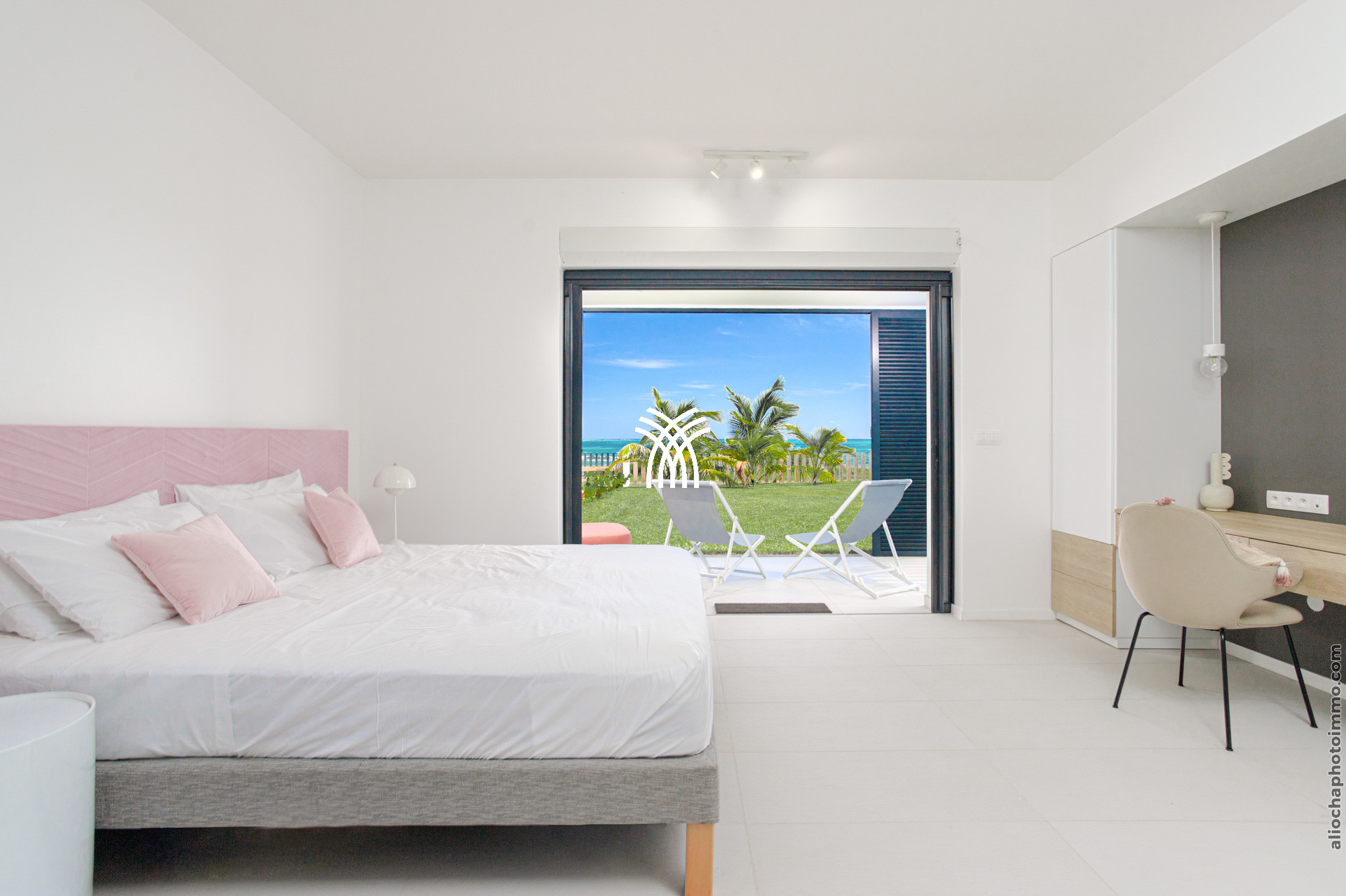 La troisième chambre, avec un lit king-size 180x200, offre une vue spectaculaire sur l’océan et dispose d’un espace bureau, d’une télévision et d’un accès à la terrasse pour profiter du grand air marin.