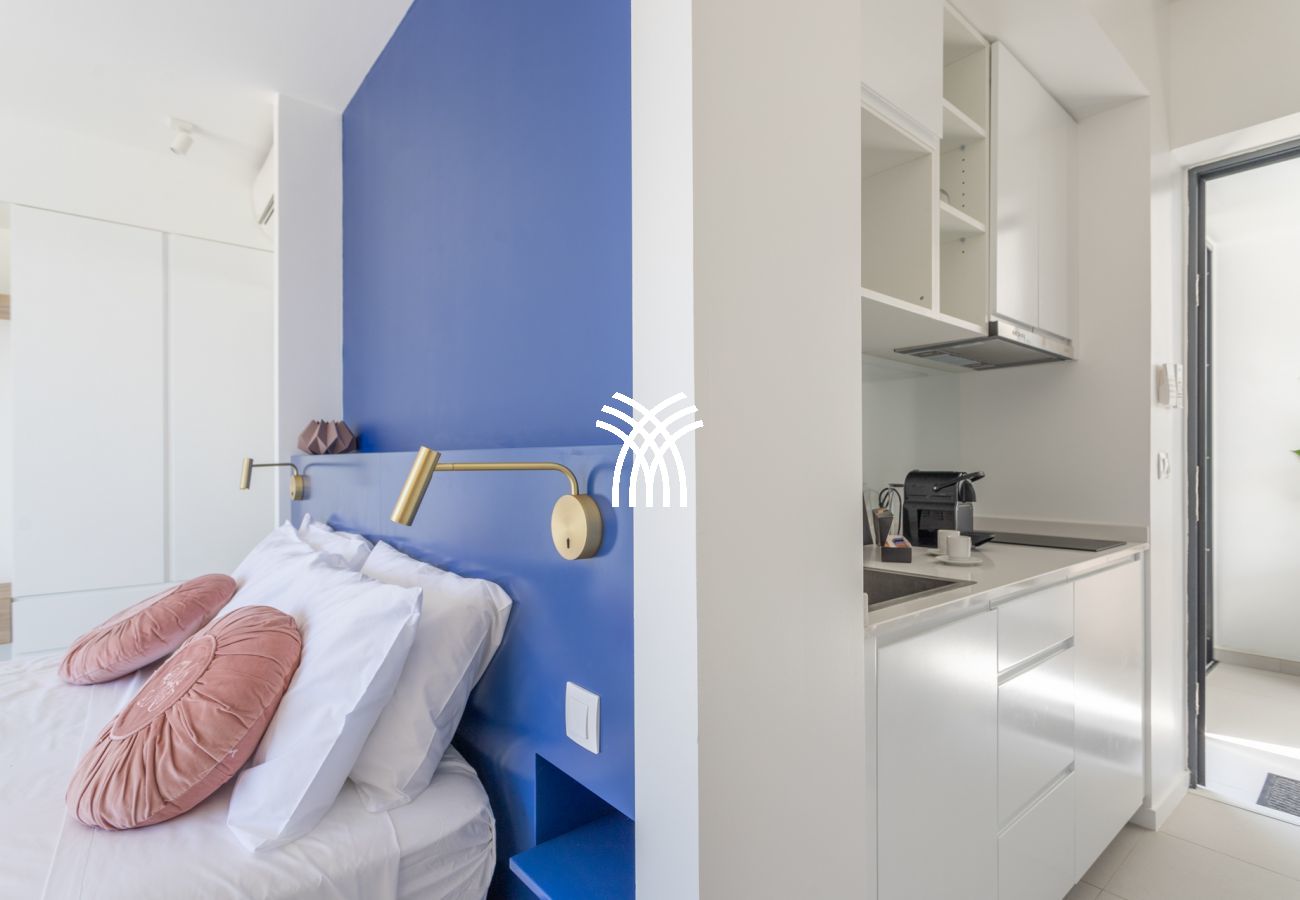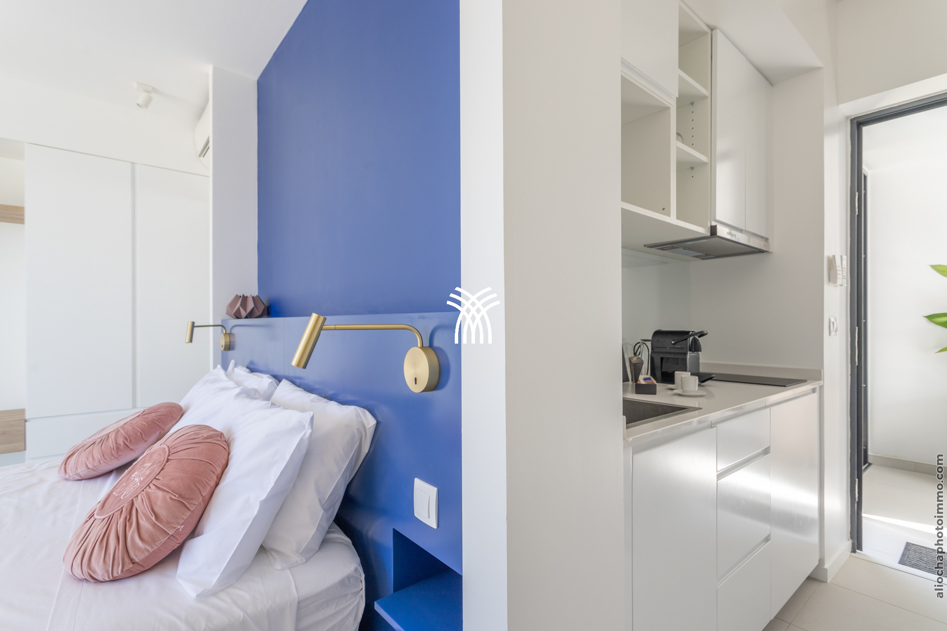 La première chambre, avec un lit double 160x200, offre une kitchenette et un accès direct à une terrasse privée équipée de transats face à la mer.