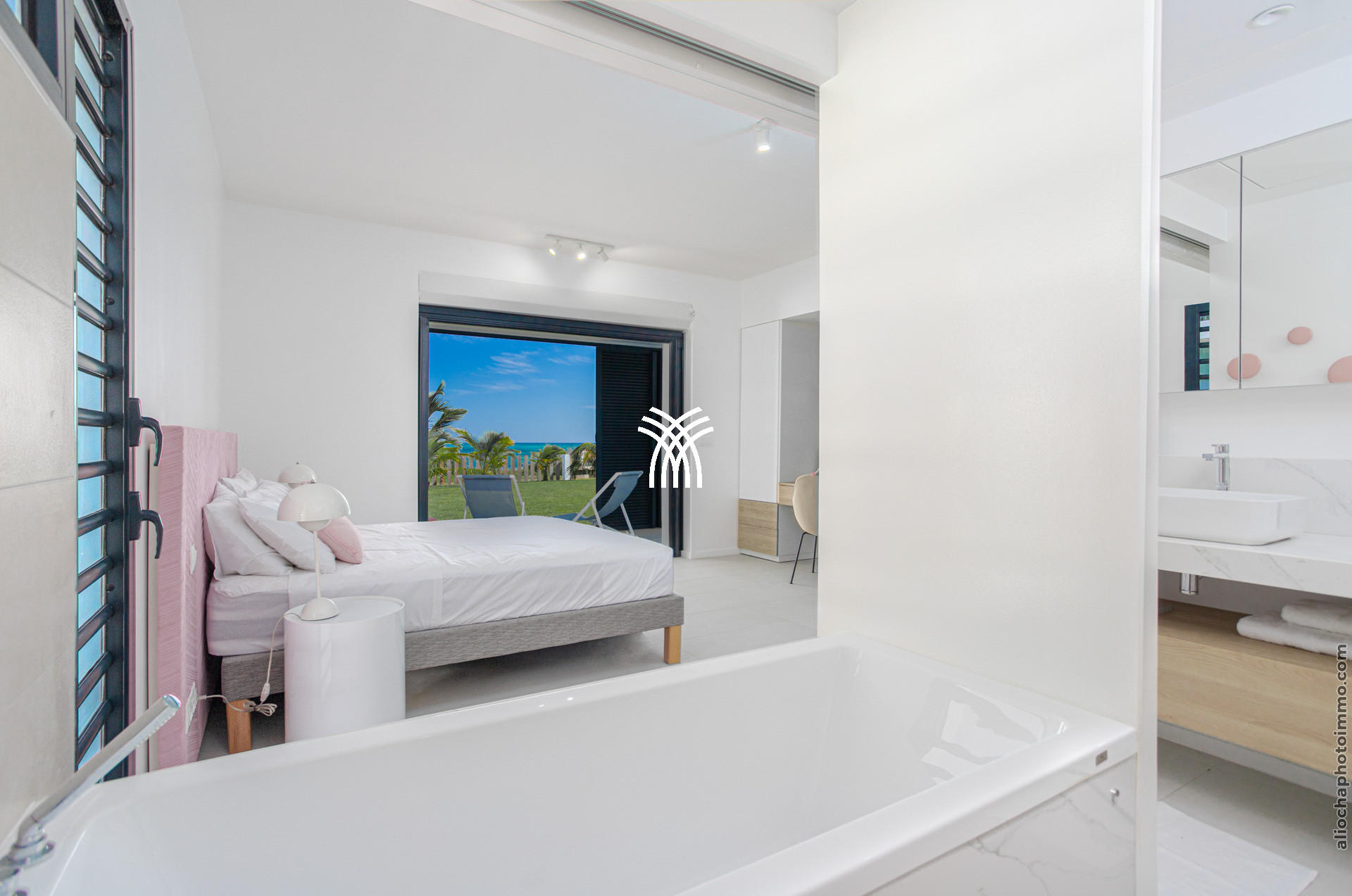 La quatrième chambre, aménagée en suite luxueuse, dispose d’un lit king-size, d’un espace TV, d’une kitchenette, et d'une salle de bain ouverte avec douche à l'italienne, vasque et WC. À l'extérieur, vous trouverez également une douche balnéo et une baignoire extérieure pour des moments de relaxation.