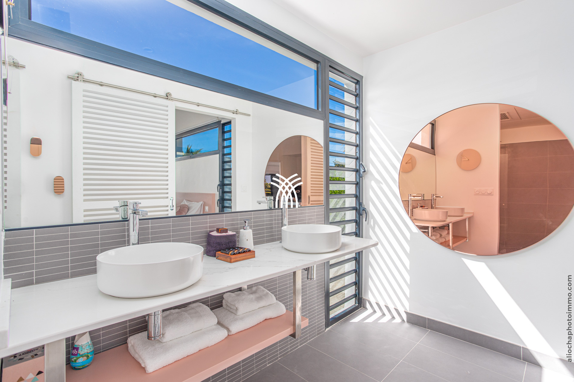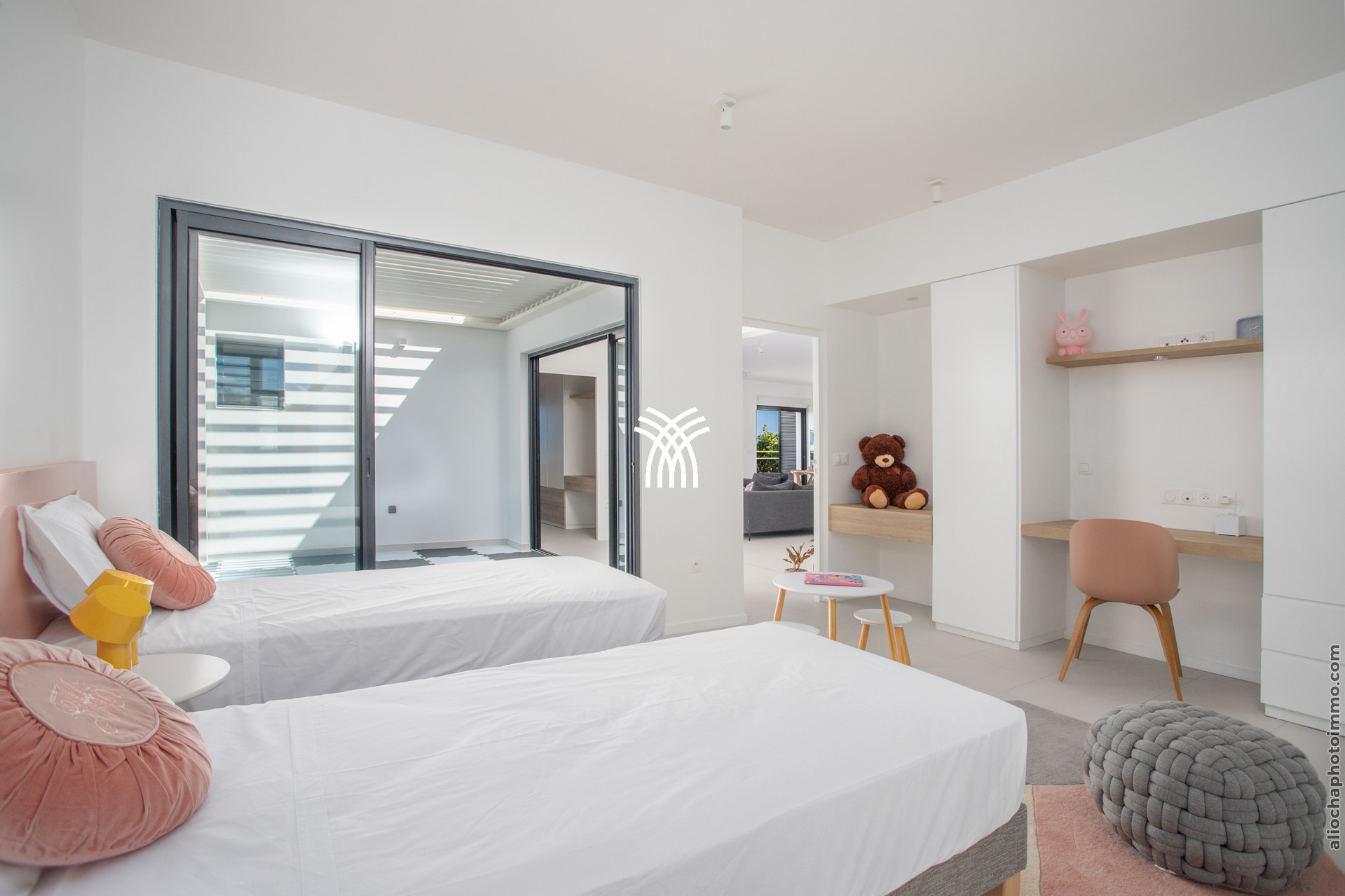 Coté logement, Trois chambres prennent place au rez-de-chaussée ; une avec salle de bain attenante et ouverture sur la terrasse. Les deux autres se font face et sont séparées par une salle de bain et un WC indépendant. A l’étage, une grande chambre dispose d’une salle de bain et d’un dressing.