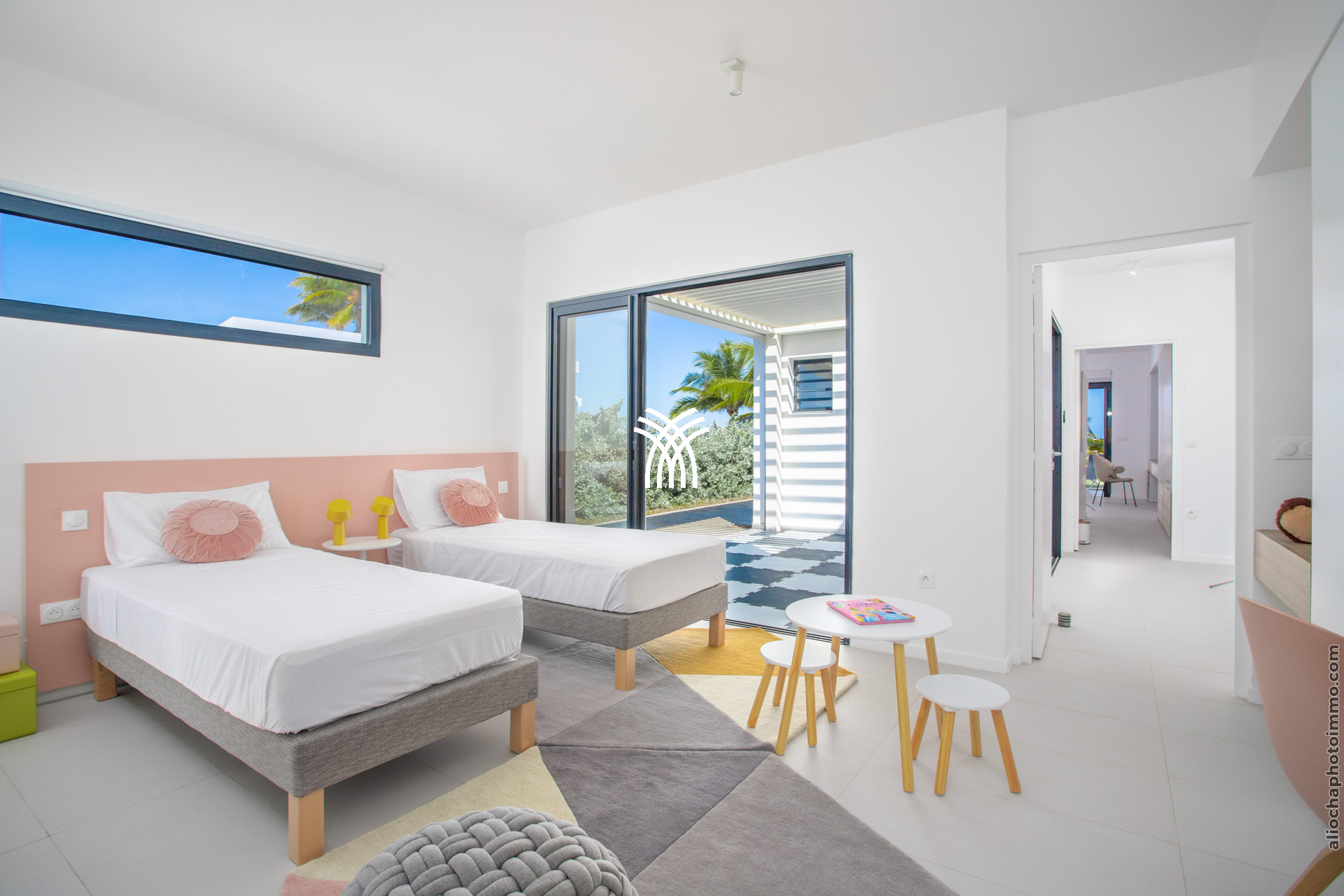 La deuxième chambre, parfaite pour deux enfants, est équipée de deux lits simples 90x190 et est orientée vers le jardin.