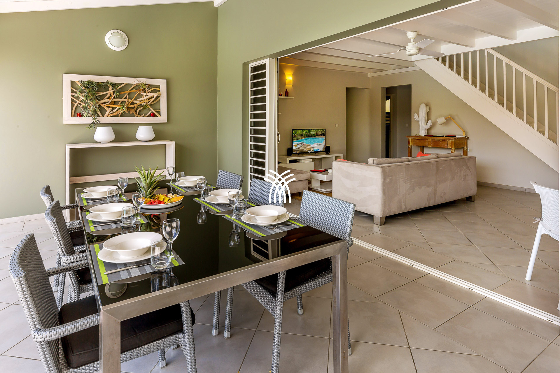 Lumineux et spacieux, le rez-de-chaussée est composé d’une cuisine entièrement équipée qui ouvre sur un extérieur présentant une piscine privée d’où vous pourrez jouir d’une vue apaisante sur la campagne tout en profitant d’un barbecue sous les rayons du soleil et de la douce chaleur des Antilles. La villa Jade Palm Martinique, mêlant modernité et touche créole, fera le bonheur des voyageurs en quête de tranquillité.