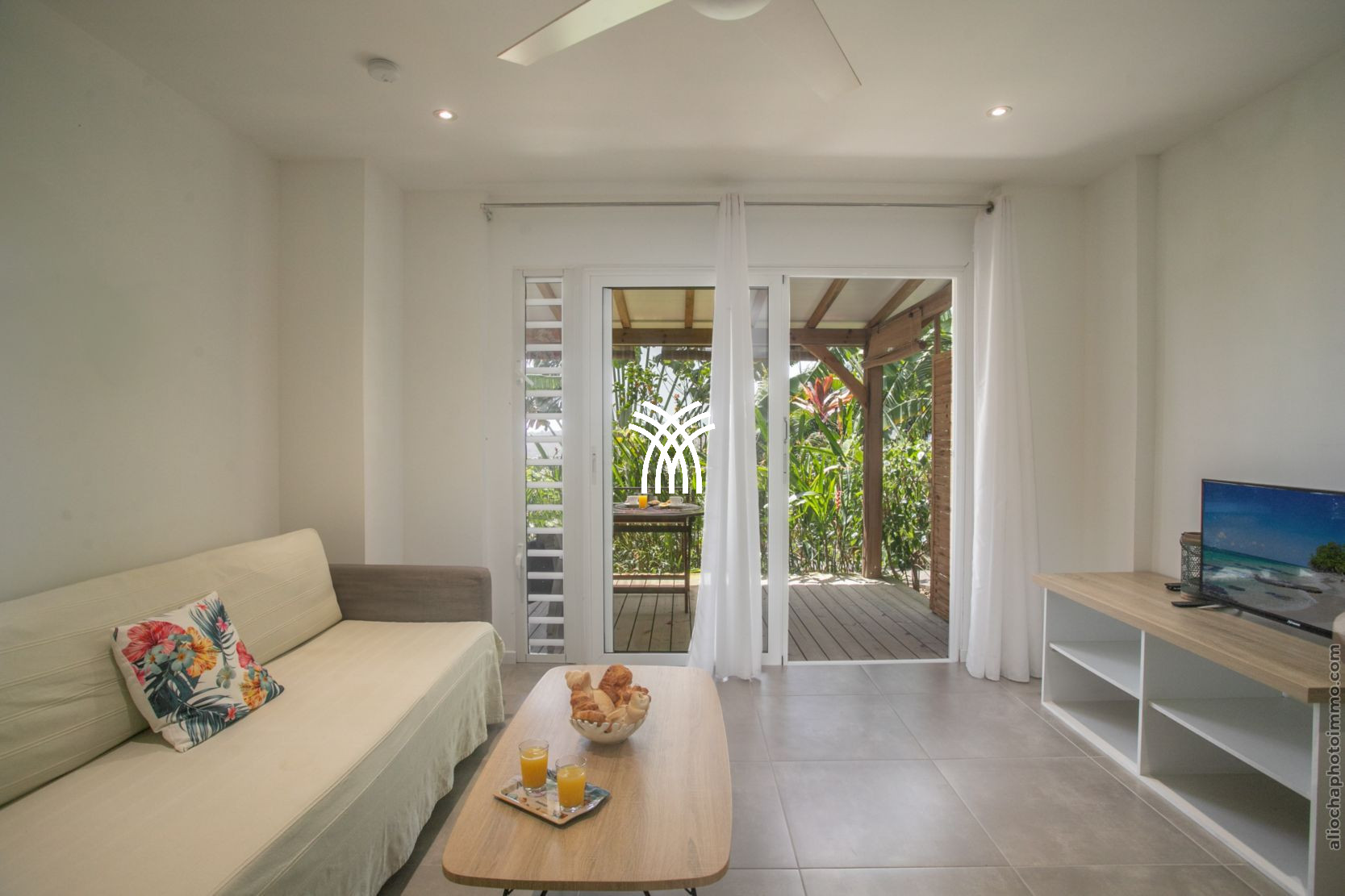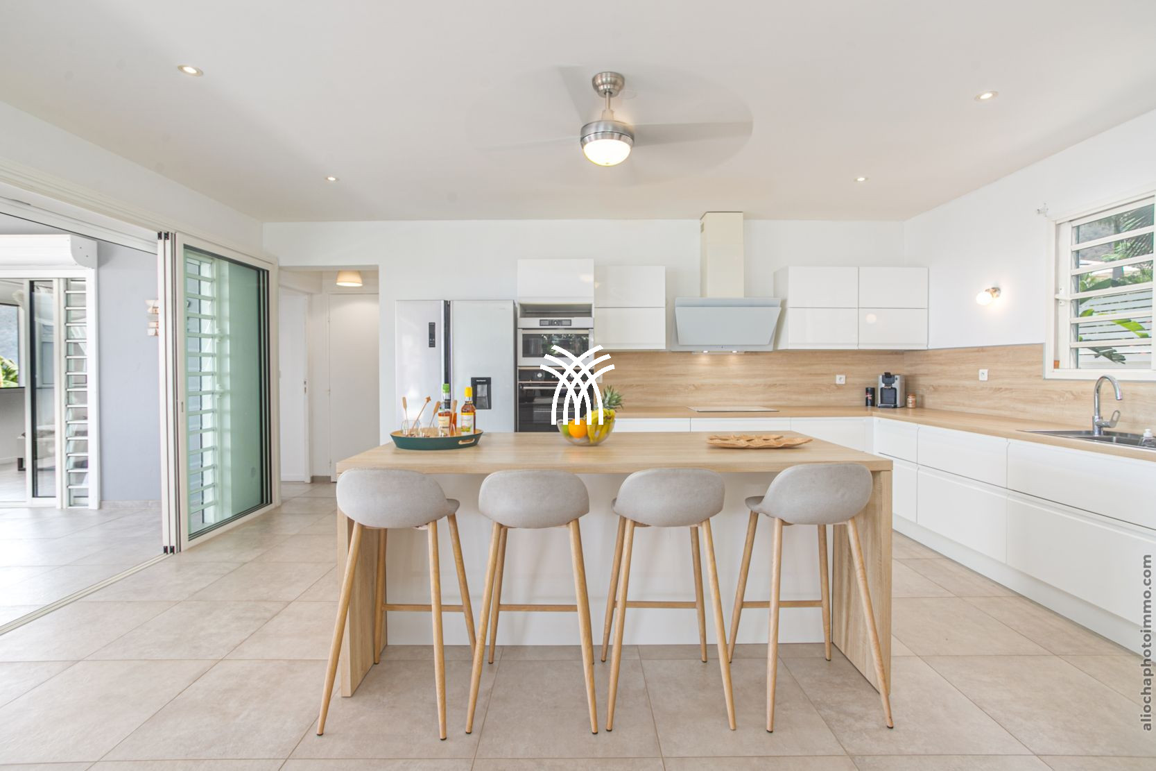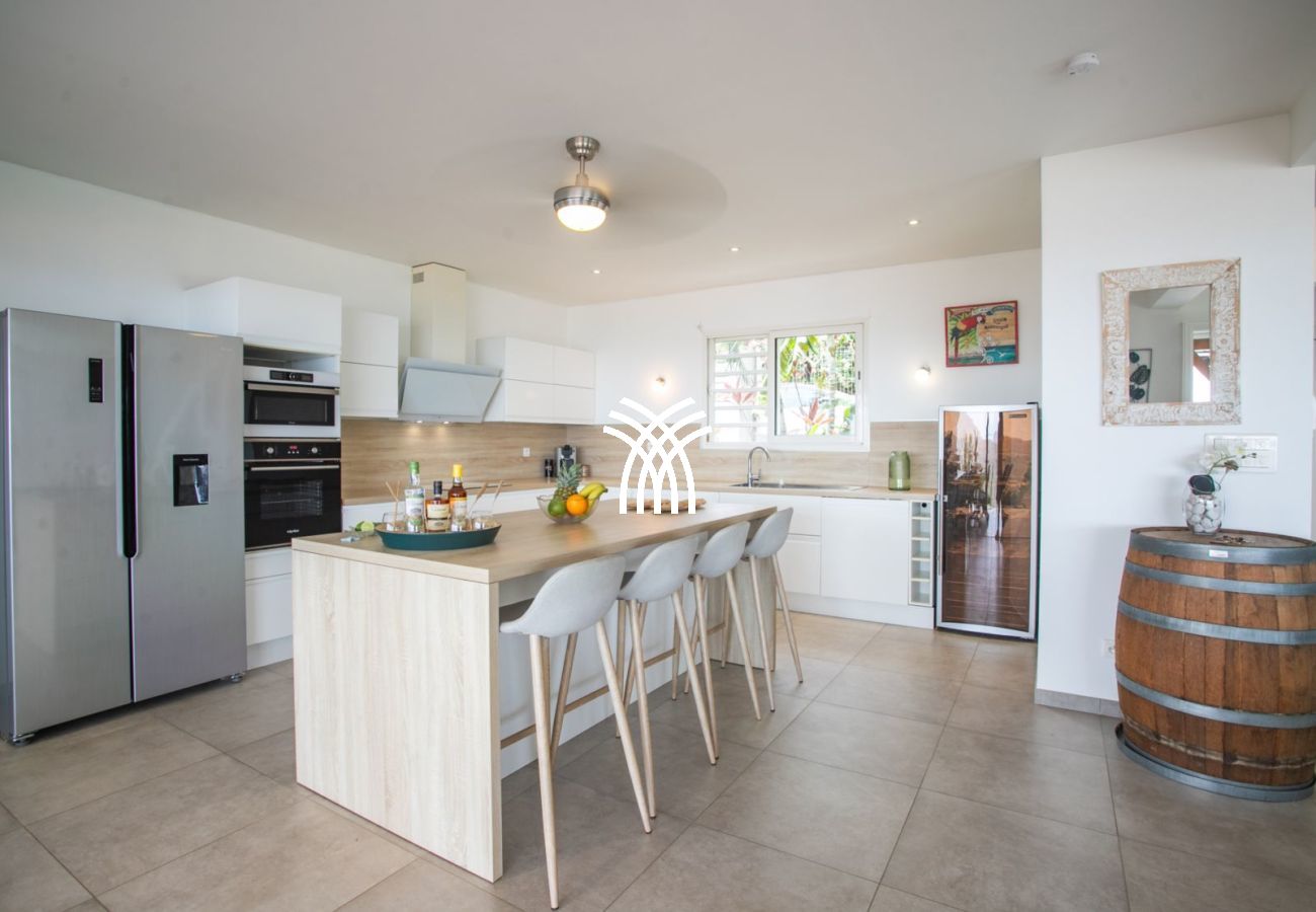 La cuisine et le salon fusionnent en une vaste pièce à vivre, offrant une vue éblouissante sur le village des Anses-d’Arlet, son église, son ponton et sa plage aux eaux turquoise. Baignée de lumière, la cuisine allie esthétisme et fonctionnalité. Les matières chaleureuses enveloppent le salon de douceur, tandis que le décor épuré accentue la sensation d’espace.