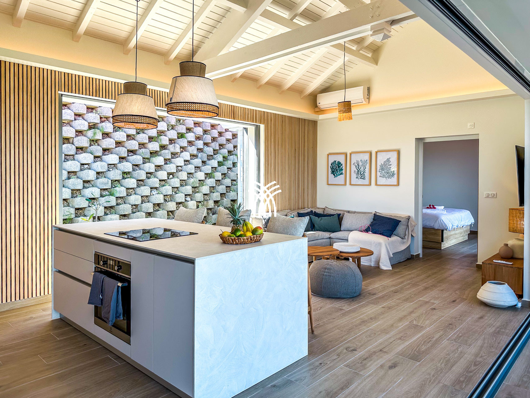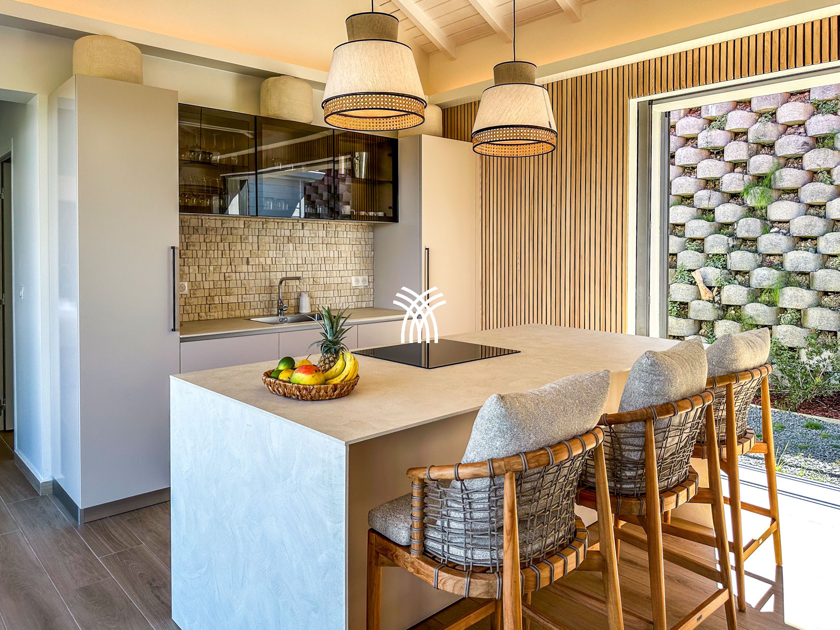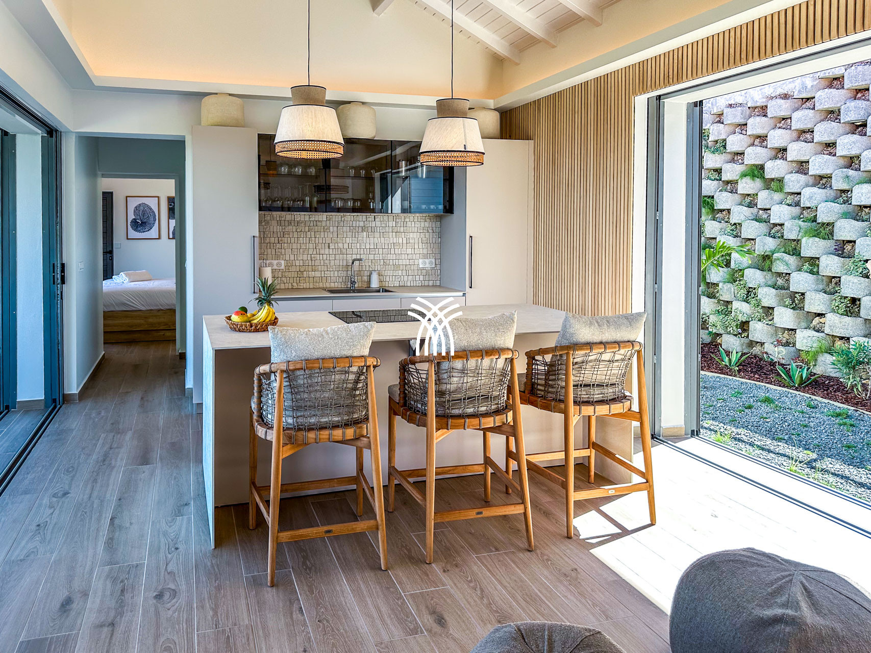 La villa Inawa séduit par son architecture contemporaine, ses lignes épurées et ses espaces baignés de lumière. Elle dispose de 100m² de confort raffiné, comprenant trois suites parentales intimistes avec lit king size et salle de bain attenante. Chaque espace de vie a été pensé pour la détente et le plaisir des sens : cuisine ouverte avec îlot central, salon élégant, terrasse panoramique, piscine à débordement et mobilier extérieur soigneusement sélectionné.