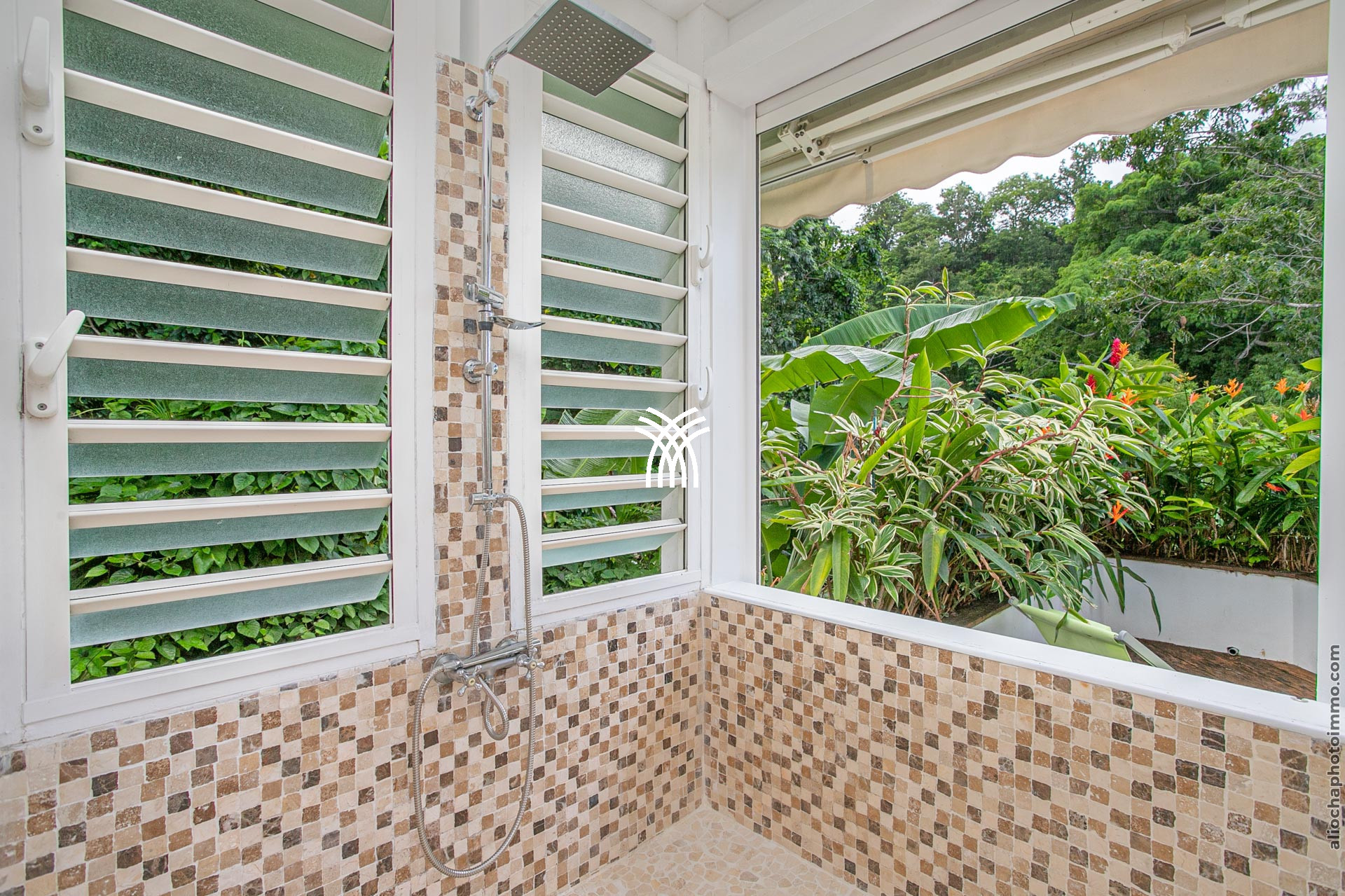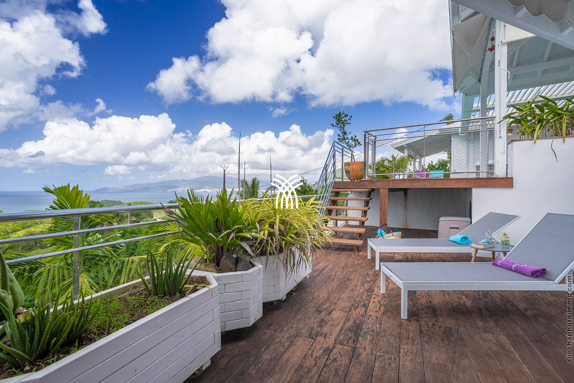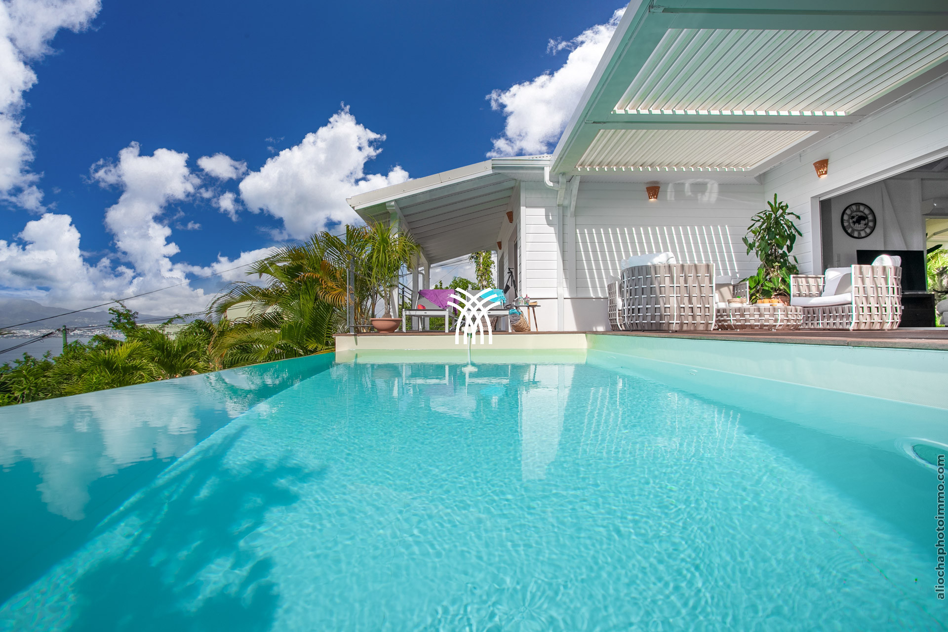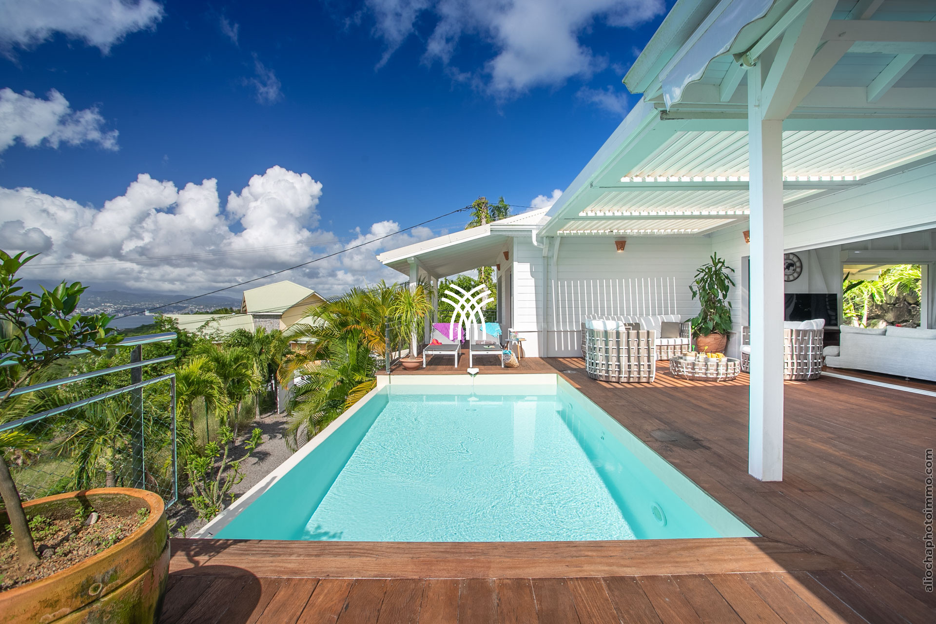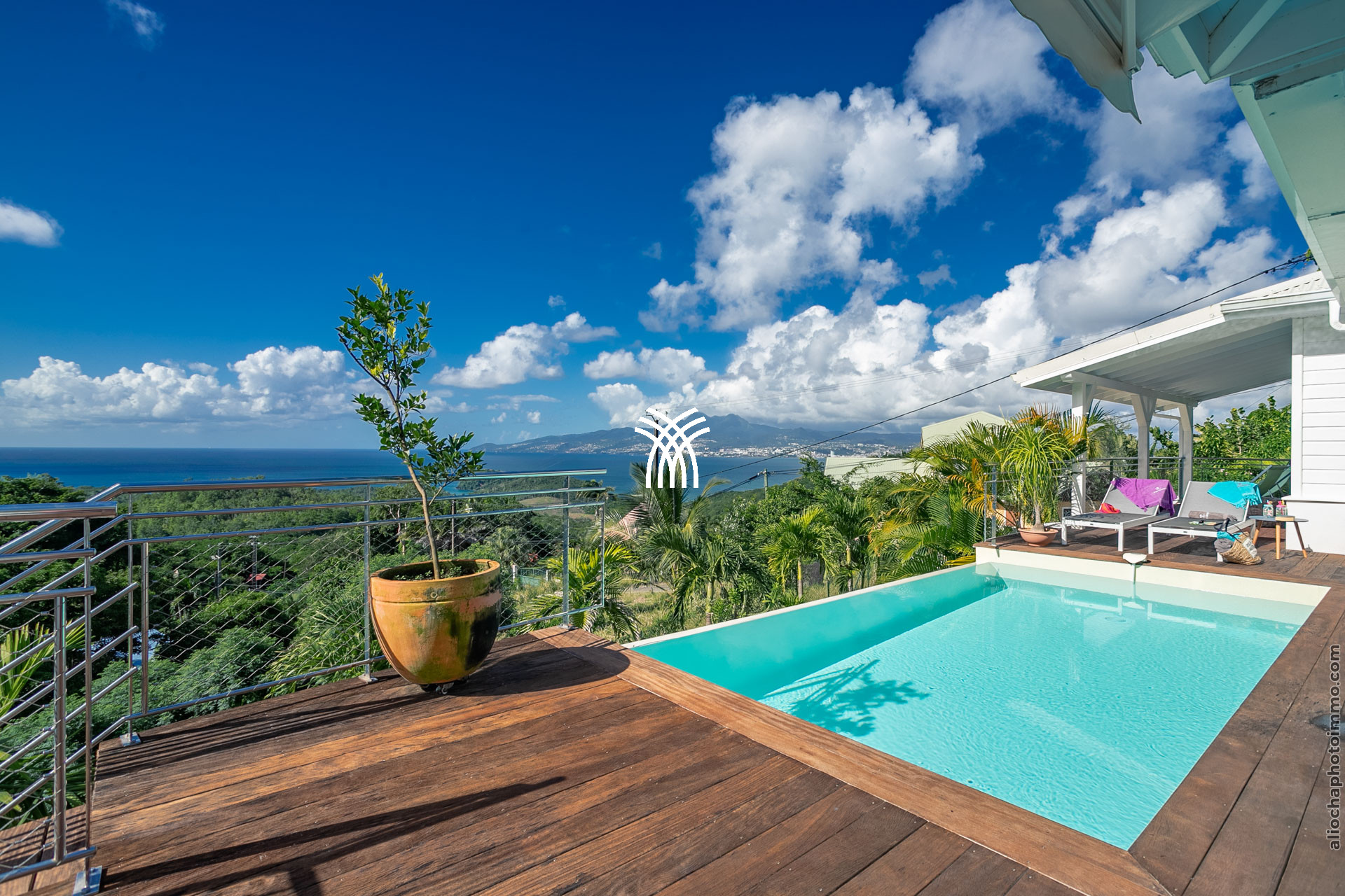 L’extérieur de la villa est un véritable écrin de sérénité. La vaste terrasse, aménagée pour accueillir un salon et une salle à manger, offre une vue imprenable sur la baie de Fort-de-France, reconnue comme l’une des plus belles baies du monde. La piscine à débordement, parfaitement intégrée dans le deck, et le jacuzzi invitent à des moments de détente absolue, bercés par la brise marine et les couleurs éclatantes des Caraïbes.
