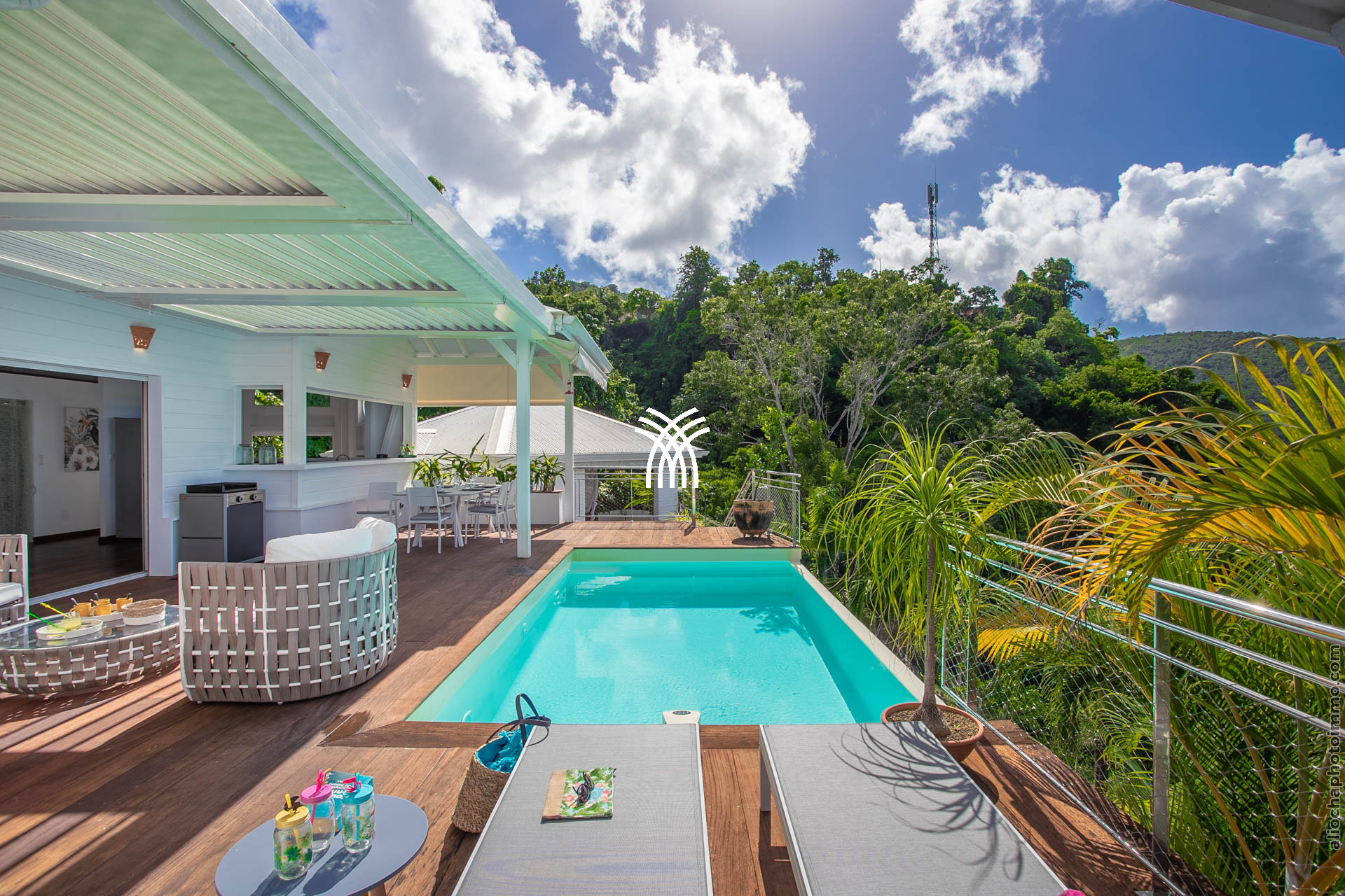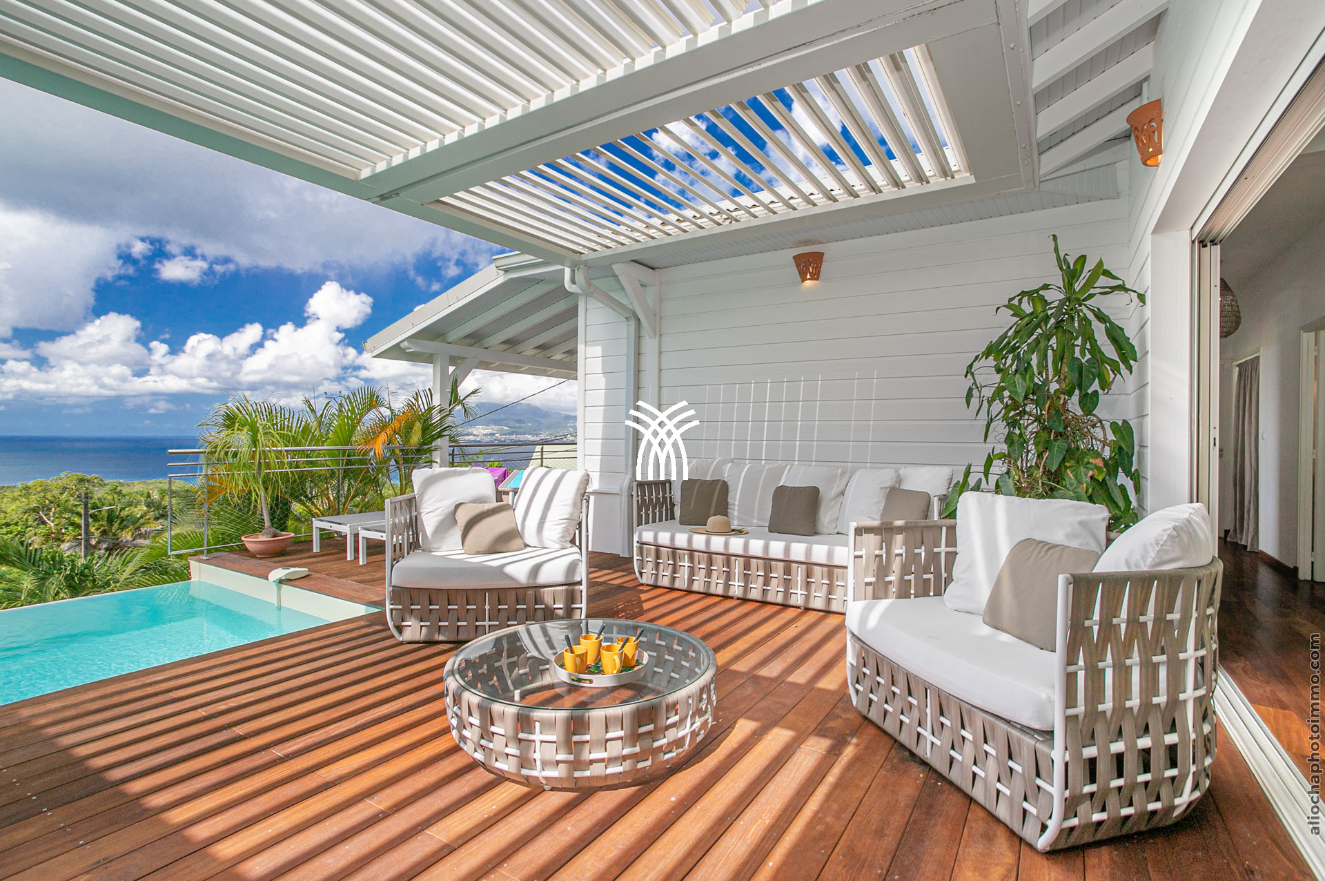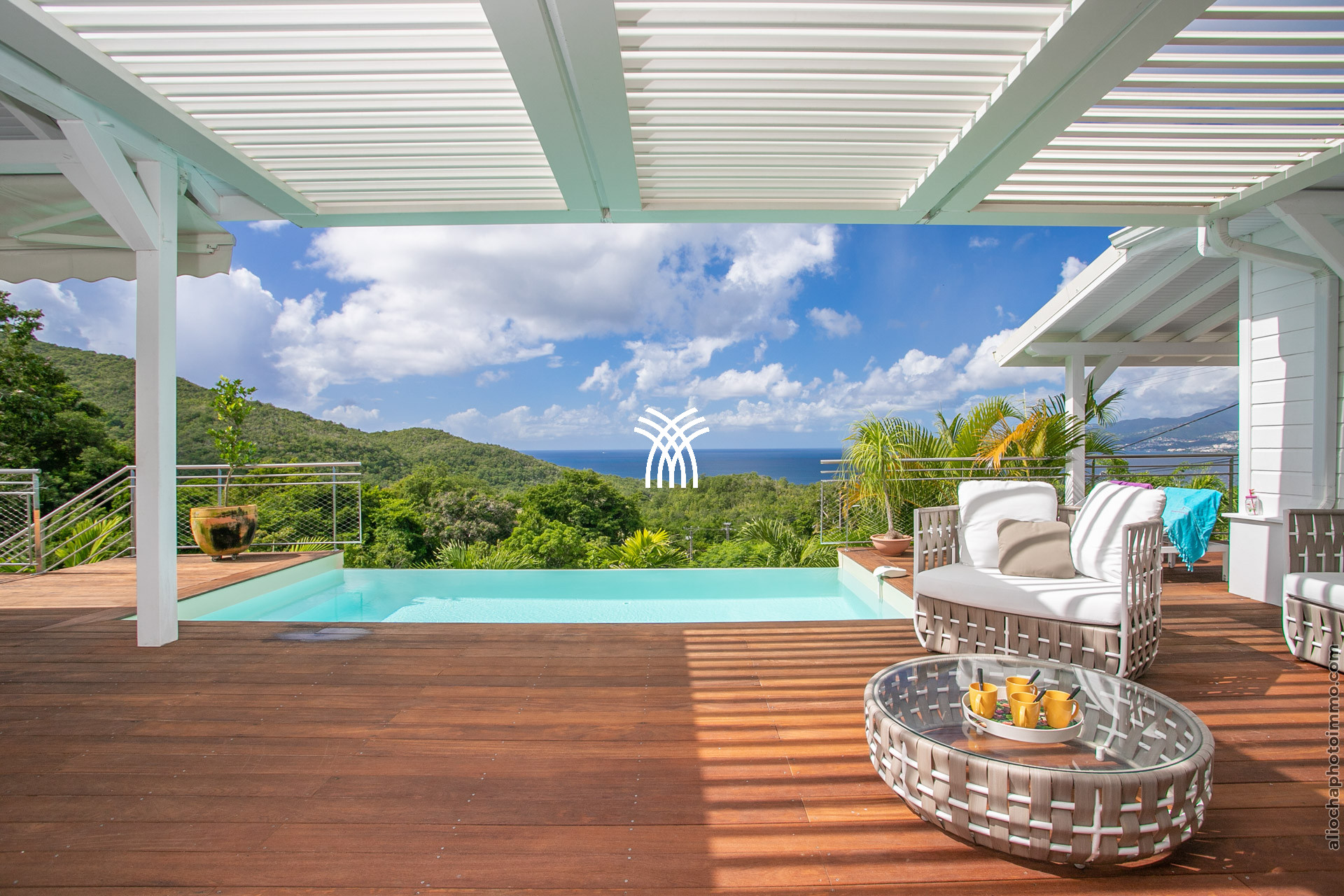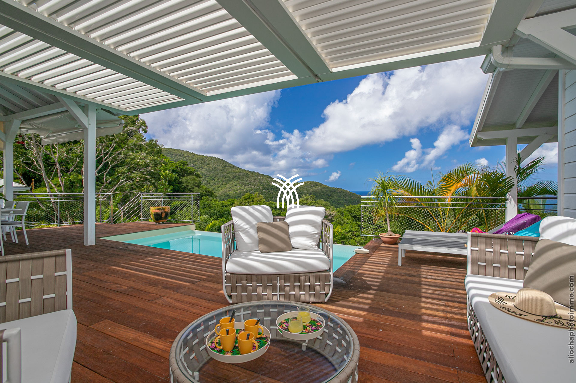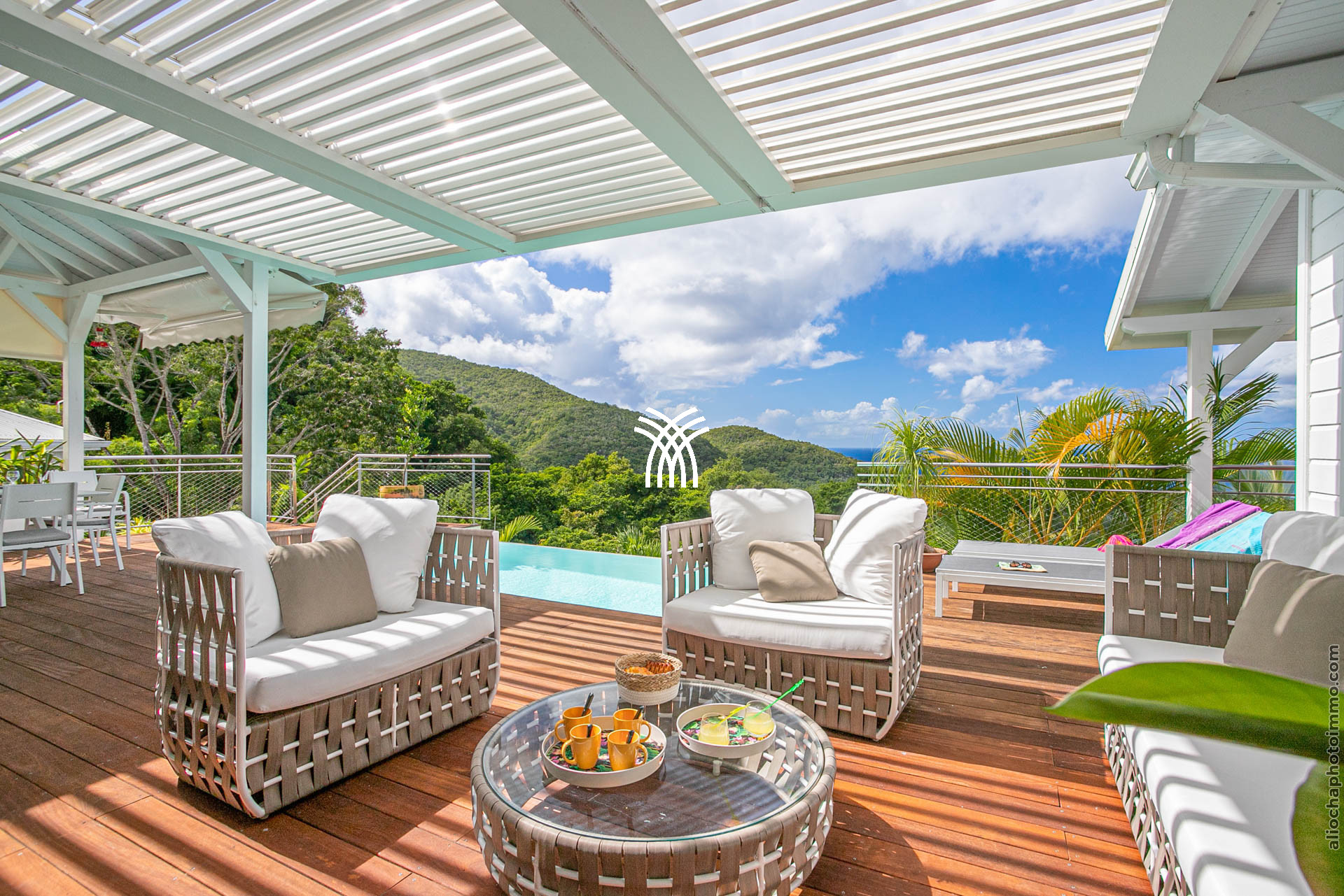 La grande terrasse est le cœur vibrant de la villa. Elle se transforme tour à tour en salon ou en salle à manger, invitant à partager un repas, savourer un cocktail ou tout simplement admirer le panorama. Le deck surplombe la mer avec une vue dégagée à 180°, un petit carbet ombragé offre un coin de fraîcheur, et la piscine à débordement, dotée d’un bar intégré avec tabourets, devient le centre des moments de convivialité.