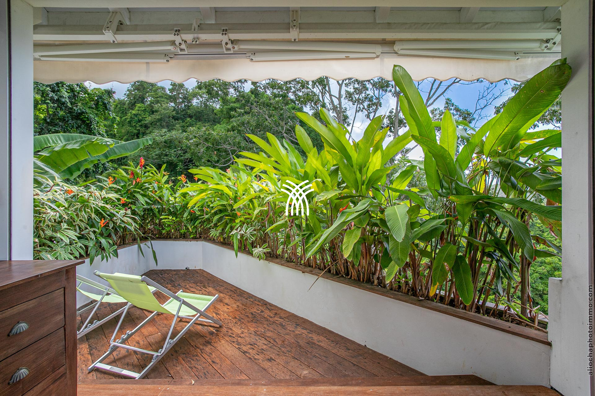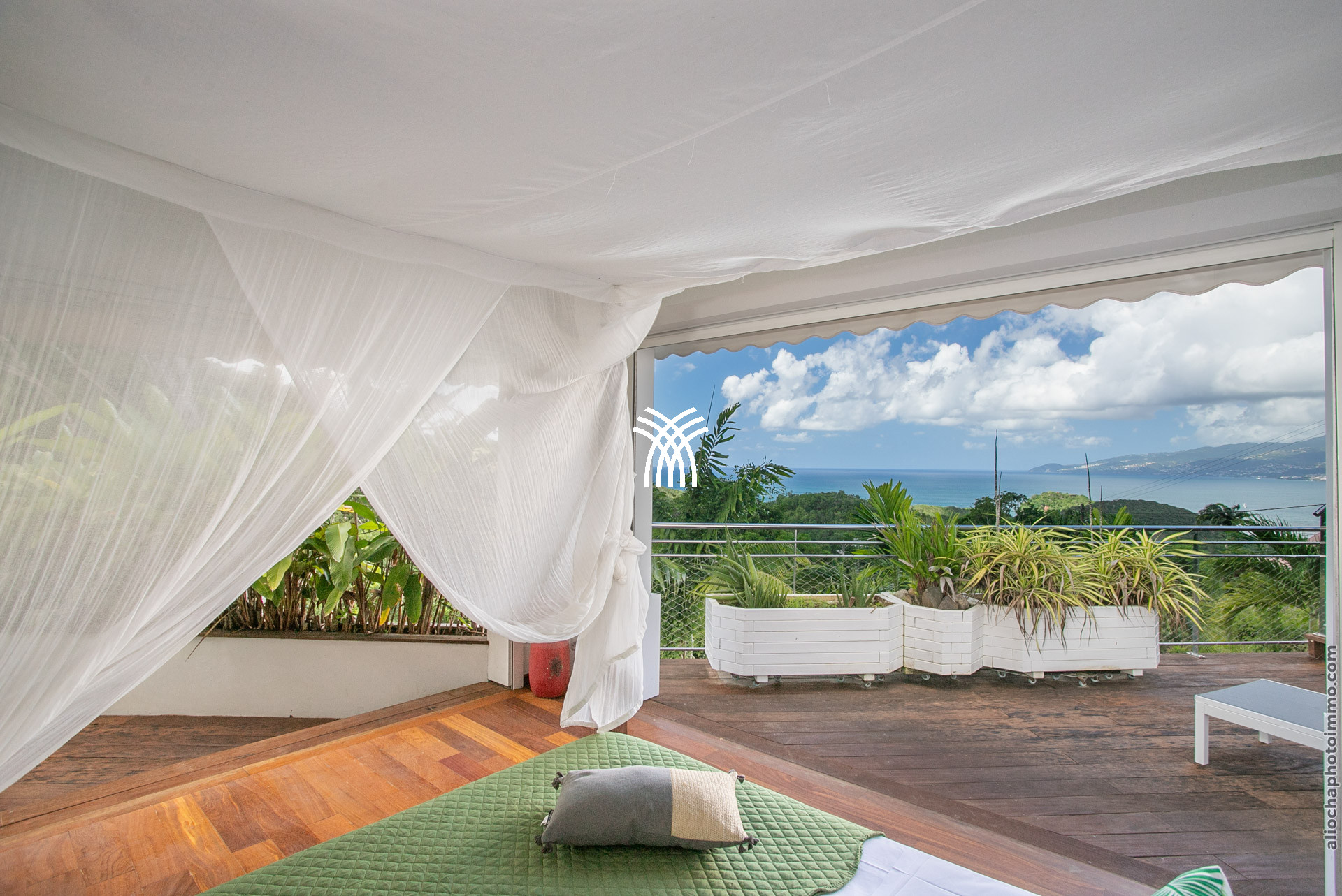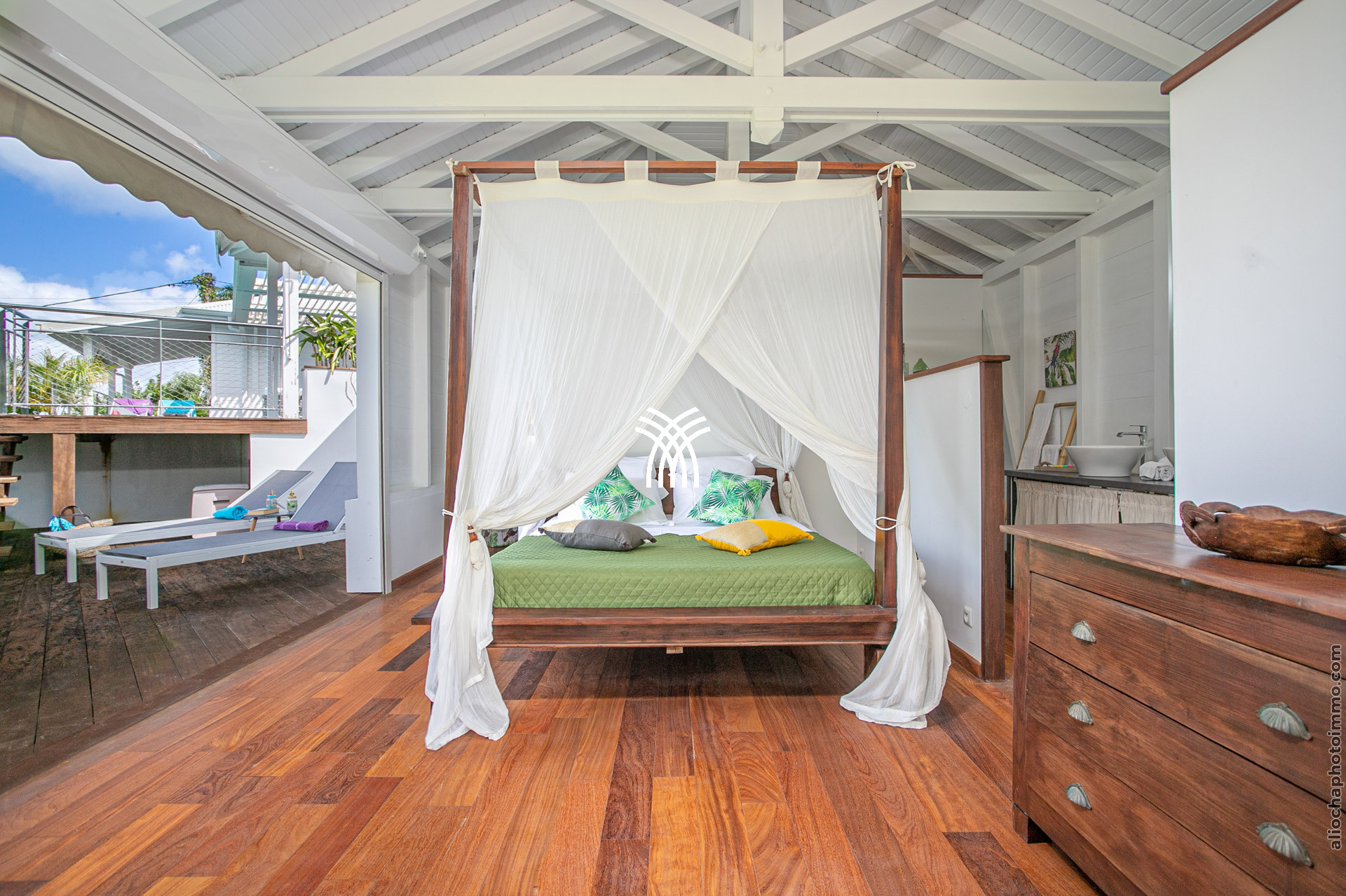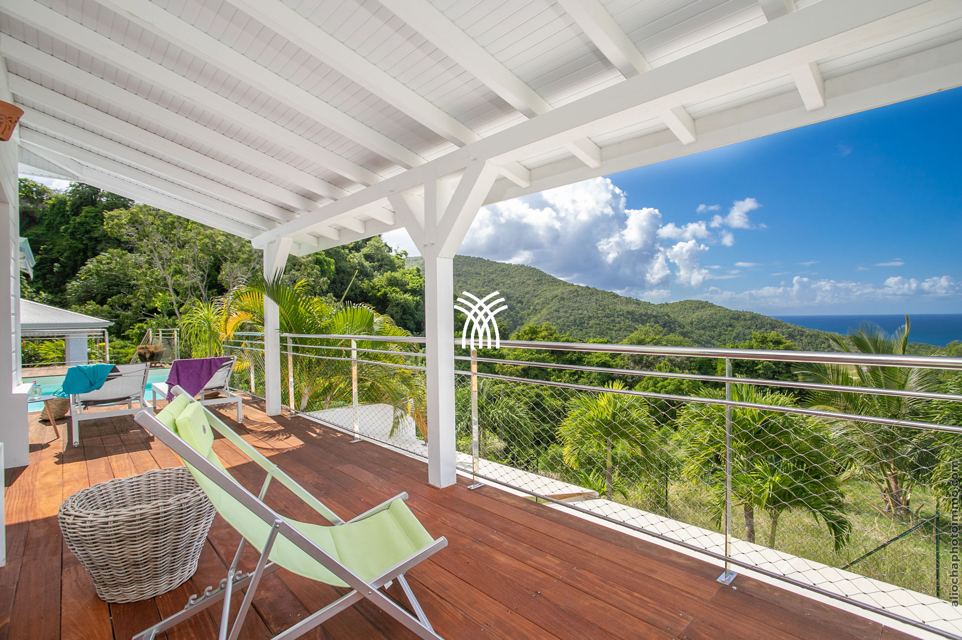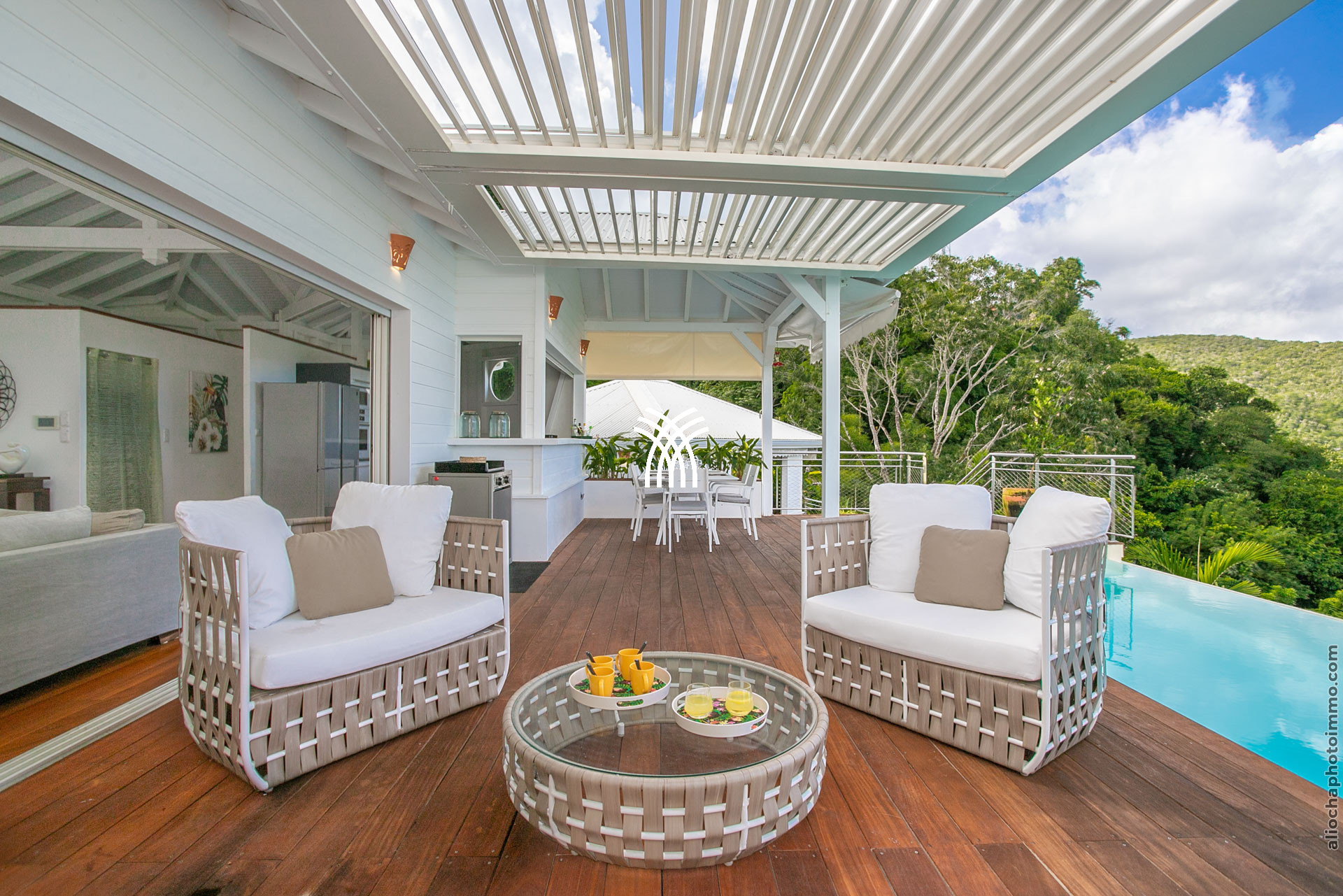La grande terrasse est le cœur vibrant de la villa. Elle se transforme tour à tour en salon ou en salle à manger, invitant à partager un repas, savourer un cocktail ou tout simplement admirer le panorama. Le deck surplombe la mer avec une vue dégagée à 180°, un petit carbet ombragé offre un coin de fraîcheur, et la piscine à débordement, dotée d’un bar intégré avec tabourets, devient le centre des moments de convivialité.