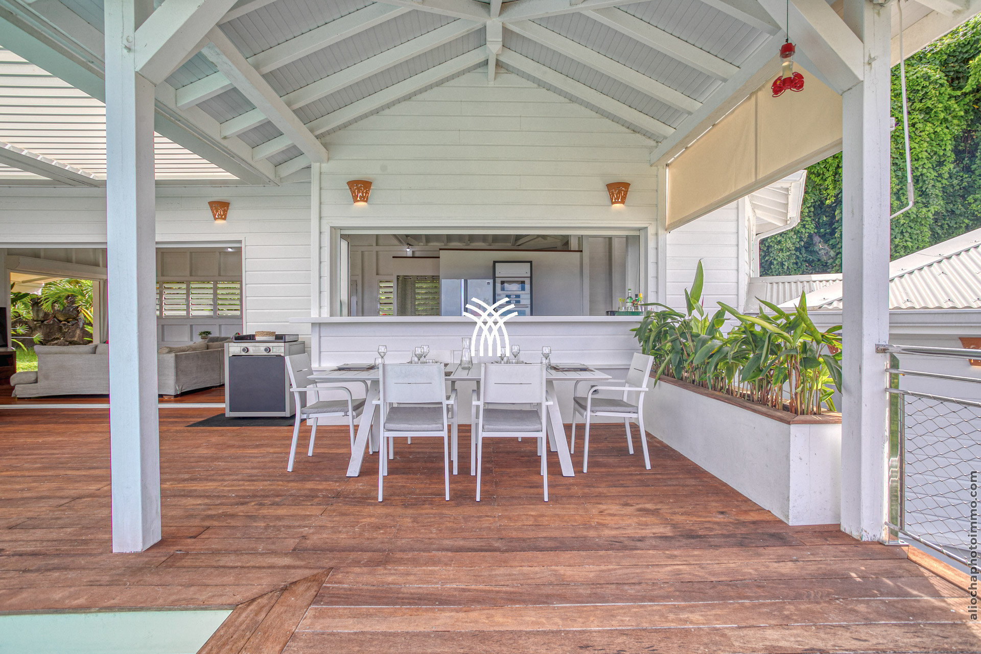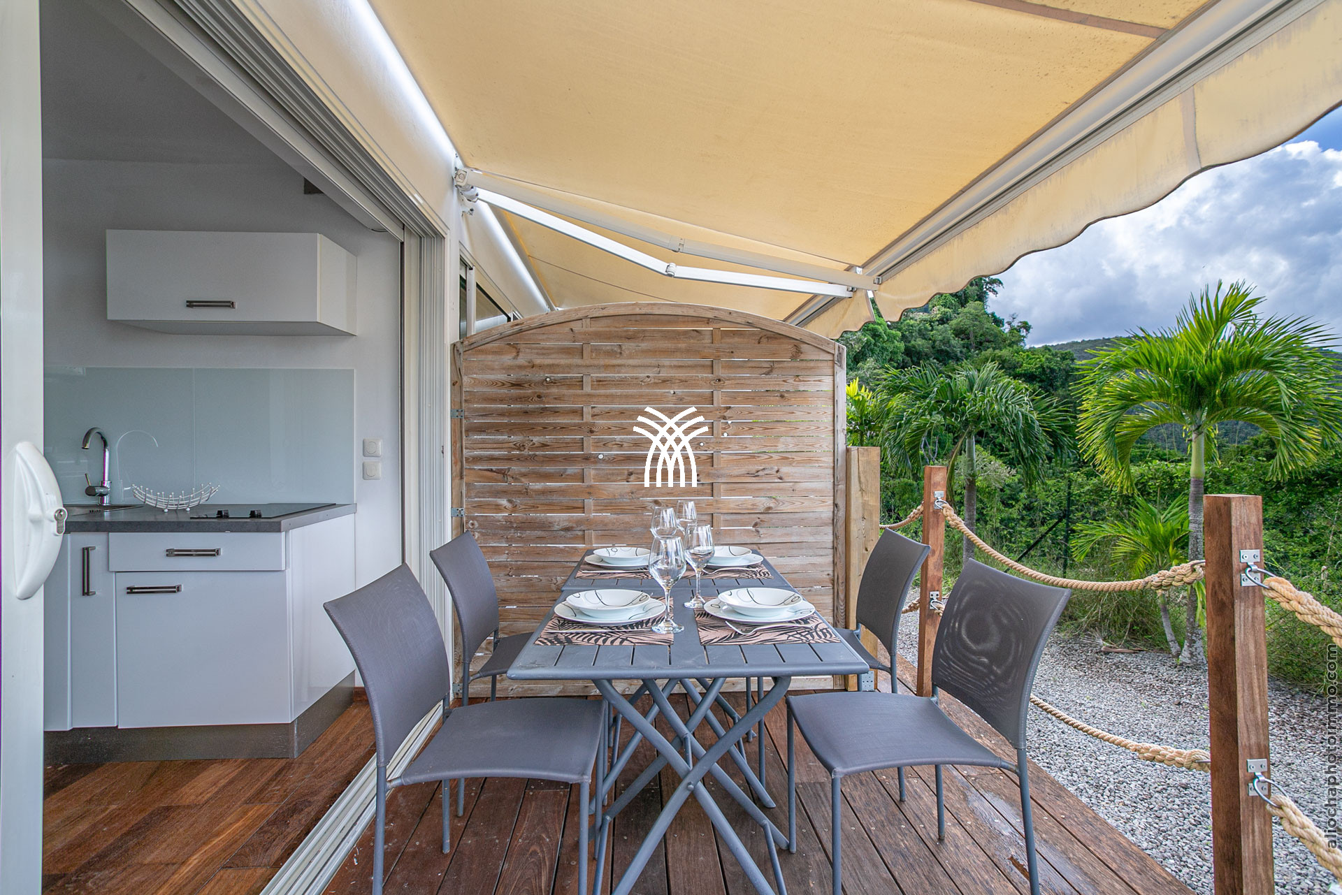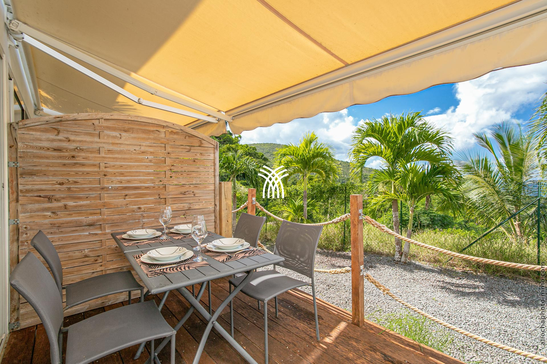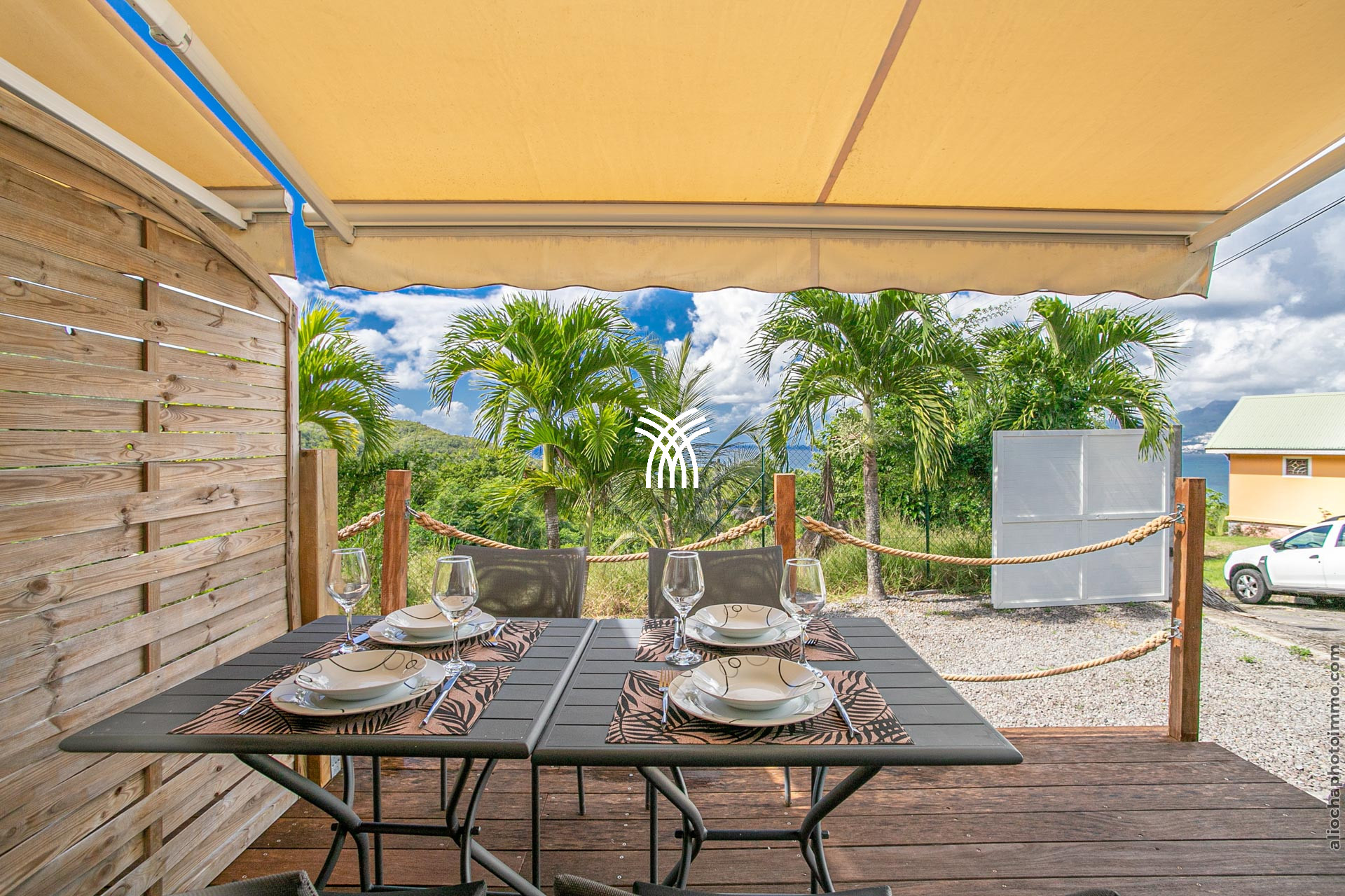 La terrasse, avec sa charpente apparente, prolonge le salon et accueille un canapé d’angle en résine, disposé face à la mer. C’est l’endroit rêvé pour savourer un punch local tout en admirant le coucher du soleil. Une petite table à manger permet de profiter des repas en plein air. À l’autre extrémité du deck, un carbet accueille un deuxième salon-salle à manger pour des moments conviviaux.