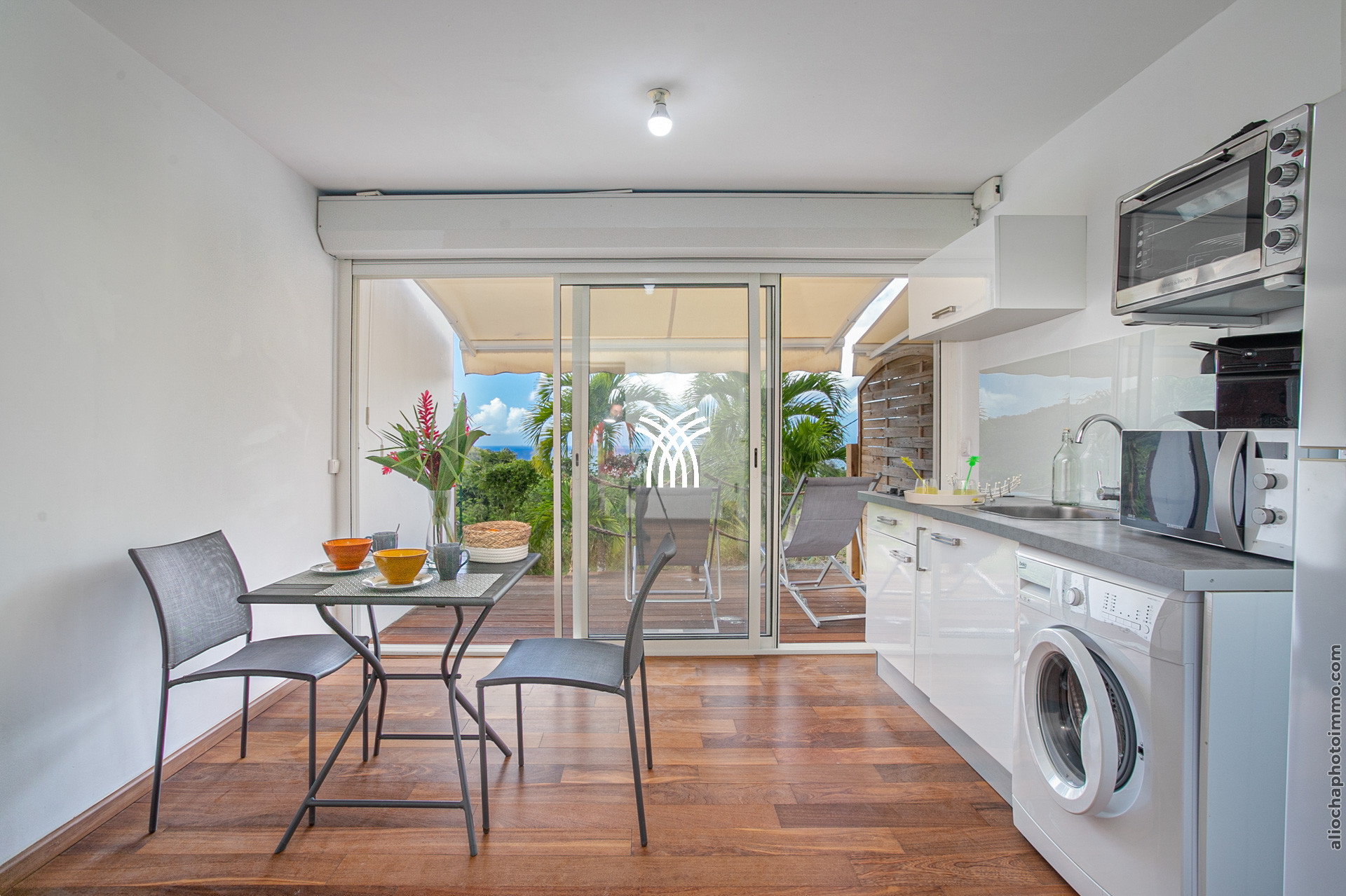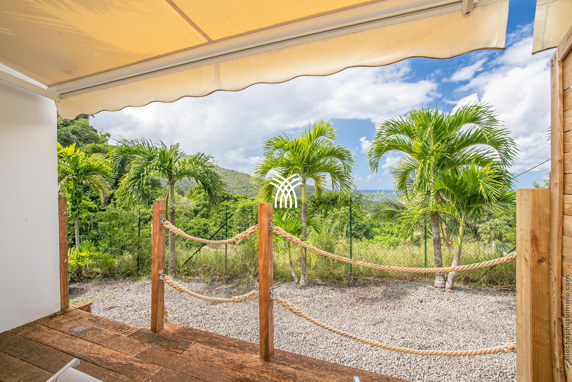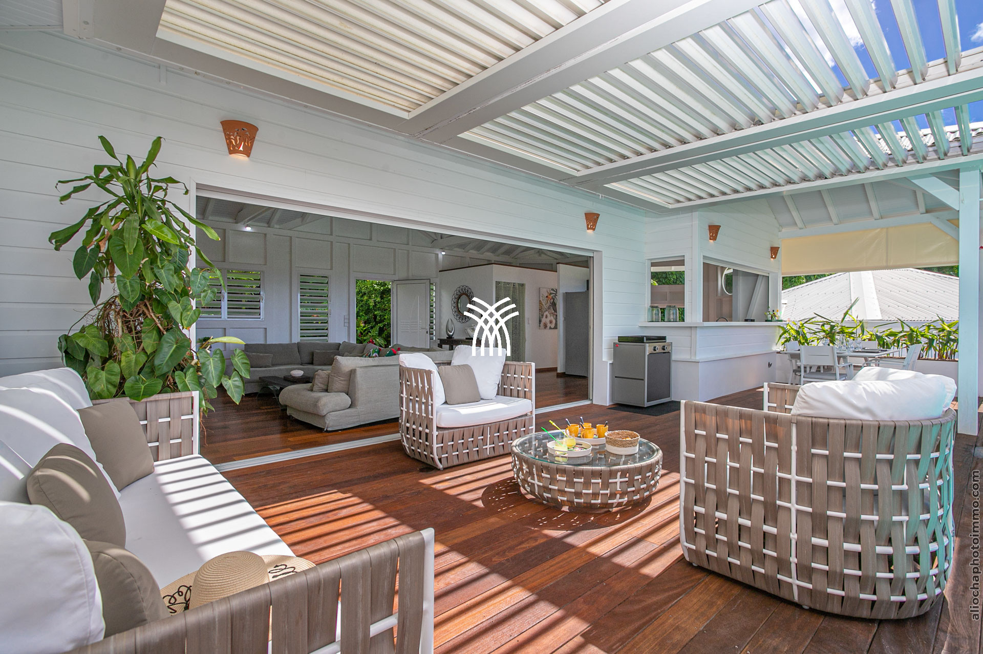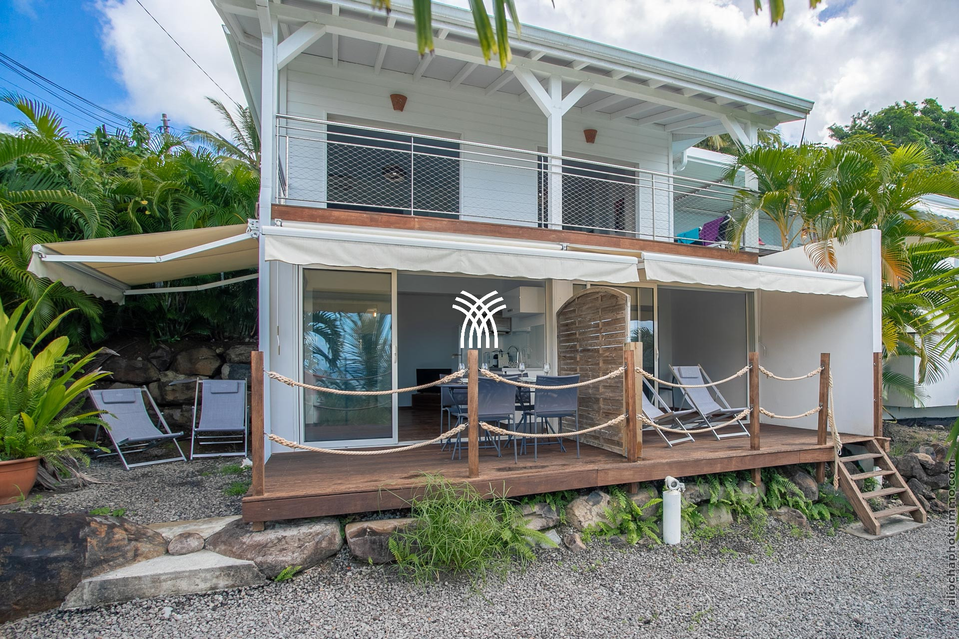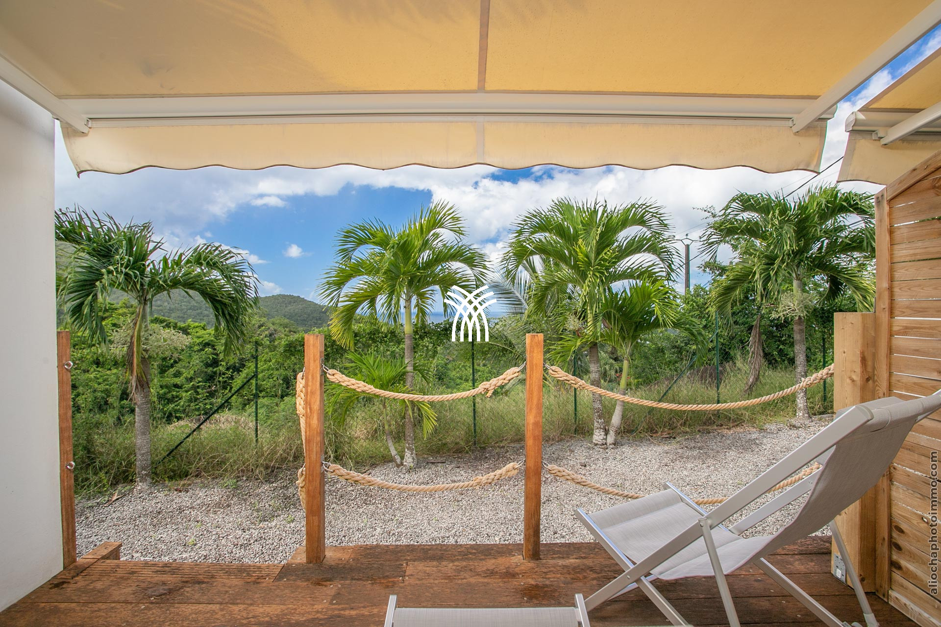 La terrasse, avec sa charpente apparente, prolonge le salon et accueille un canapé d’angle en résine, disposé face à la mer. C’est l’endroit rêvé pour savourer un punch local tout en admirant le coucher du soleil. Une petite table à manger permet de profiter des repas en plein air. À l’autre extrémité du deck, un carbet accueille un deuxième salon-salle à manger pour des moments conviviaux.