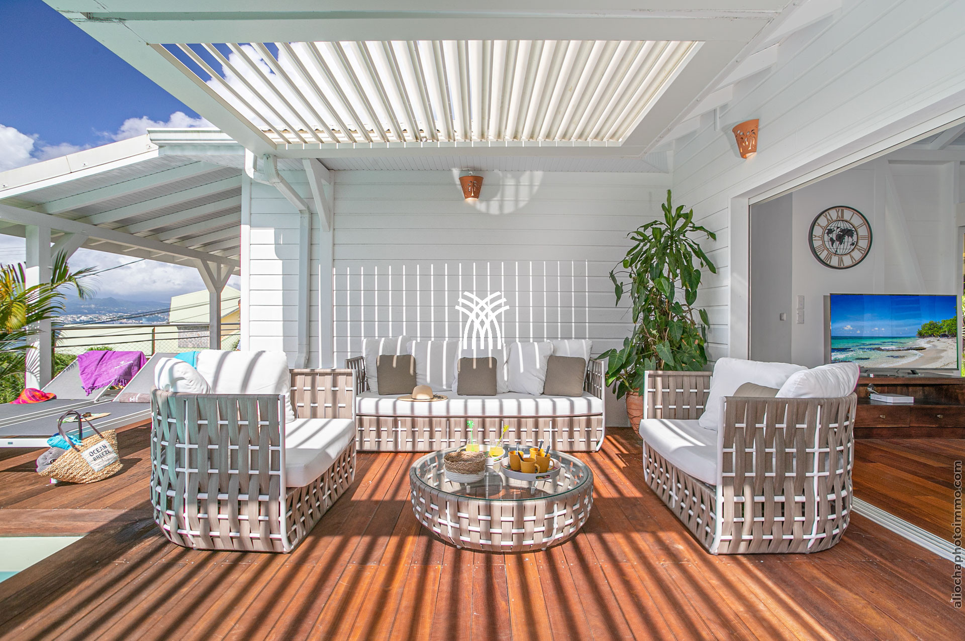 À votre arrivée à la Villa Caribana, le spectacle est immédiat : la propriété, tournée vers l’horizon, offre une vue panoramique envoûtante sur les eaux turquoise de la mer des Caraïbes. Construite sur les hauteurs de l’Anse Mitan, aux Trois-Îlets, elle domine la baie de Fort-de-France et garantit à ses hôtes calme, intimité et une atmosphère unique entre élégance créole et confort moderne.