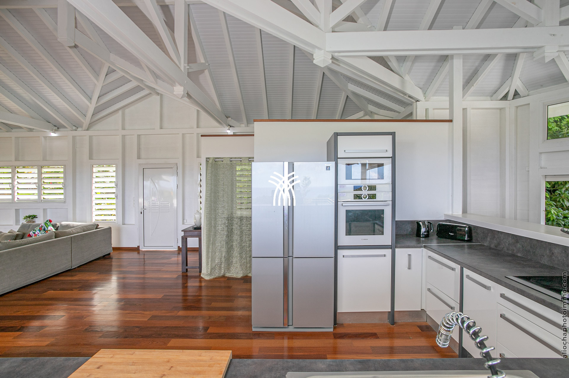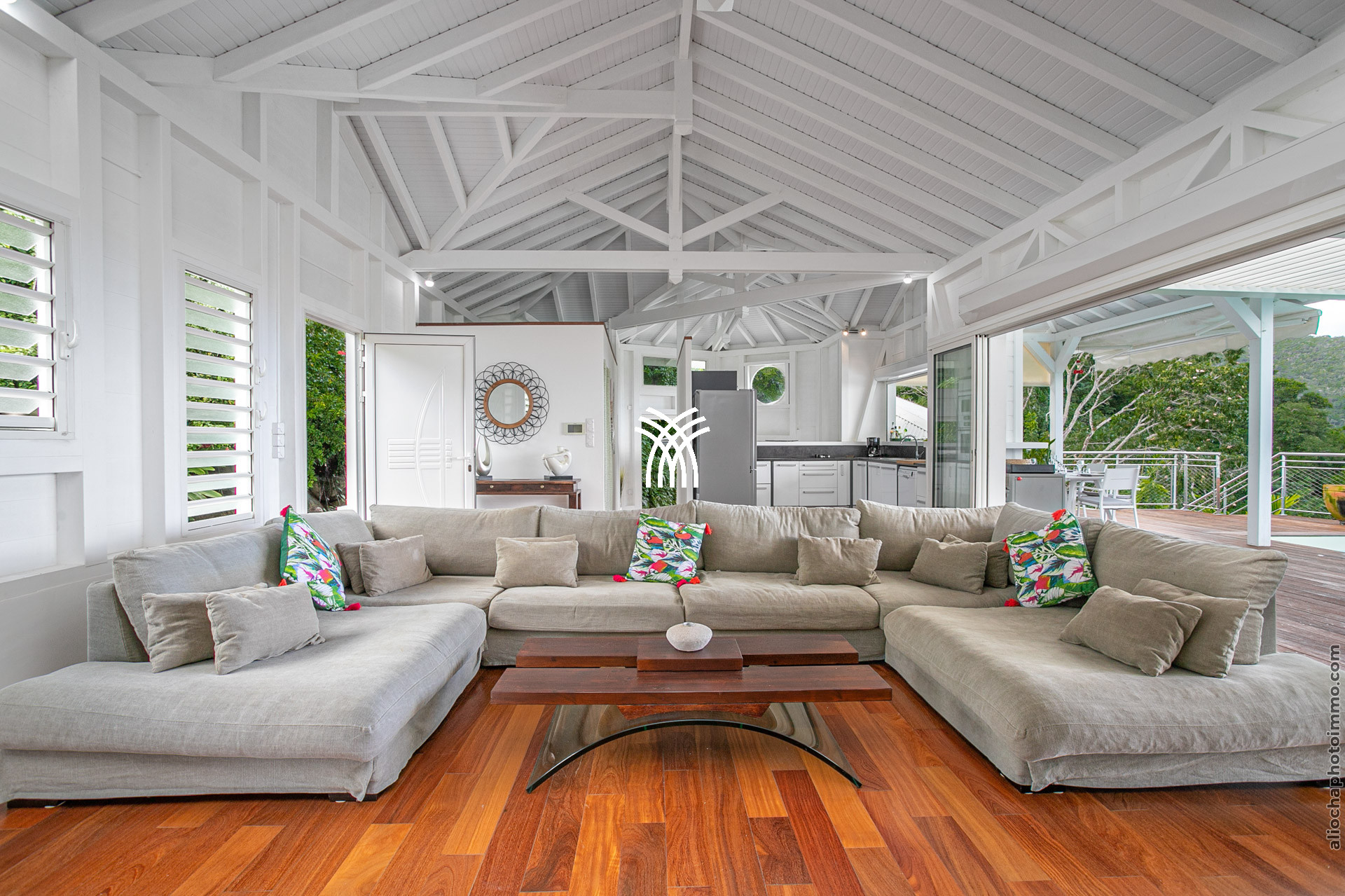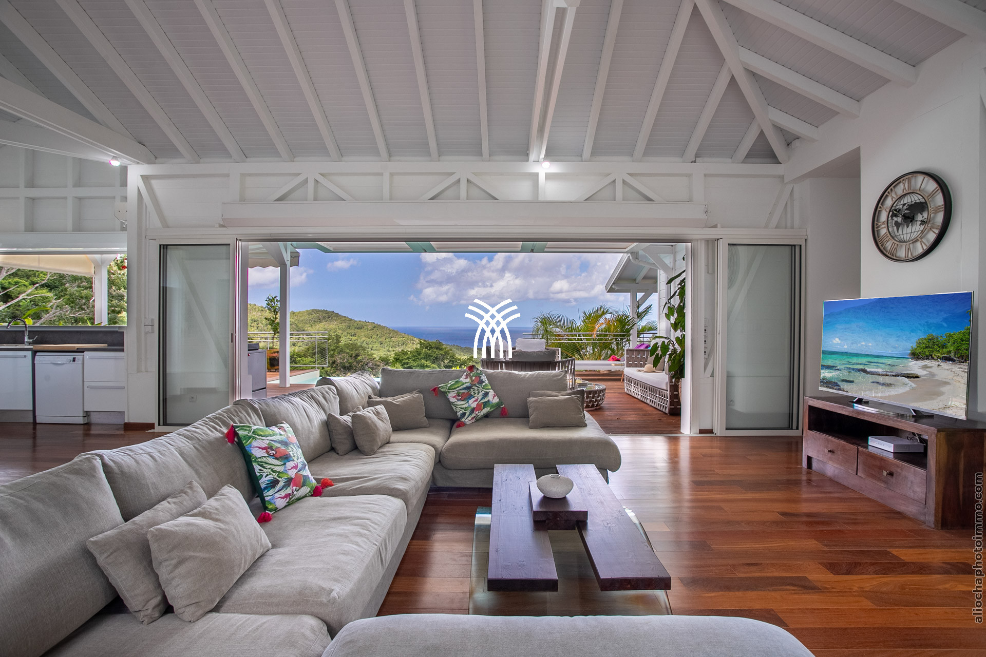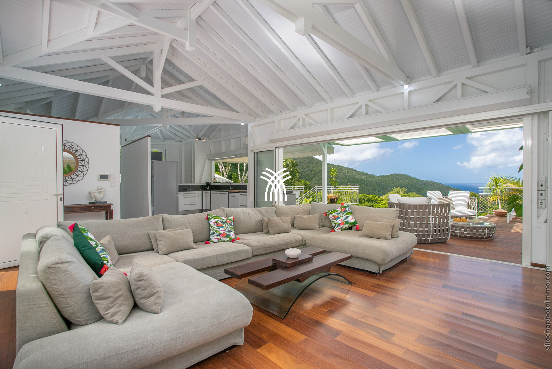 Avec ses 320 m², la Bahia Villa est une vaste demeure créole contemporaine, largement inspirée par l’art moderne. Les espaces sont généreux et lumineux, et le salon ouvert sur la cuisine forme une grande pièce baignée de lumière avec des vues spectaculaires sur la mer des Caraïbes.