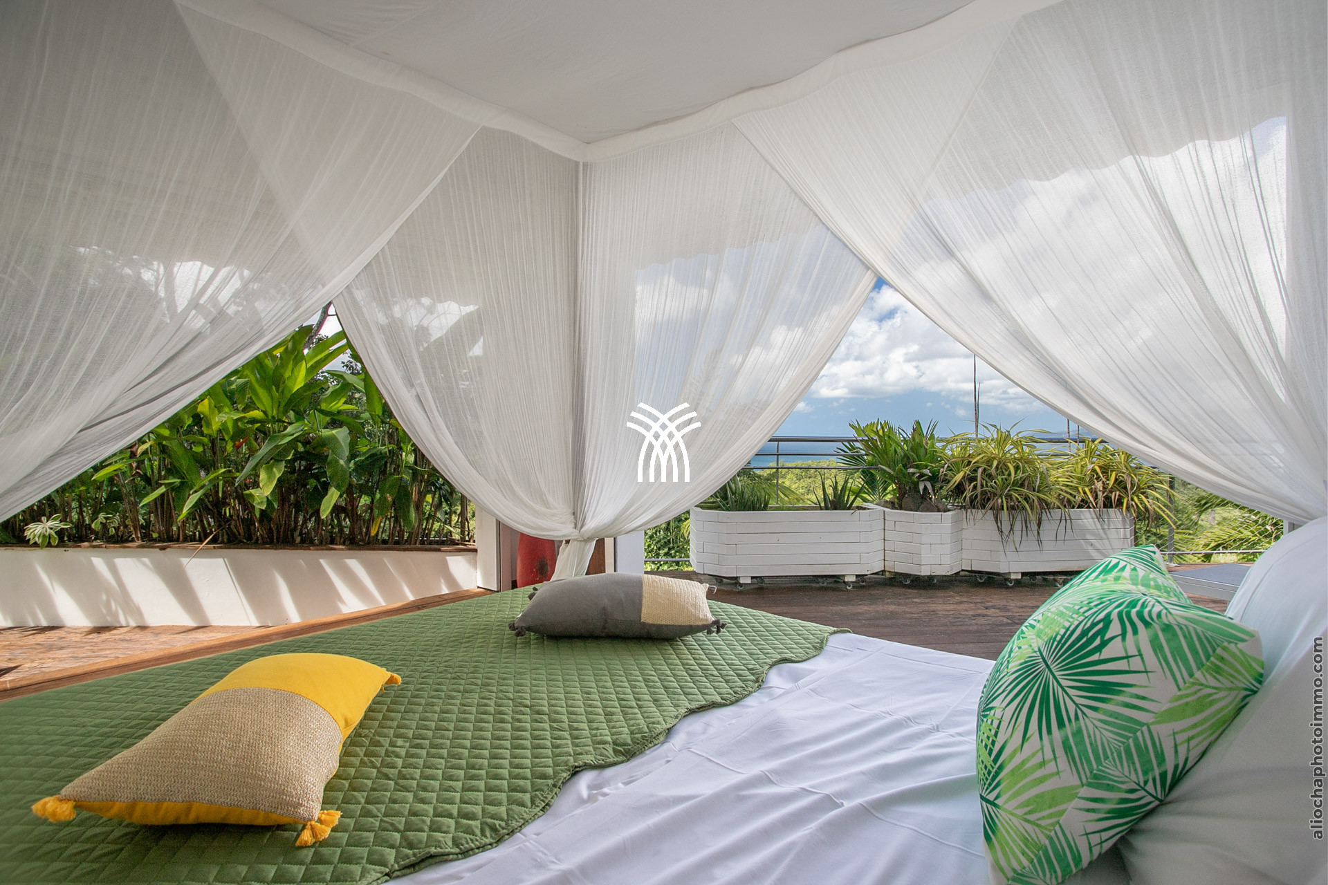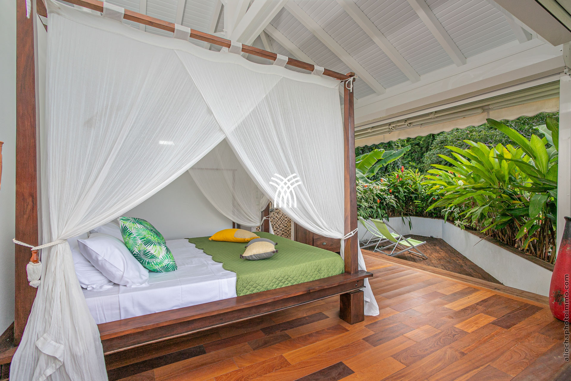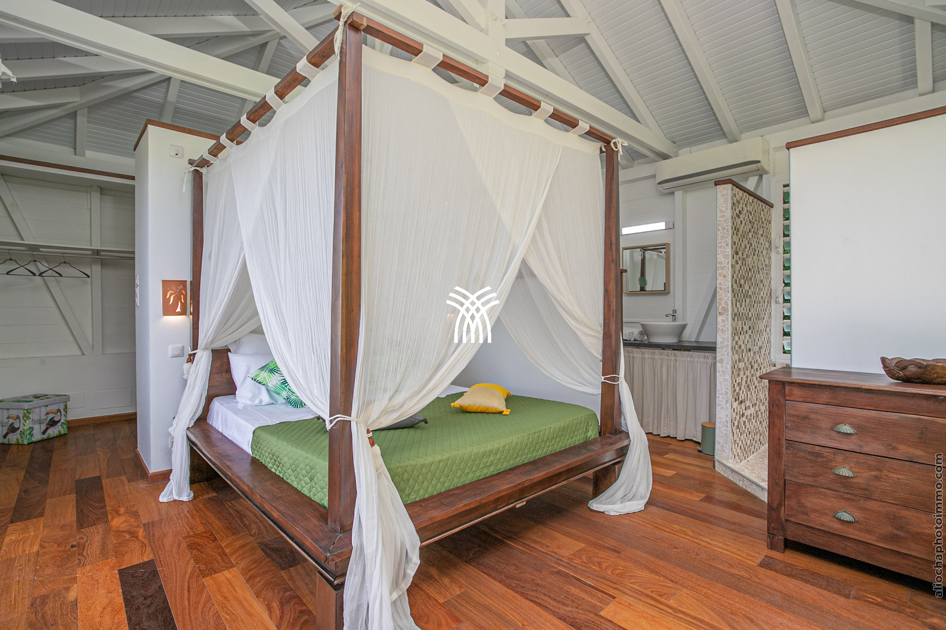 La Villa Madolyne dispose d’une suite parentale et de deux chambres lumineuses, offrant un confort optimal. La suite parentale, avec son lit à baldaquin orné d’une moustiquaire, s’accompagne d’un dressing, d’une terrasse privée et d’une salle de douche extérieure, parfaite pour se reconnecter à la nature. Les deux autres chambres, ouvertes sur la mer, partagent une salle de douche et un WC, l’une équipée d’un lit 160x200 et l’autre de deux lits simples.