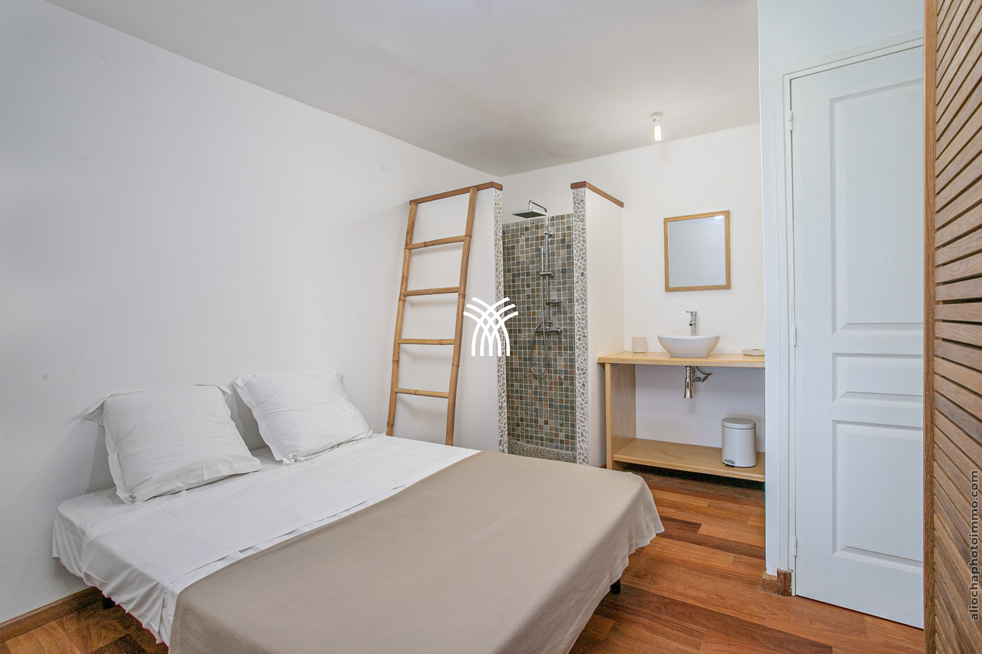 Les deux premières chambres, situées au rez-de-chaussée, sont communicantes, idéales pour les familles : une chambre double et une chambre triple avec 2 lits simples et 1 lit tiroir. Par un escalier extérieur en bois, vous accédez aux cinq autres chambres, chacune dotée d’une terrasse privée avec un coin salon extérieur et une vue panoramique sur la mer.