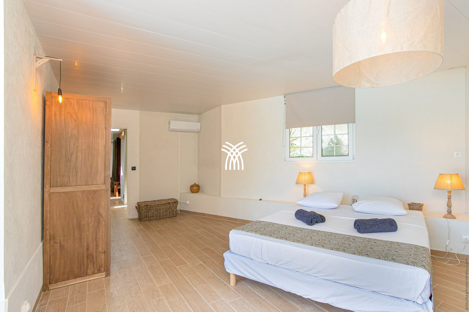 Les extérieurs invitent à la détente avec une grande terrasse couverte, parfaite pour des déjeuners conviviaux autour de la grande table en bois, un coin lounge pour savourer un apéritif face au coucher de soleil et un hamac suspendu à l’ombre. La piscine à débordement au sel (10 m x 5 m), sécurisée par une barrière amovible, s’accompagne d’une douche extérieure pour prolonger vos instants de bien-être. Un lit d’appoint peut accueillir un enfant supplémentaire (capacité totale 11 personnes).