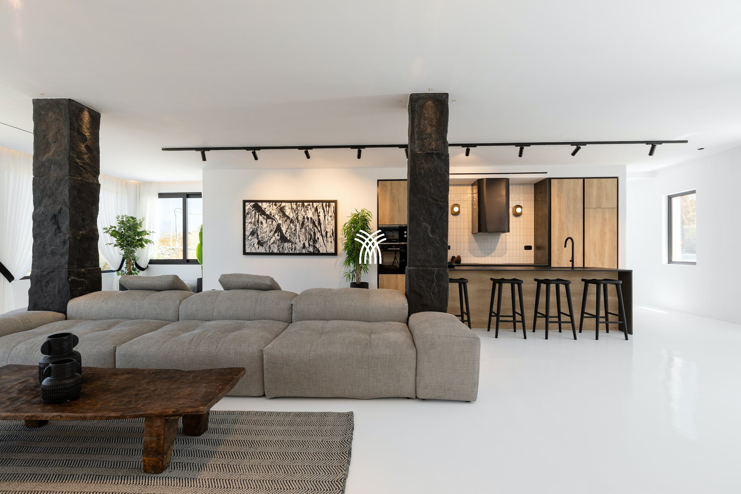Des espaces extérieurs élégants comprennent un généreux espace salon parfait pour des cocktails au coucher du soleil et une véranda ombragée avec une grande table à manger pour douze personnes, idéale pour des repas en plein air sous les étoiles. À l'intérieur, la villa met en valeur le style iconique de Mykonos avec des plafonds vertigineux, des poutres en bois clair, et des murs blanchis à la chaux rehaussés par des sols en ciment poli et des équipements de luxe contemporains.