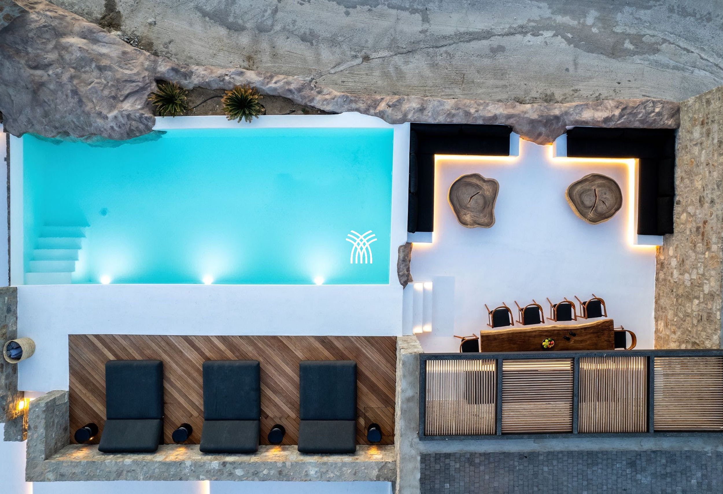 La villa se distingue par son immense piscine à débordement, parfaite pour admirer les nuances de bleu de la mer et du ciel, ainsi que par son jacuzzi extérieur et sa piscine chauffée en grotte, une véritable oasis de sérénité. Les espaces extérieurs sont pensés pour offrir des instants inoubliables : détendez-vous sur les transats immergés, savourez un dîner sous les étoiles dans l’espace repas abrité ou laissez-vous bercer par la brise marine depuis les élégants salons de plein air.