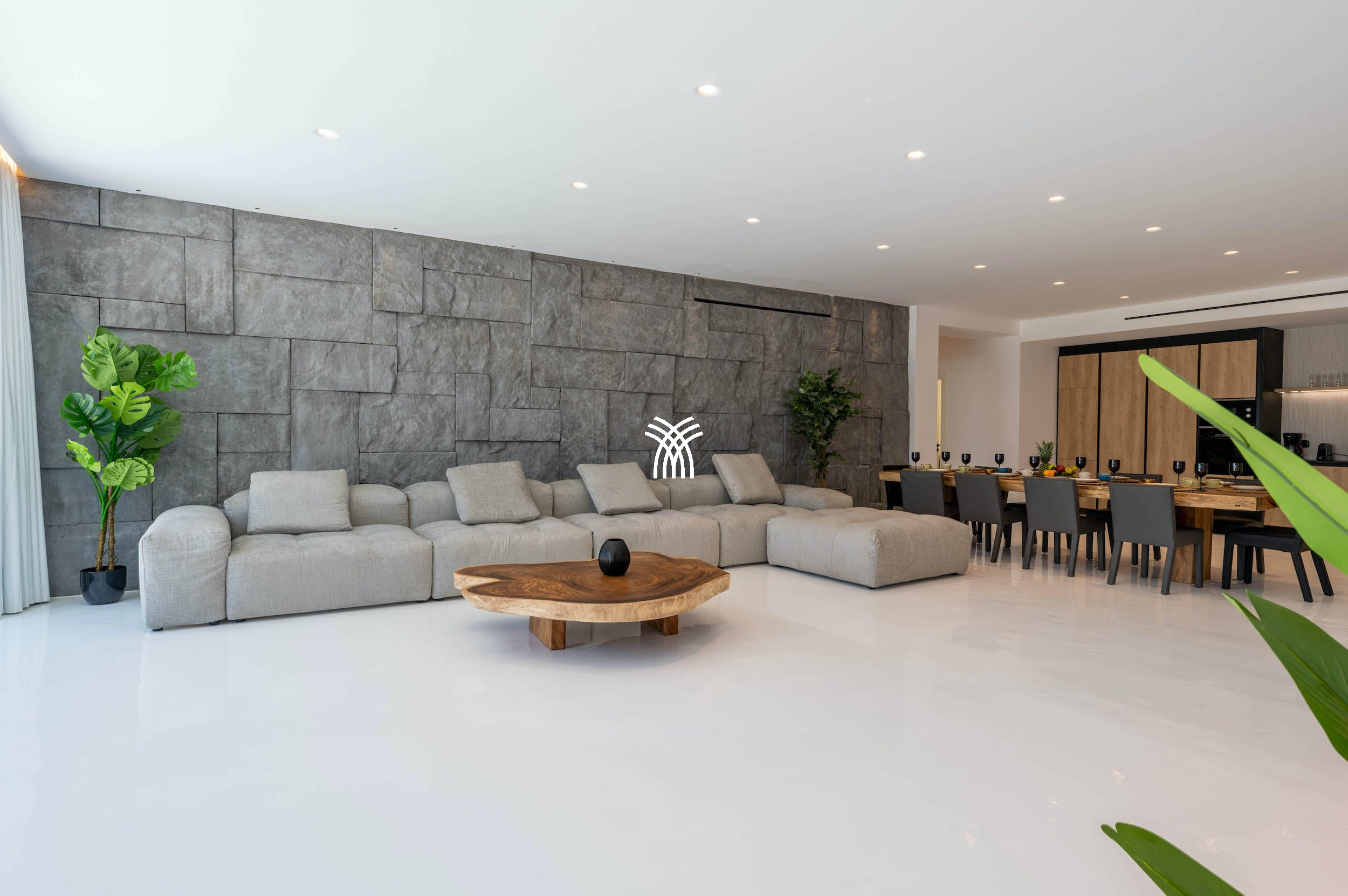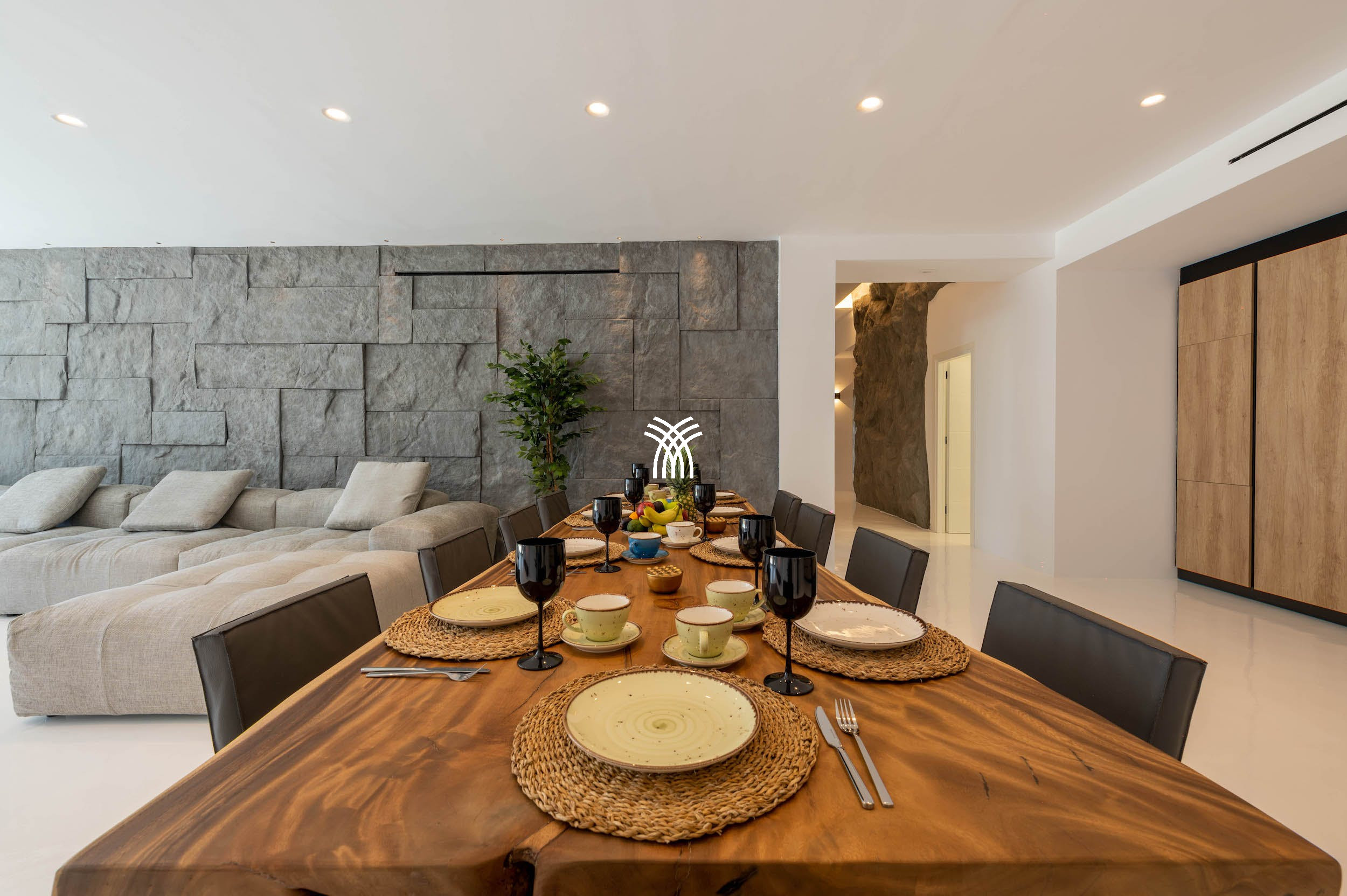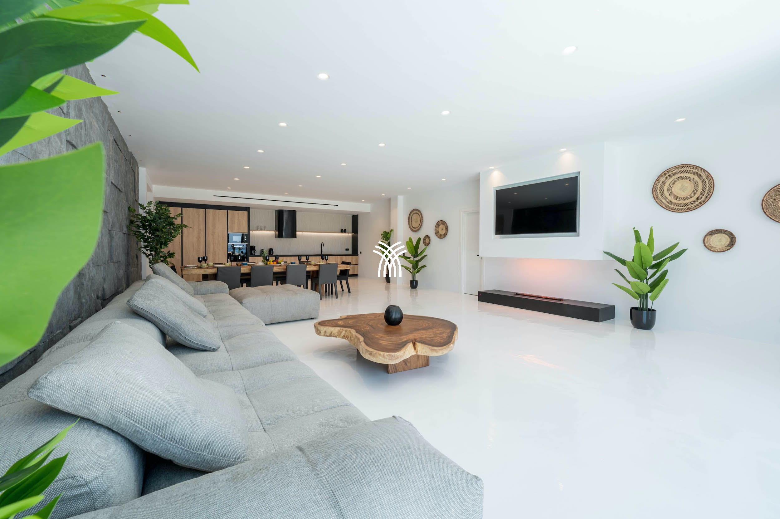 Cette villa élégamment conçue sur trois niveaux offre un hébergement confortable et élégant pour les familles ou les groupes d'amis. Elle comprend six chambres spacieuses, quatre salles de bains, deux salons accueillants et une cuisine entièrement équipée, le tout meublé avec goût pour offrir le confort d'une maison privée dans un cadre luxueux.