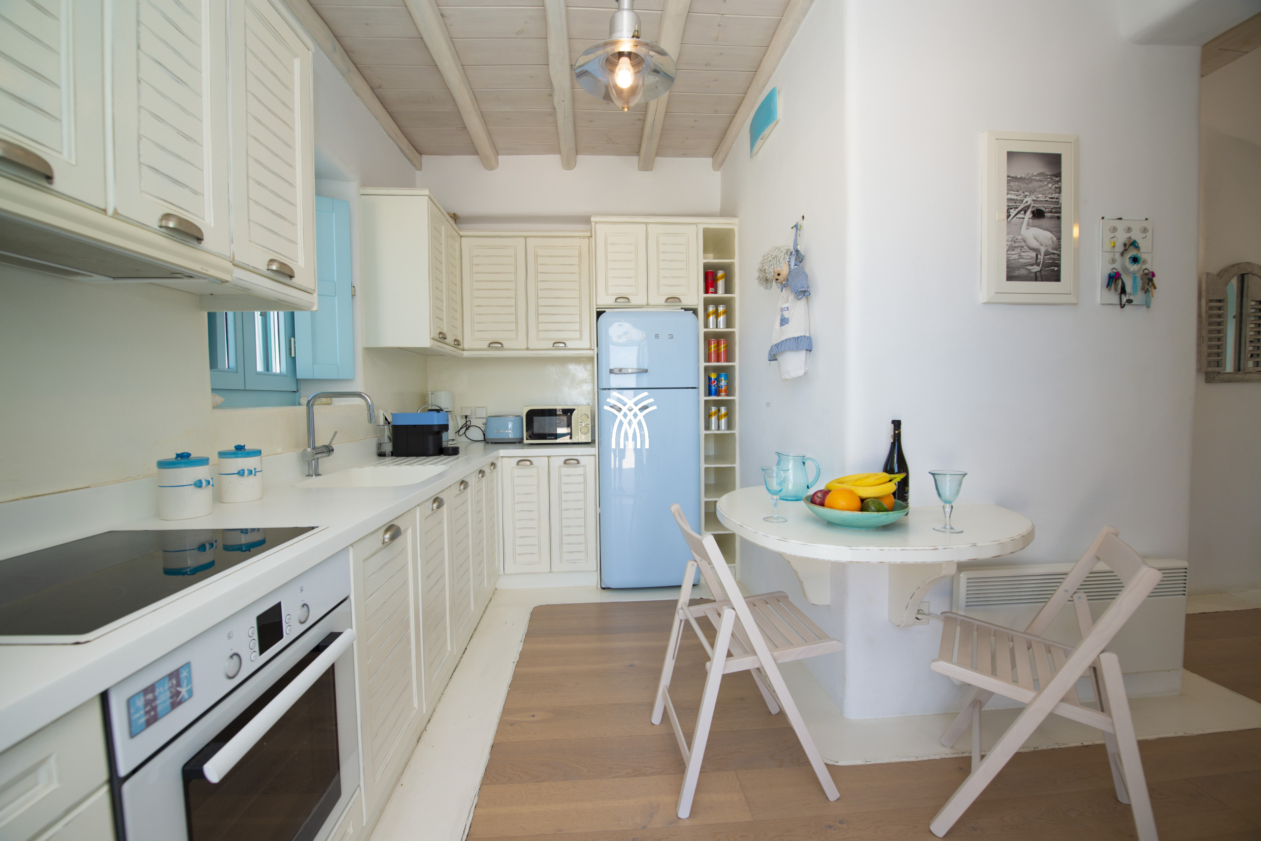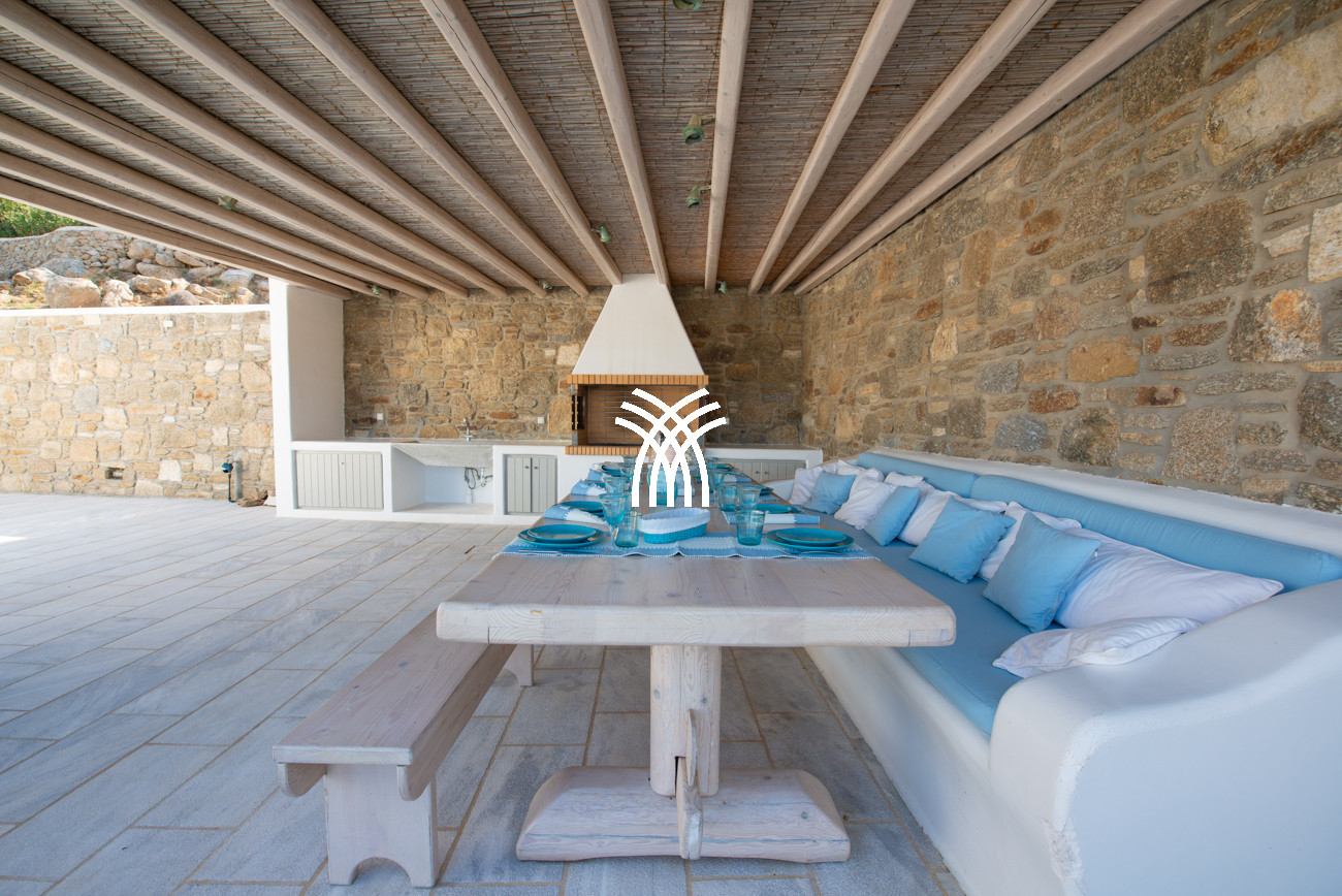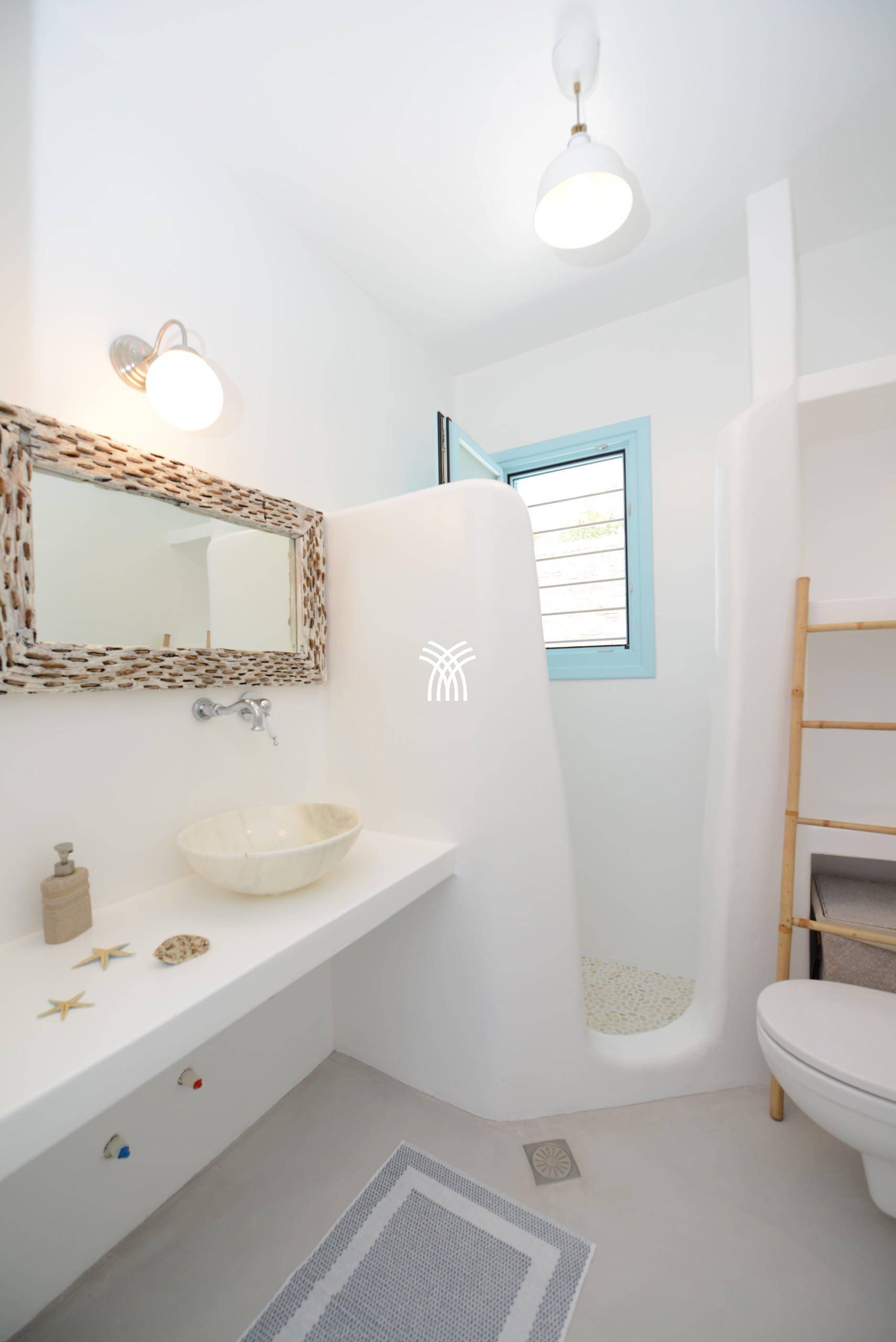 À l'intérieur, la villa dispose d'un salon spacieux avec des sièges moelleux et des vues spectaculaires sur la piscine et la mer Égée. La cuisine entièrement équipée répond à tous vos désirs culinaires, complétée par une zone de buanderie et de rangement séparée pour plus de commodité.