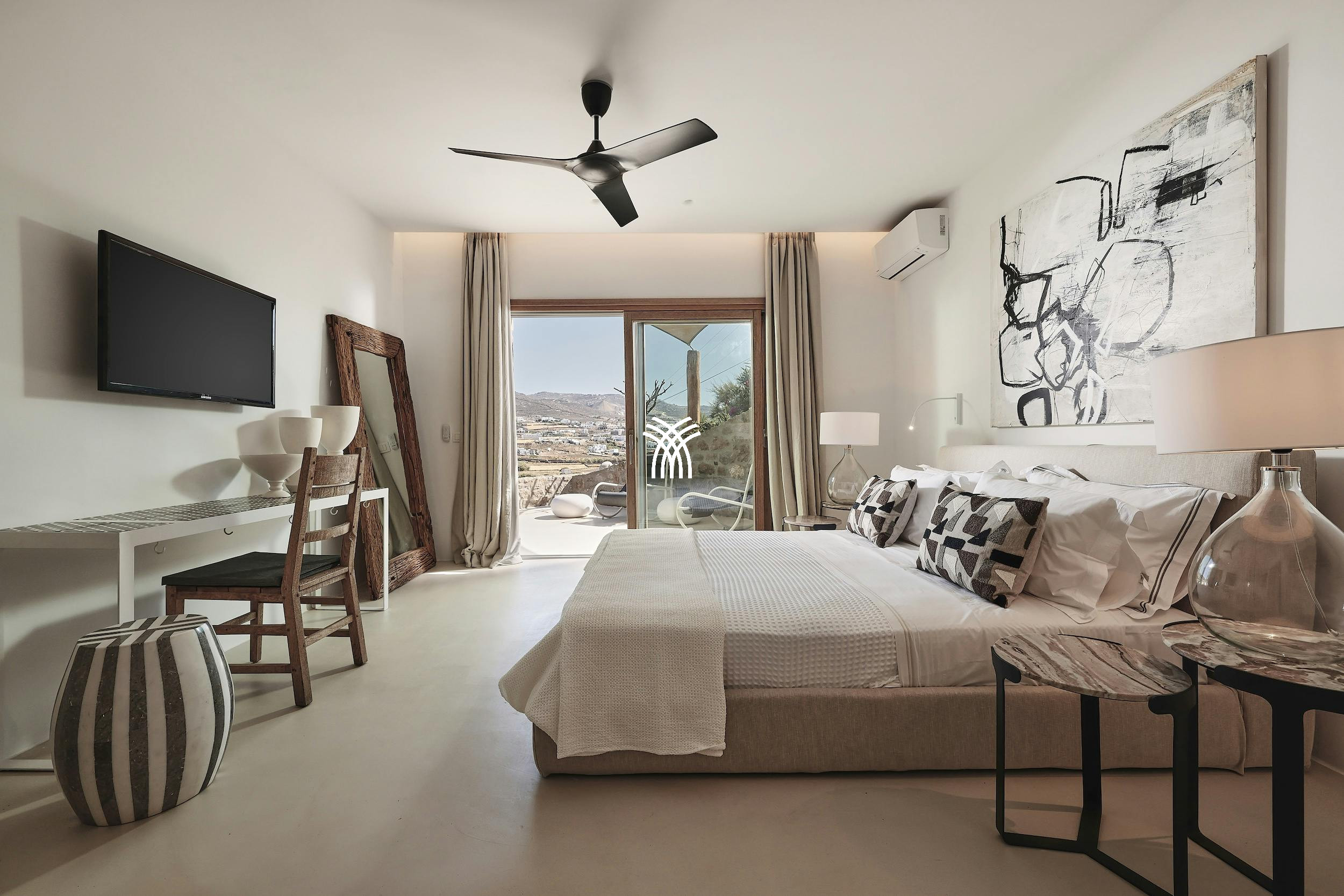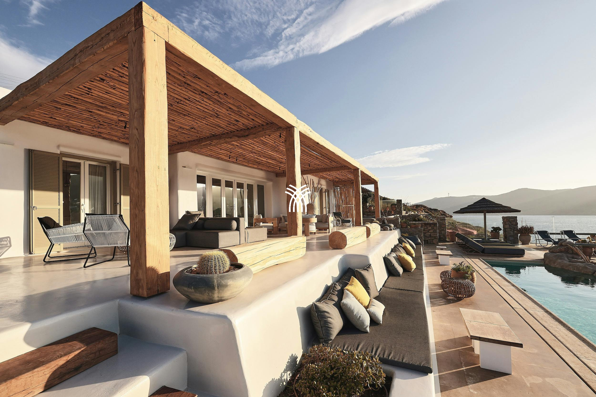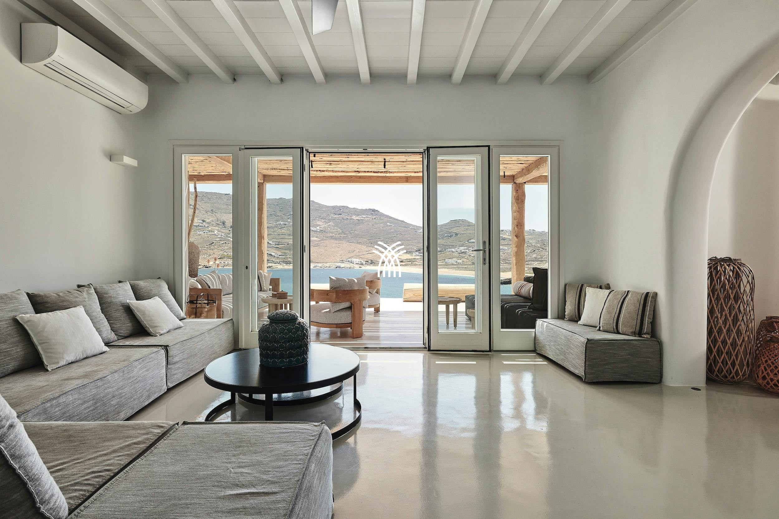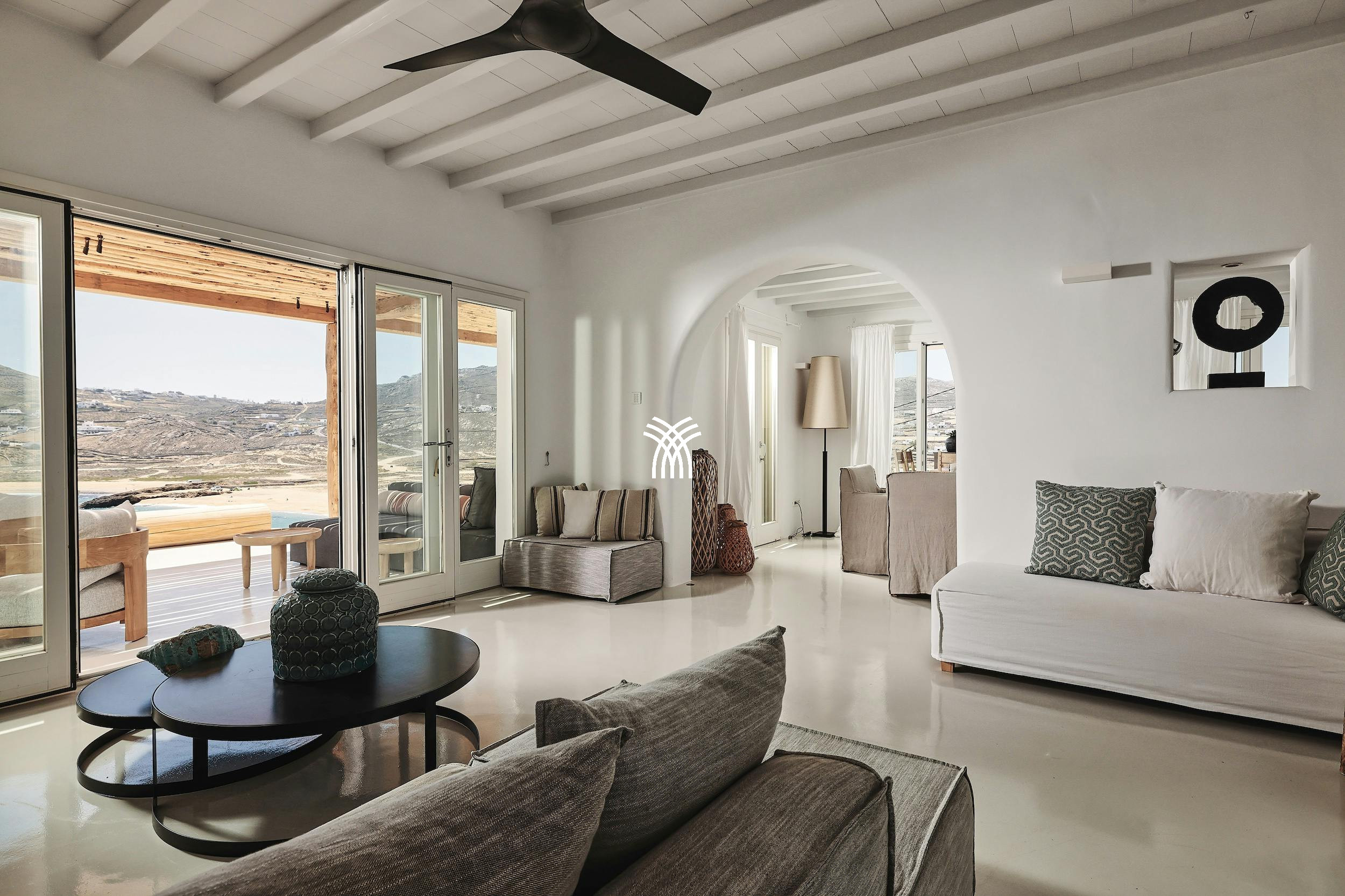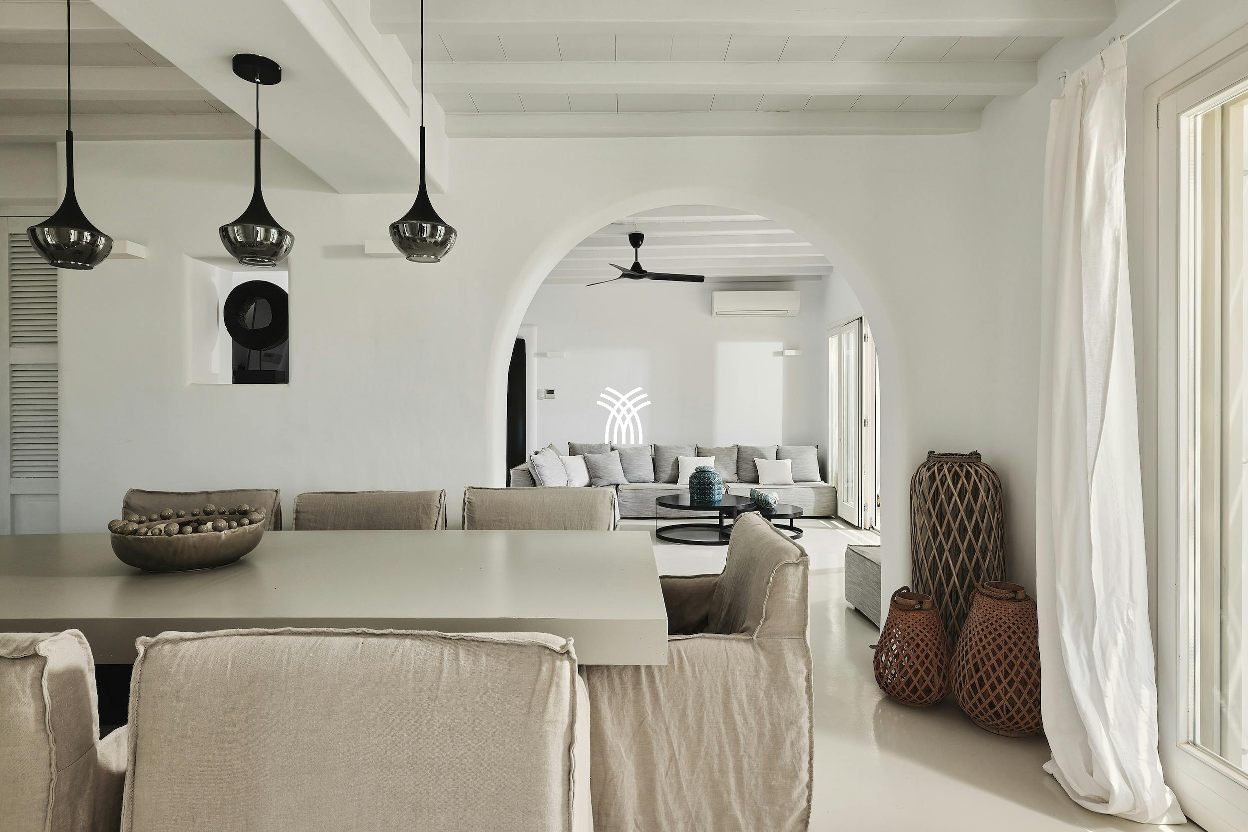À l'intérieur, la villa est un havre de style insulaire contemporain. Des murs blanchis à la chaux, des gris doux et des tons de taupe naturels créent une ambiance sereine, tandis que des fenêtres panoramiques encadrent les vues éblouissantes sur la mer. L'espace de vie ouvert comprend une cuisine moderne, une salle à manger intérieure et un salon décontracté qui s'ouvre directement sur la terrasse.