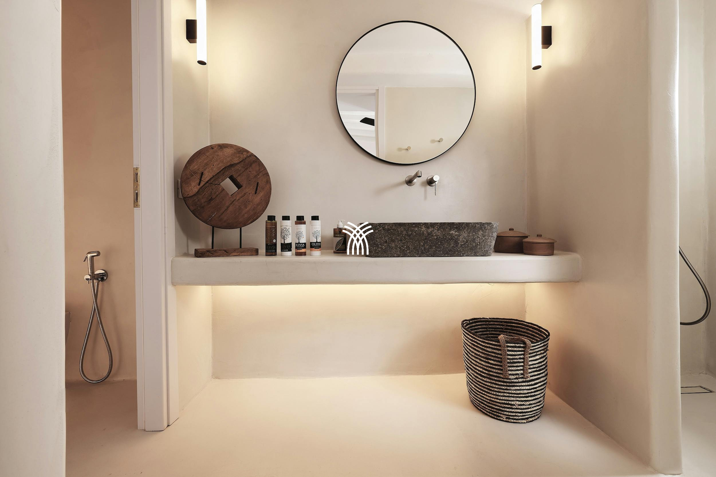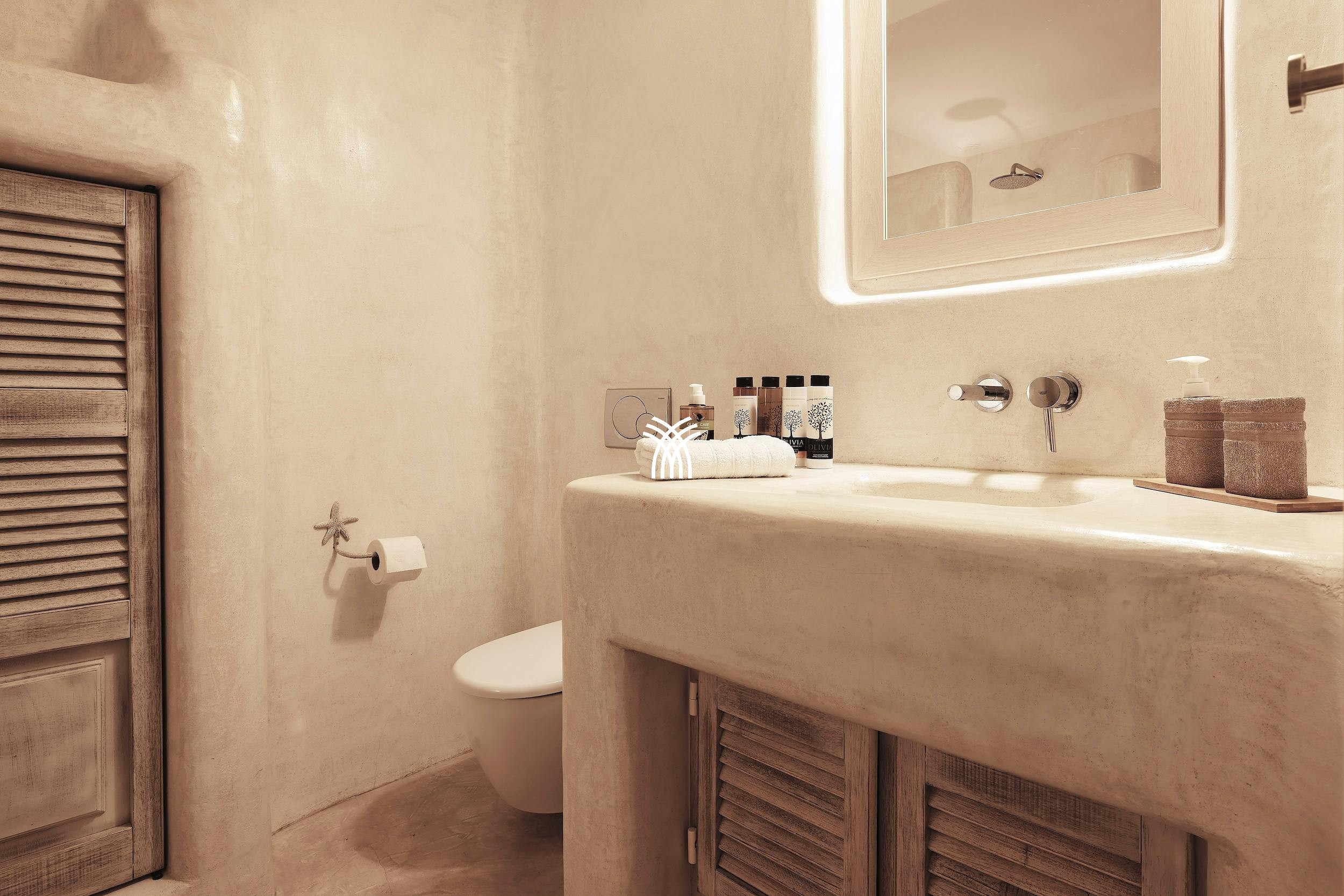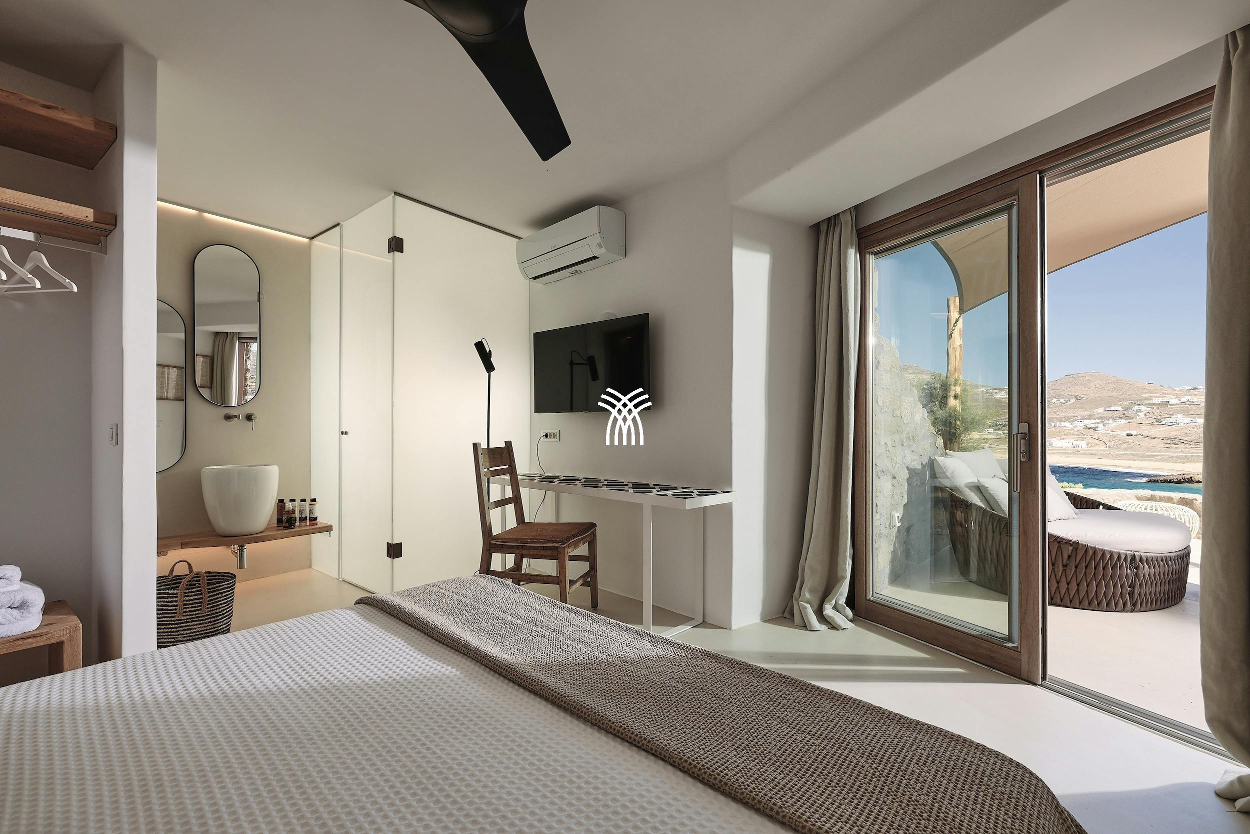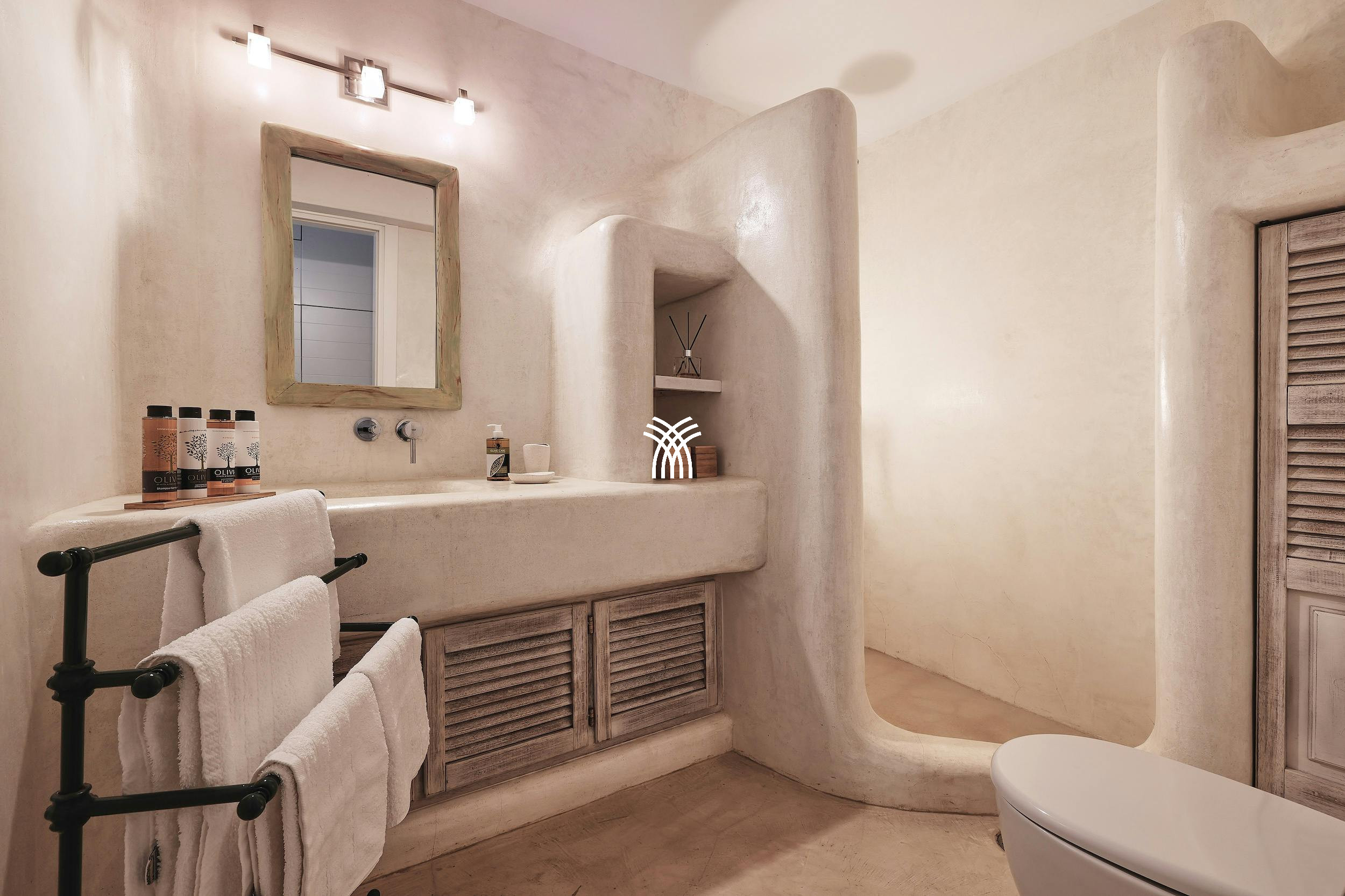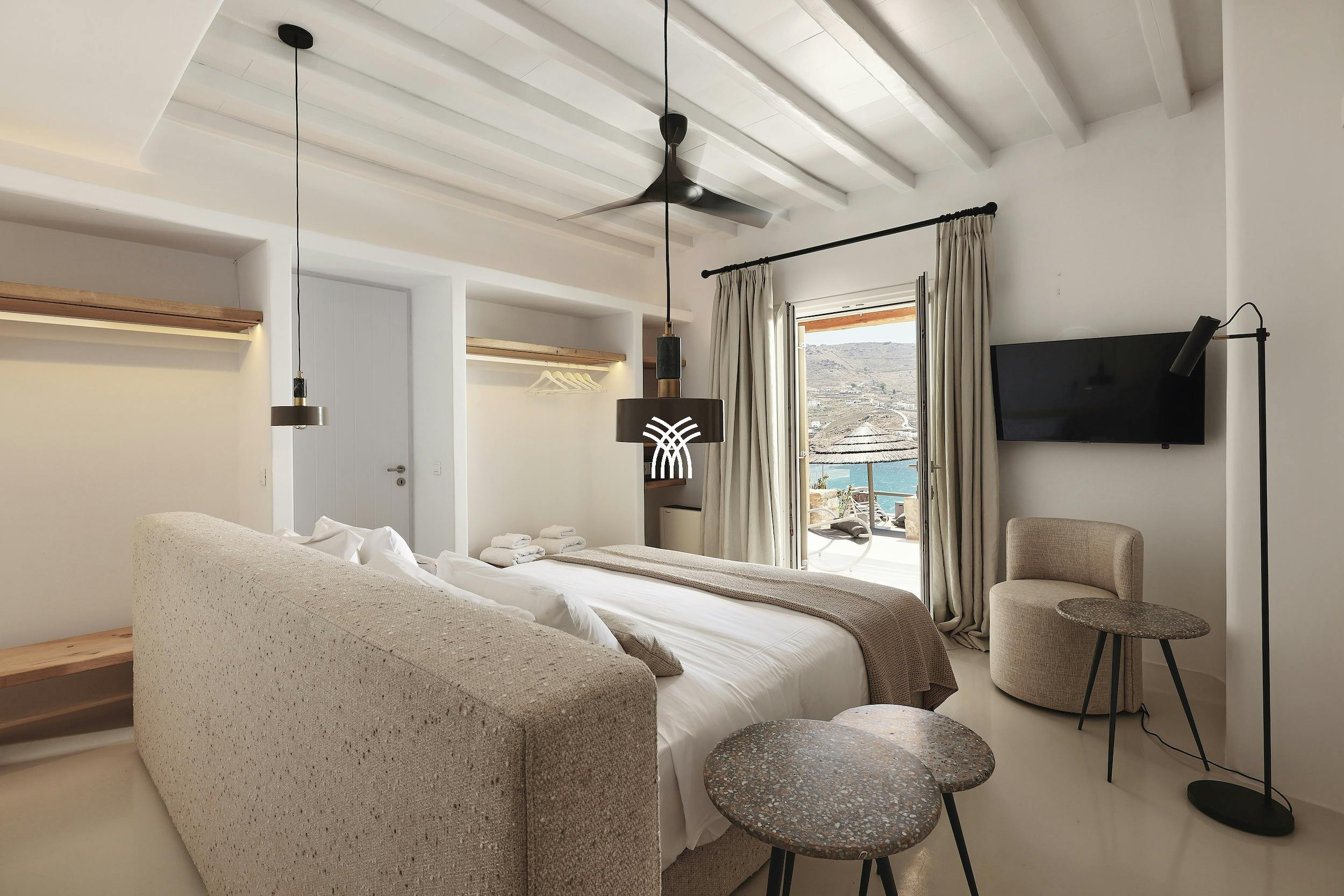 À l'intérieur, la villa est un havre de style insulaire contemporain. Des murs blanchis à la chaux, des gris doux et des tons de taupe naturels créent une ambiance sereine, tandis que des fenêtres panoramiques encadrent les vues éblouissantes sur la mer. L'espace de vie ouvert comprend une cuisine moderne, une salle à manger intérieure et un salon décontracté qui s'ouvre directement sur la terrasse.