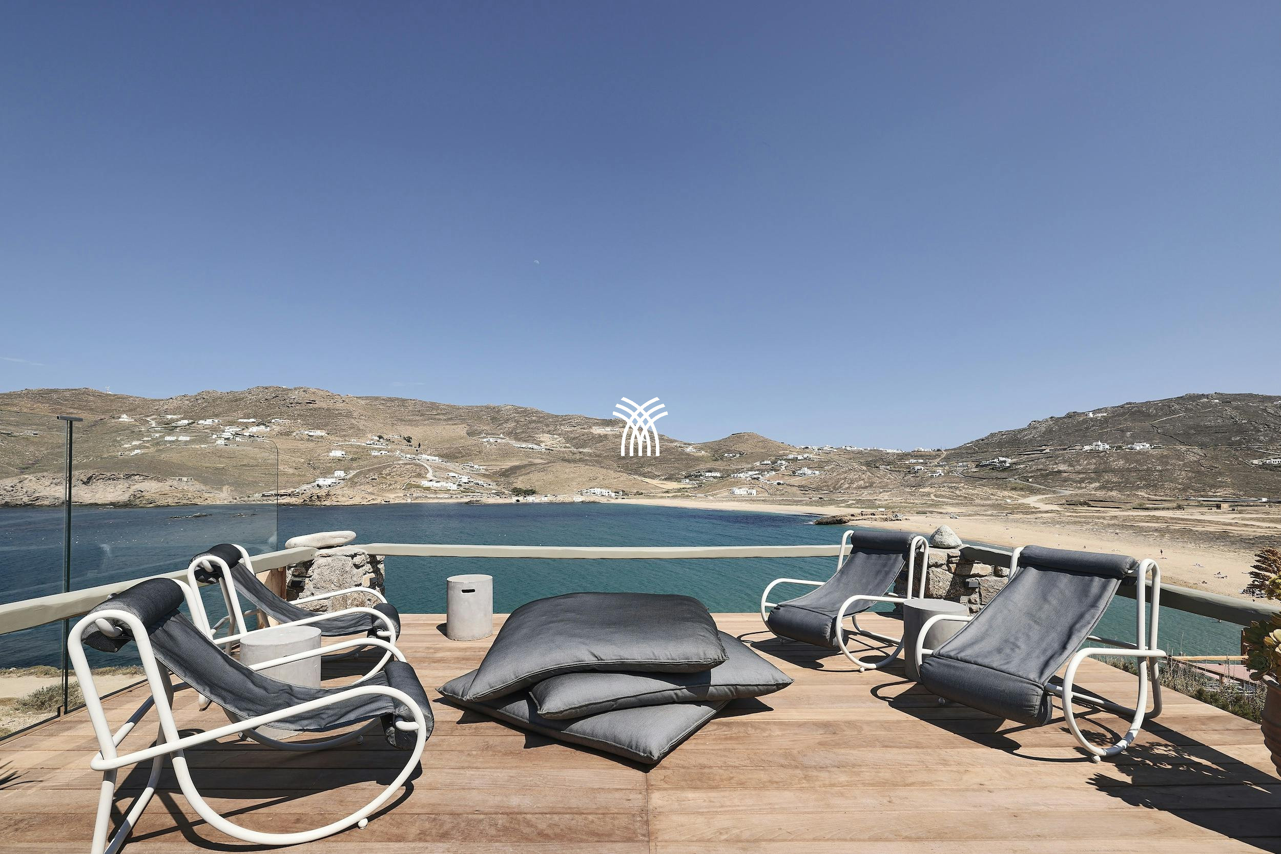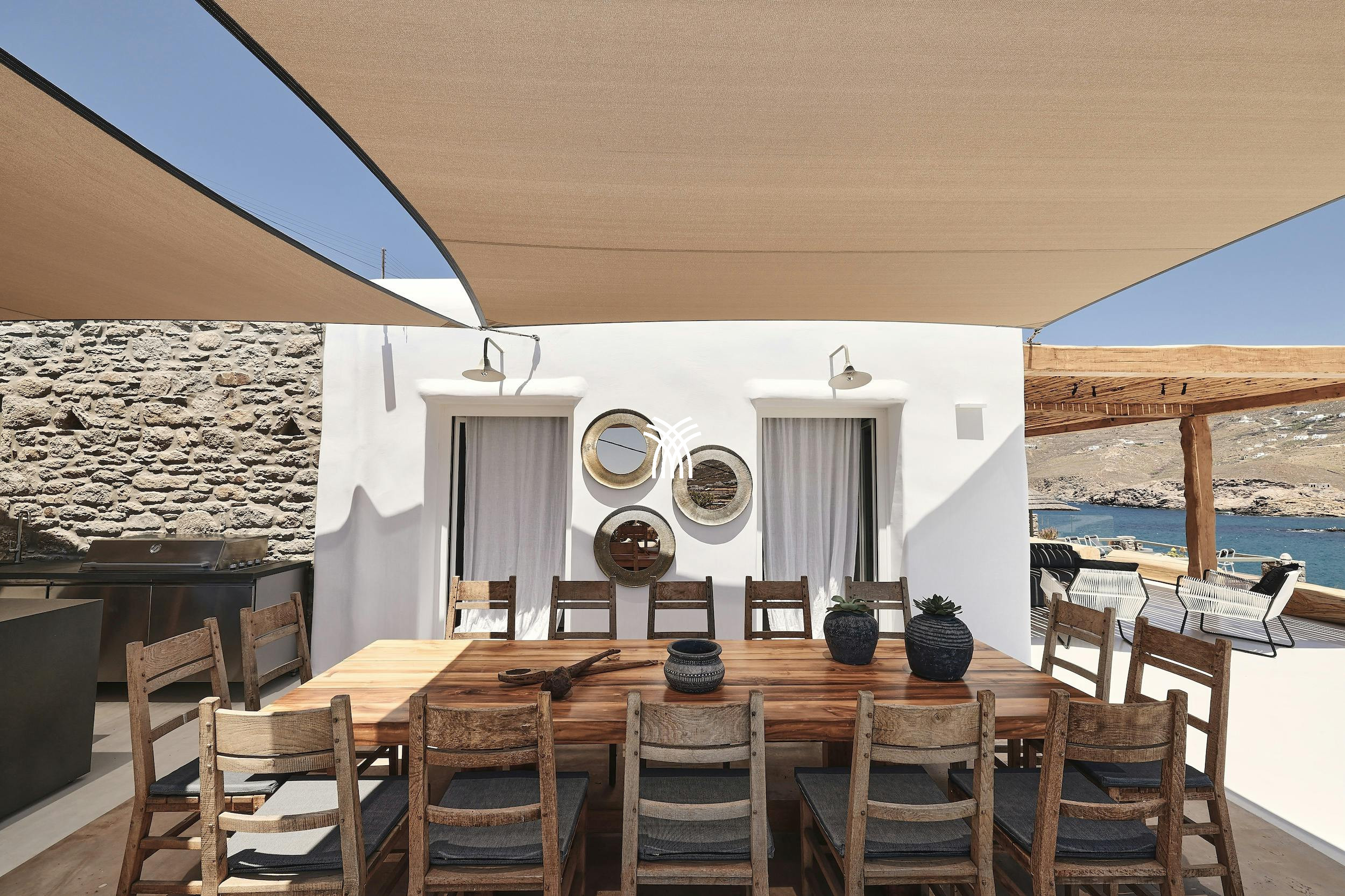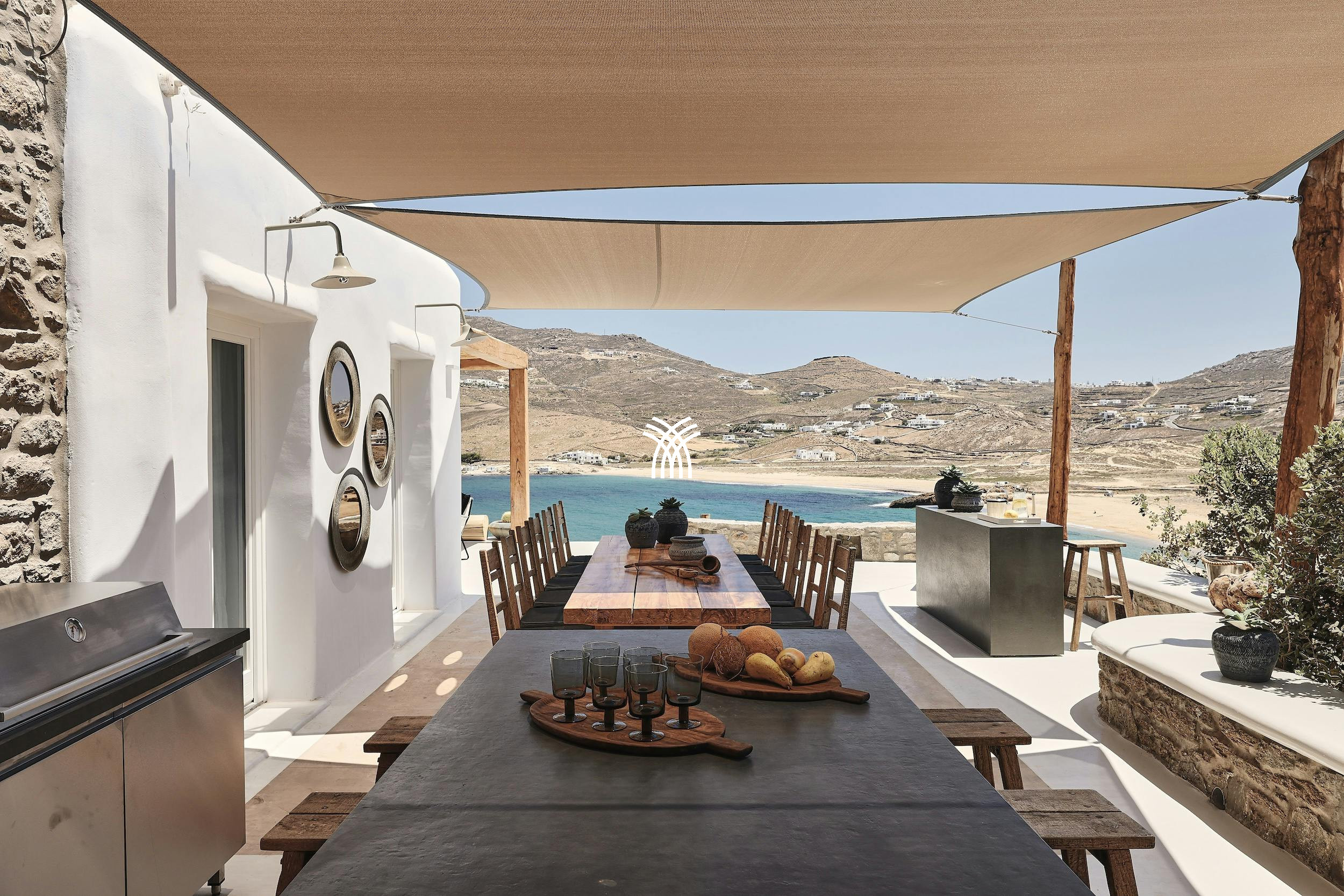 La terrasse supérieure met en valeur l'architecture traditionnelle mykonienne avec des cubes blancs épurés et des espaces de vie extérieurs élégants. Une pergola ombragée de bambou couvre un espace salon élégant, comprenant une cuisine d'été, un barbecue, une aire de repas en plein air et une salle de gym privée—le tout sur fond de la vue imprenable sur la baie de Ftelia. Le système audio extérieur améliore l'expérience, créant le cadre parfait pour des rassemblements inoubliables.