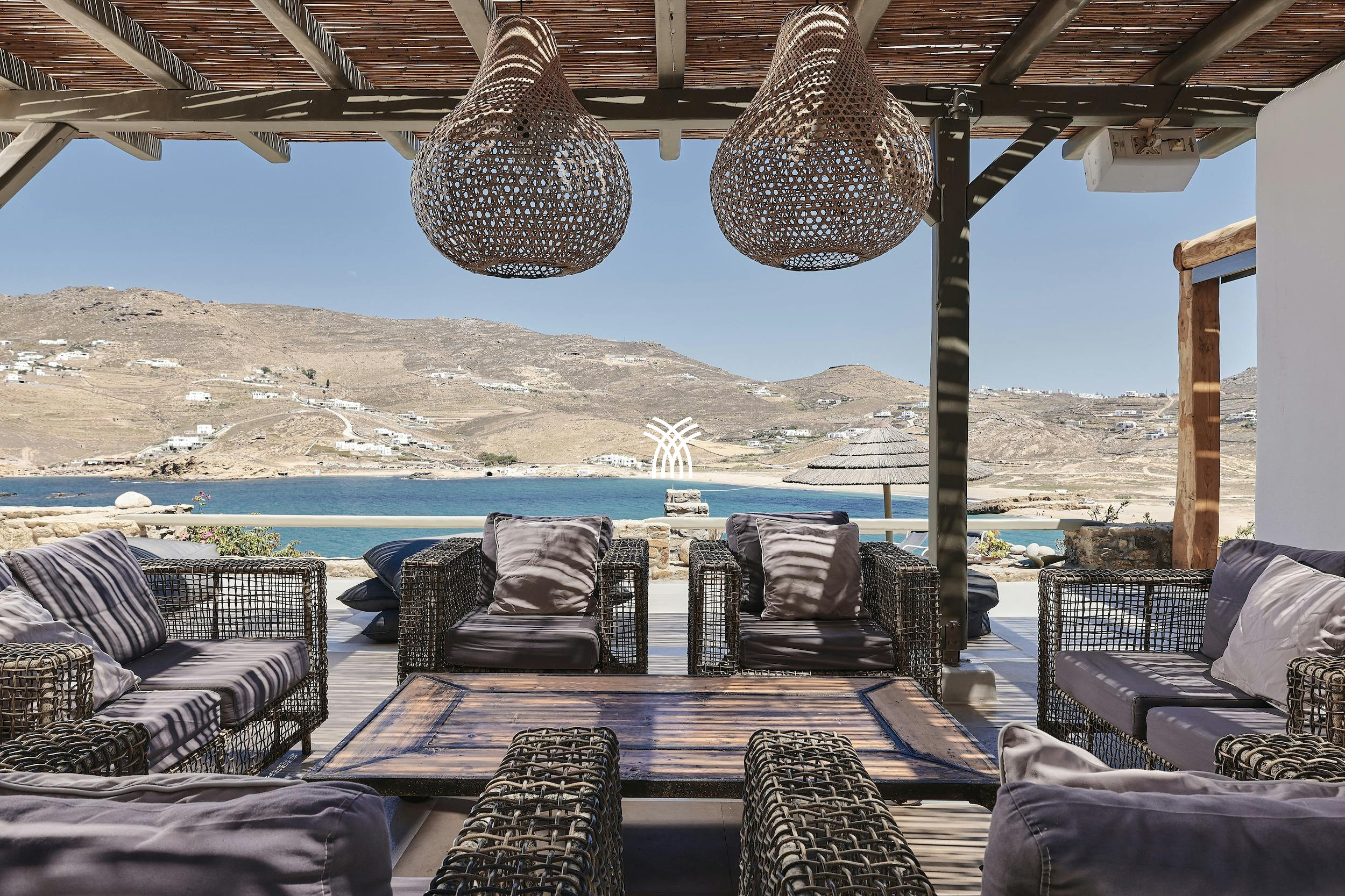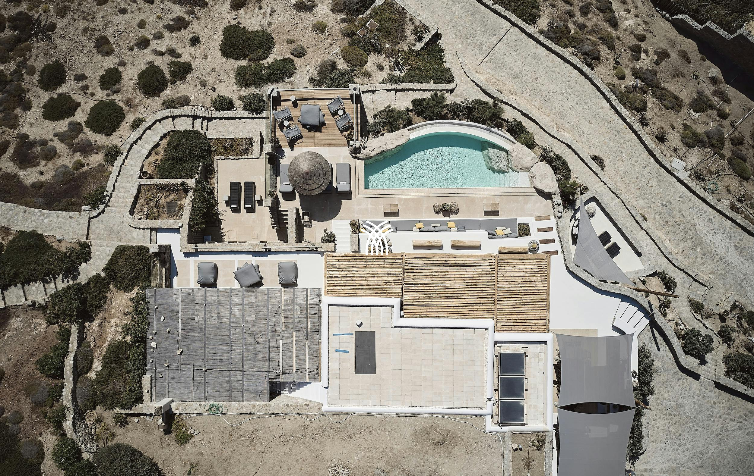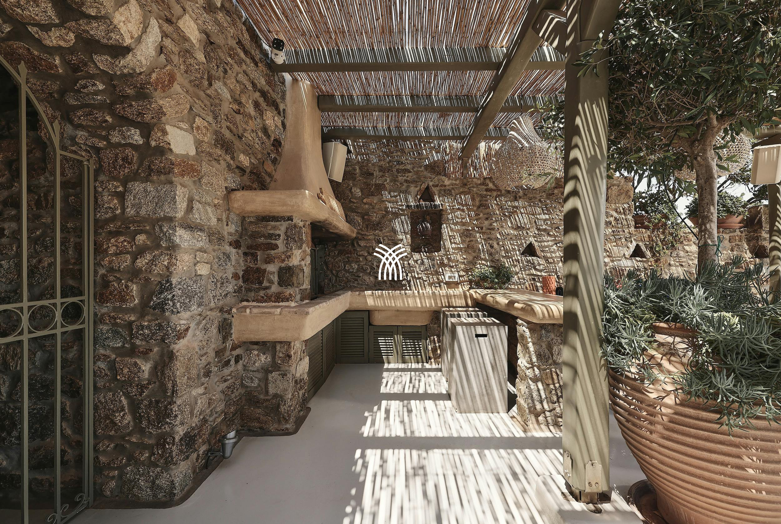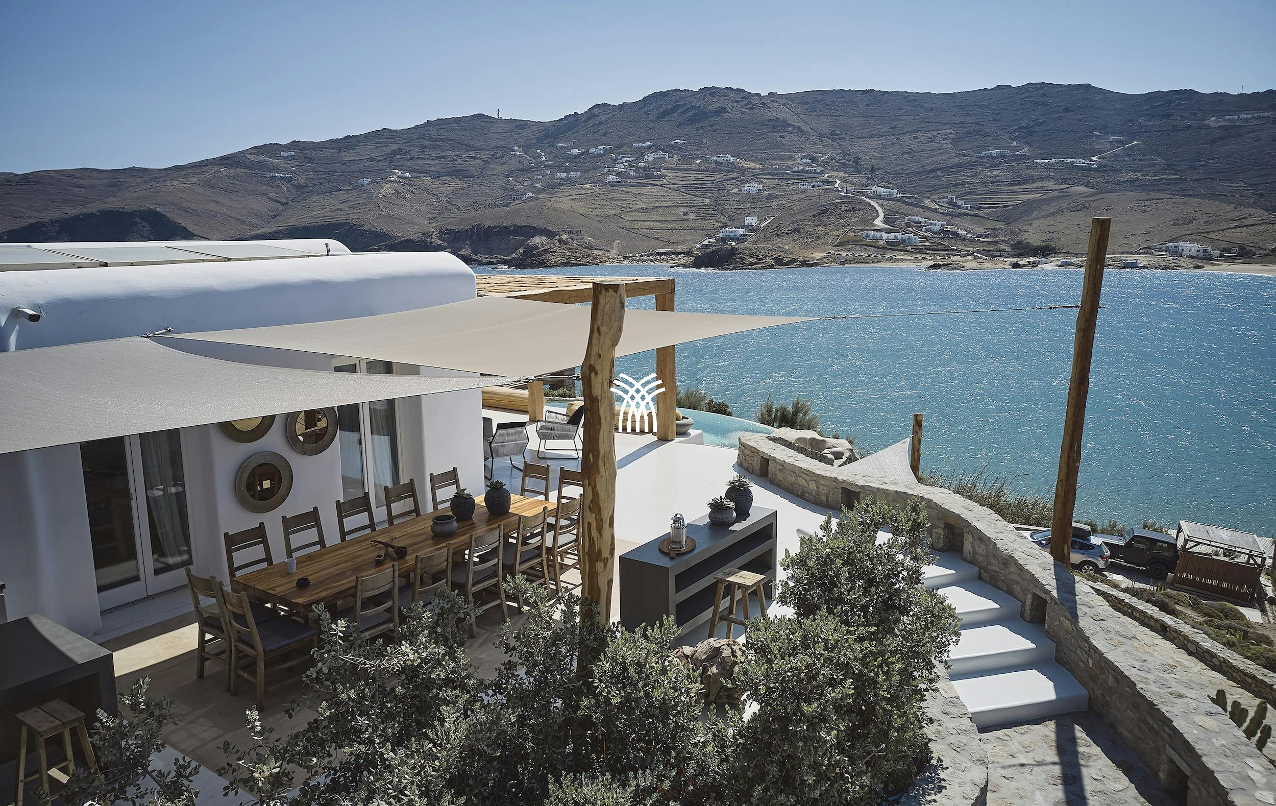 La terrasse supérieure met en valeur l'architecture traditionnelle mykonienne avec des cubes blancs épurés et des espaces de vie extérieurs élégants. Une pergola ombragée de bambou couvre un espace salon élégant, comprenant une cuisine d'été, un barbecue, une aire de repas en plein air et une salle de gym privée—le tout sur fond de la vue imprenable sur la baie de Ftelia. Le système audio extérieur améliore l'expérience, créant le cadre parfait pour des rassemblements inoubliables.