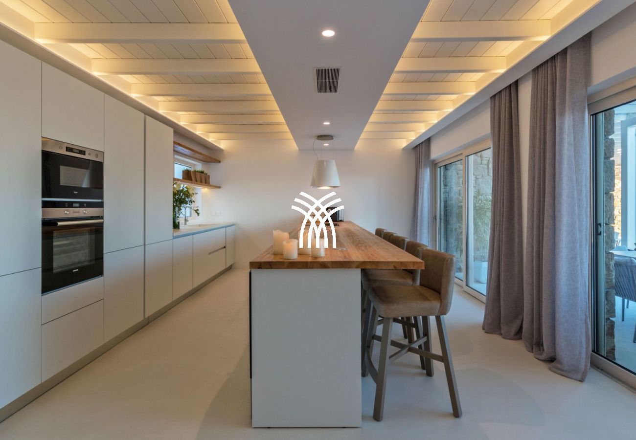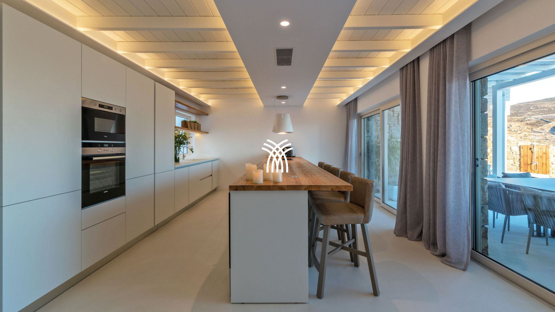 À l'intérieur, la villa dispose d'un salon spacieux avec des sièges moelleux et des vues spectaculaires sur la piscine et la mer Égée. La cuisine entièrement équipée répond à tous vos désirs culinaires, complétée par une zone de buanderie et de rangement séparée pour plus de commodité.
