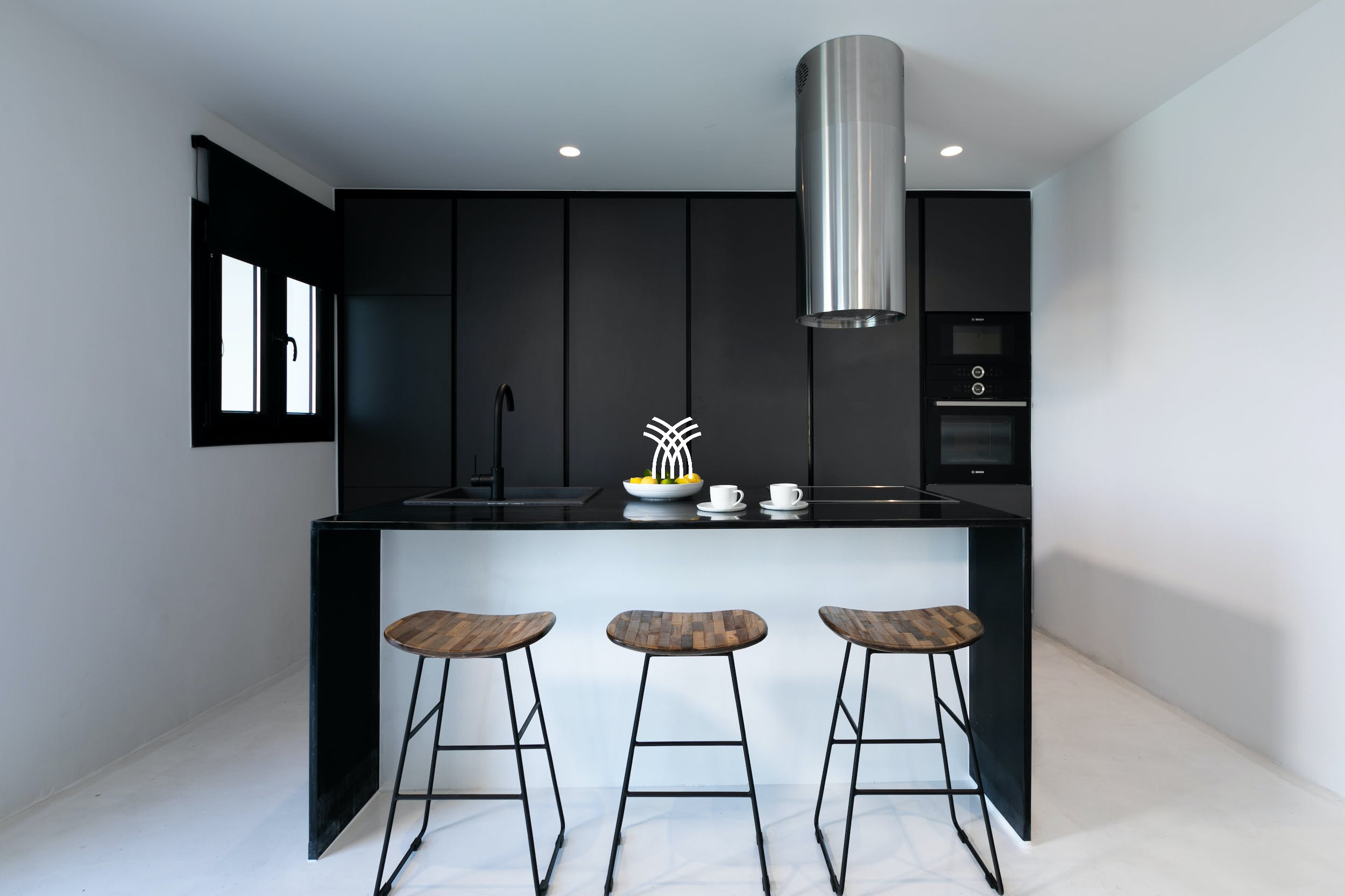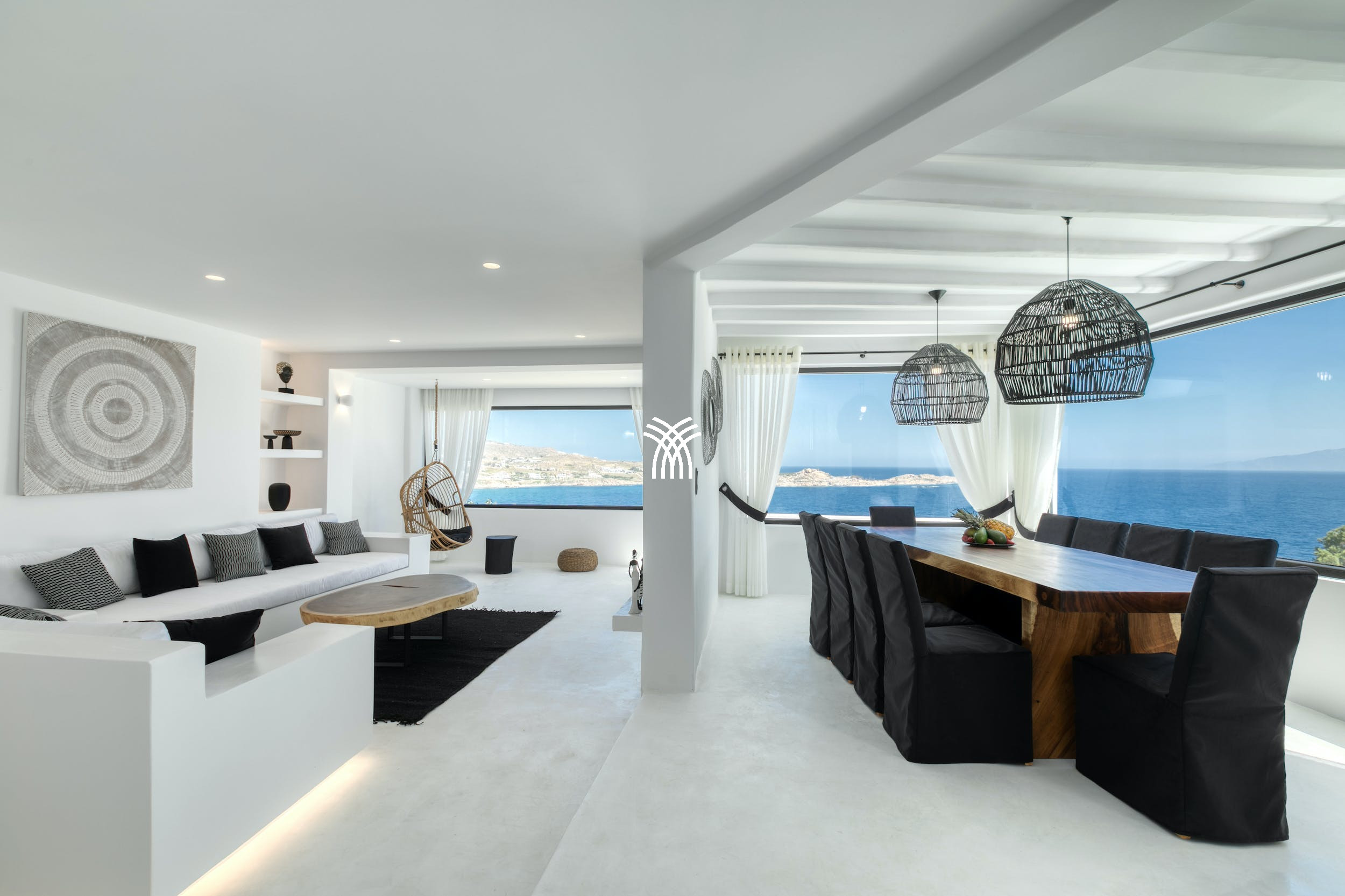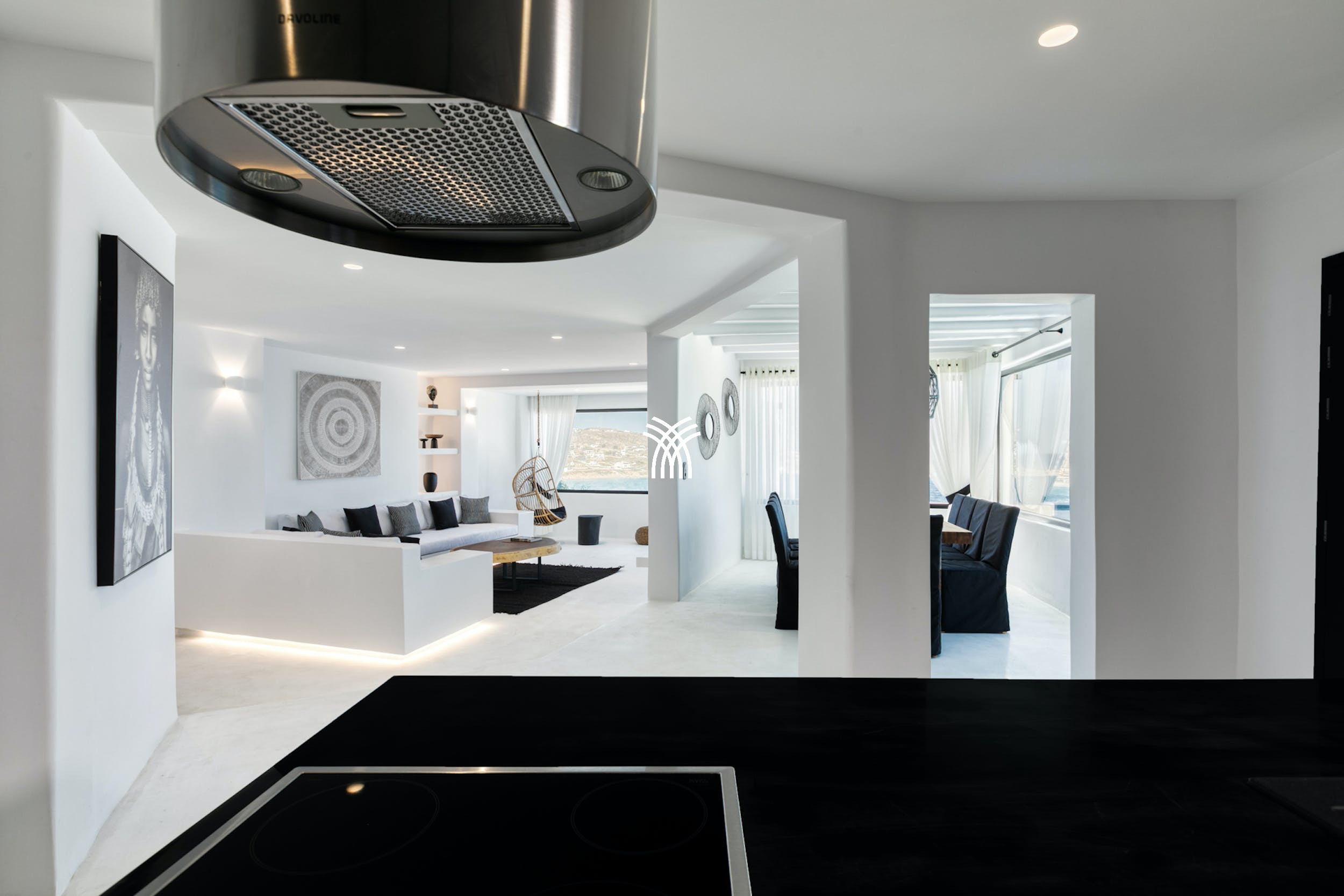 À l'intérieur, la villa dispose d'un salon spacieux avec des sièges moelleux et des vues spectaculaires sur la piscine et la mer Égée. La cuisine entièrement équipée répond à tous vos désirs culinaires, complétée par une zone de buanderie et de rangement séparée pour plus de commodité.