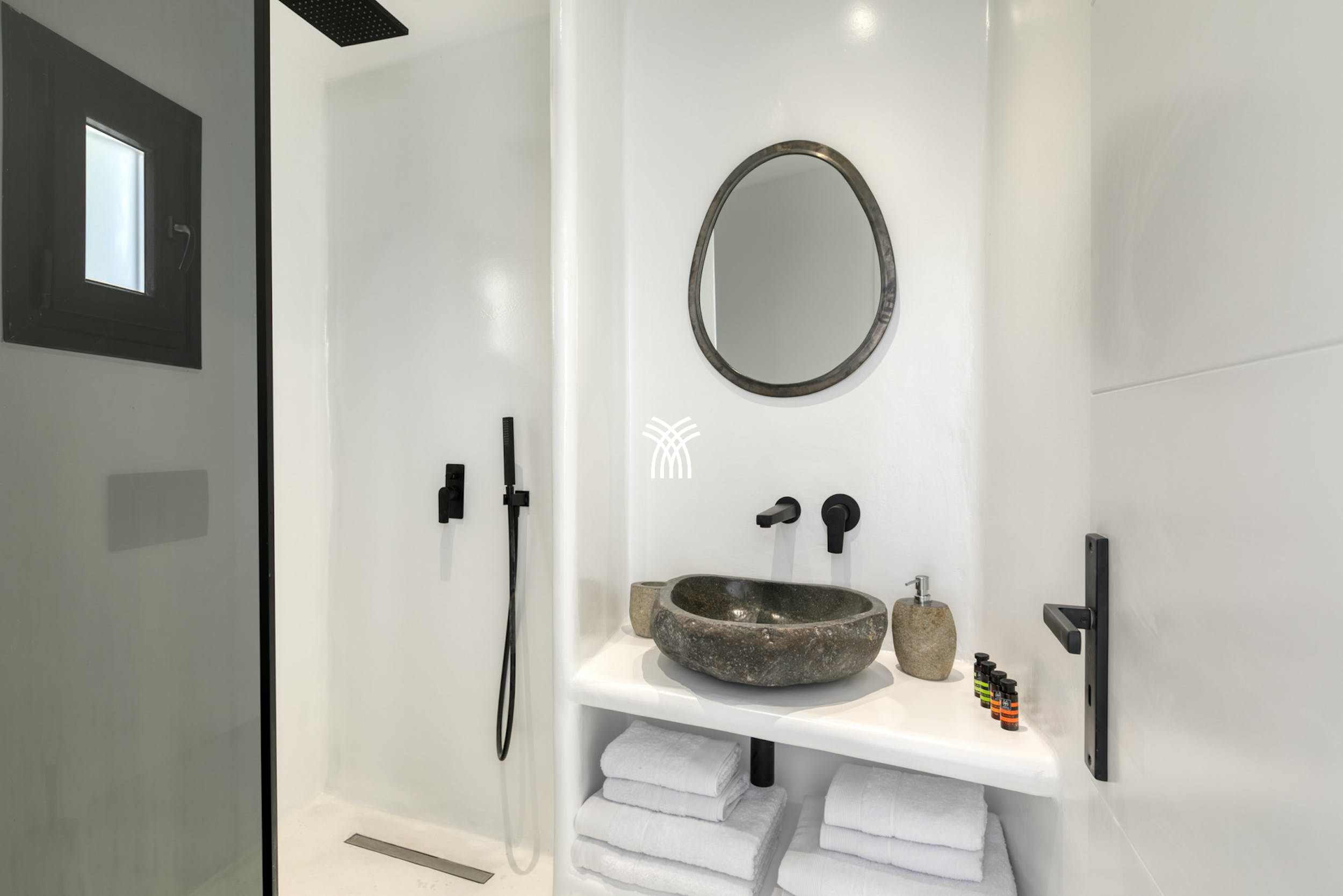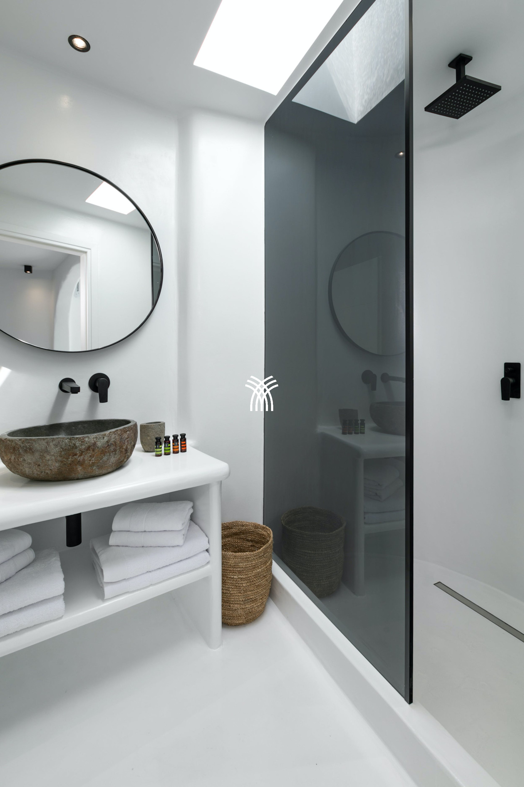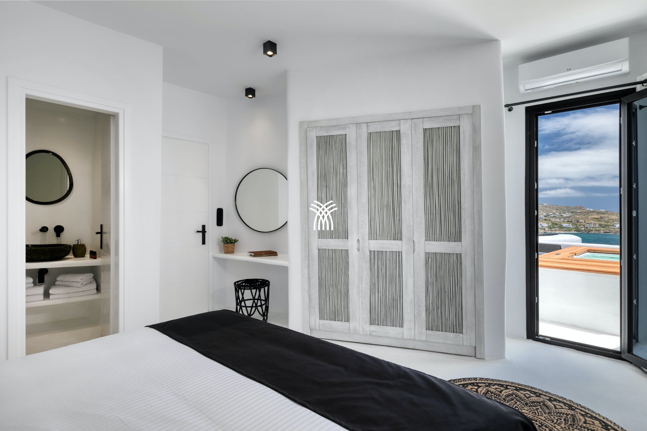 L’espace extérieur est une véritable oasis, conçu pour des moments de pure détente sous le soleil des Cyclades. Profitez d’une piscine privée surplombant la mer, détendez-vous sur les lits de repos en plein air, partagez un repas sous les étoiles dans l’espace dîner en terrasse, ou laissez-vous envelopper par les bulles de l’outdoor jacuzzi en contemplant l’horizon.