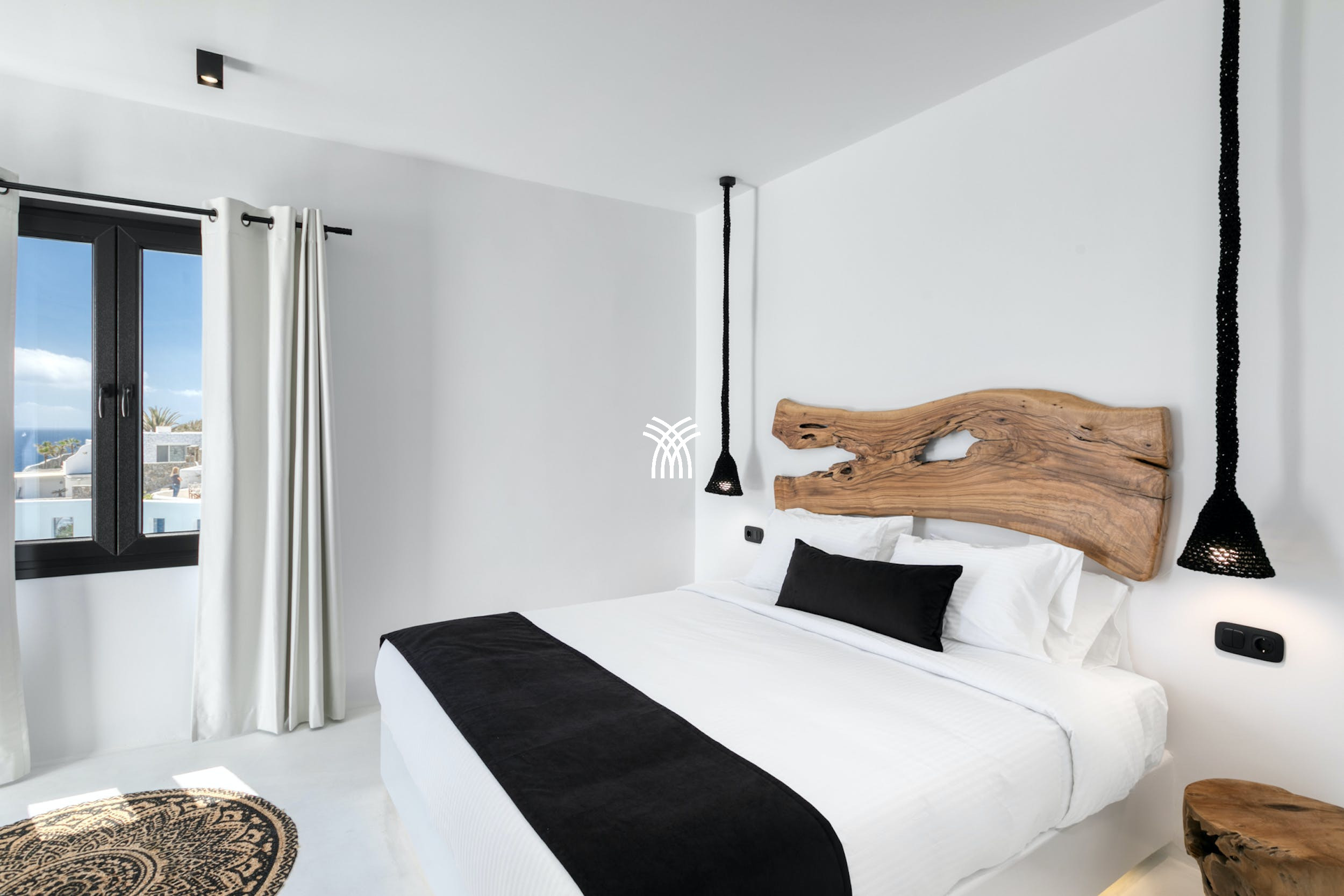 À l’intérieur, le charme de l’architecture cycladique s’harmonise parfaitement avec des touches contemporaines. Les cinq chambres en-suite offrent un confort absolu avec lits king-size, terrasses privatives avec vue mer, télévisions et salles de bains élégantes. La villa dispose également d’un vaste salon baigné de lumière, d’un coin repas pouvant accueillir 10 convives et d’une cuisine entièrement équipée, idéale pour des moments conviviaux.